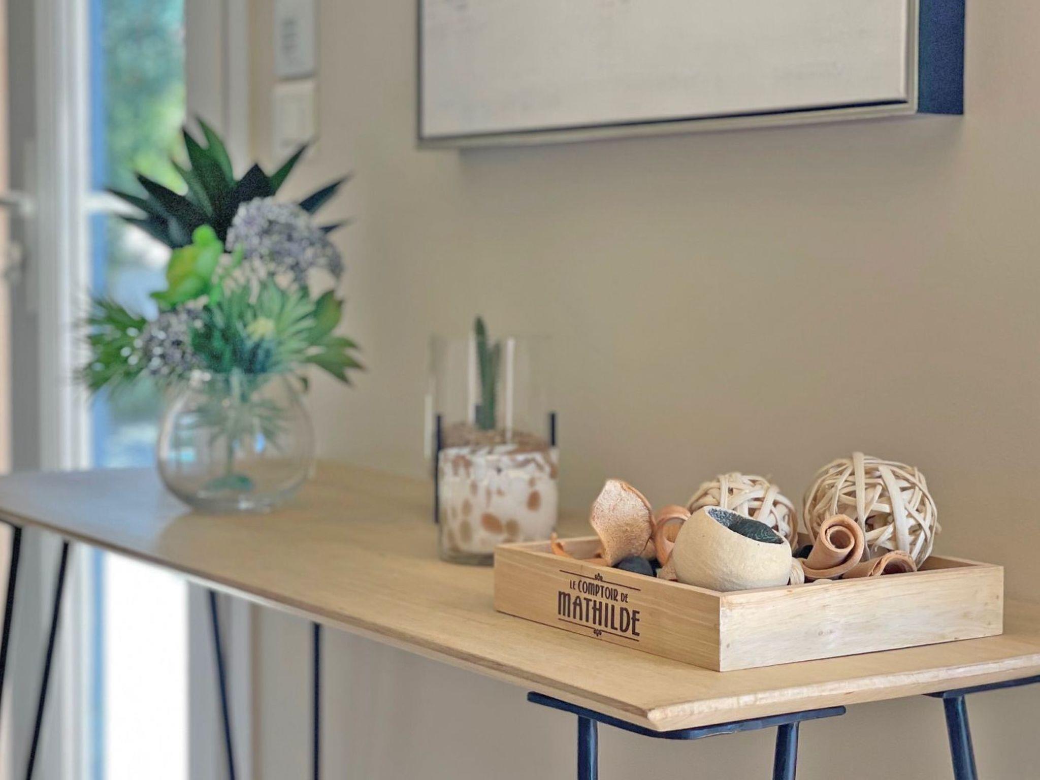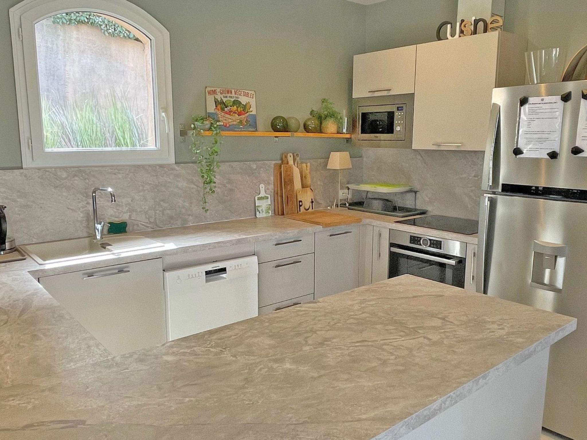 - Beautiful air-conditioned living room with access to the outside, divided into 3 areas: lounge with 2 sofas that can accommodate all the guests, large TV screen, dining area for 8 people and the very well equipped open-plan kitchen (fridge, freezer, hob, extractor fan, dishwasher, oven, microwave, various crockery)