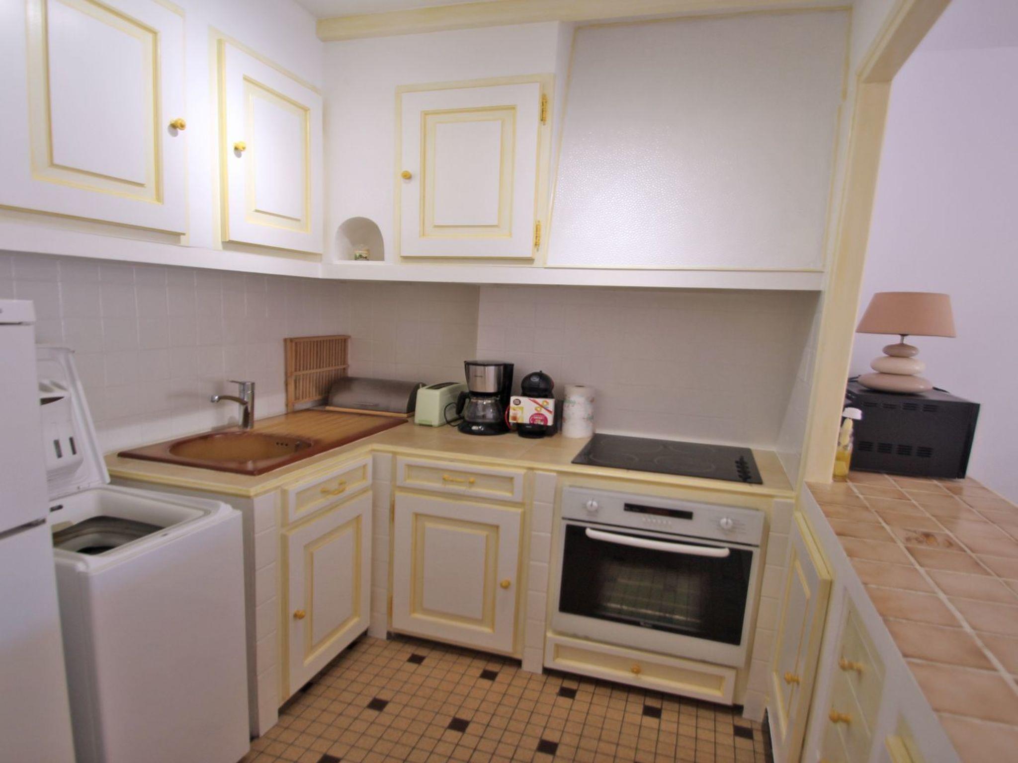 - Semi-open, fully-equipped kitchen with fridge/freezer, microwave, oven, washing machine, coffee maker, 4-burner hob, etc.