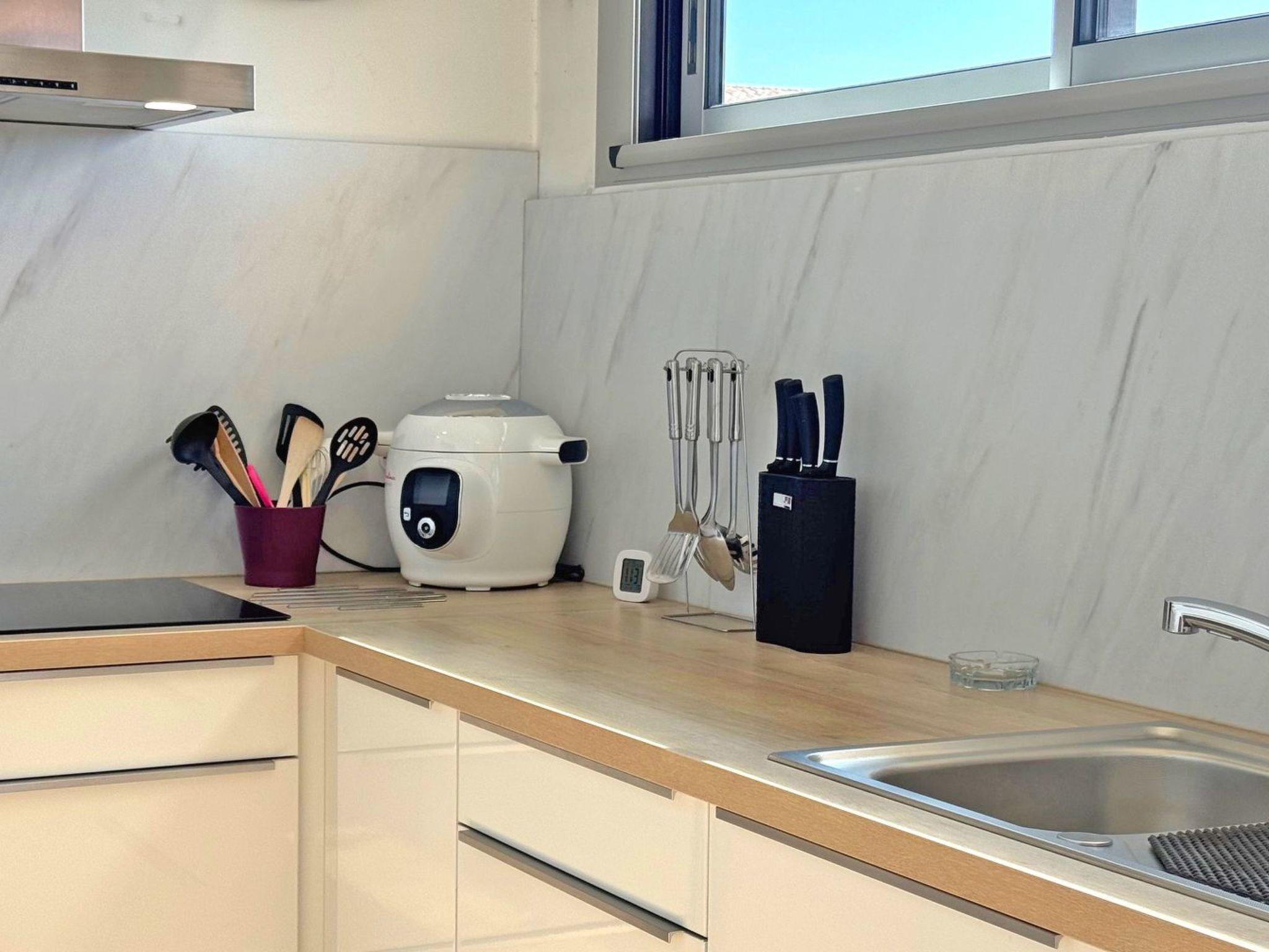 - Separate kitchen with fridge, freezer, oven, kettle, washing machine, dishwasher, coffee maker, 4-burner electric hob, crockery and cutlery.