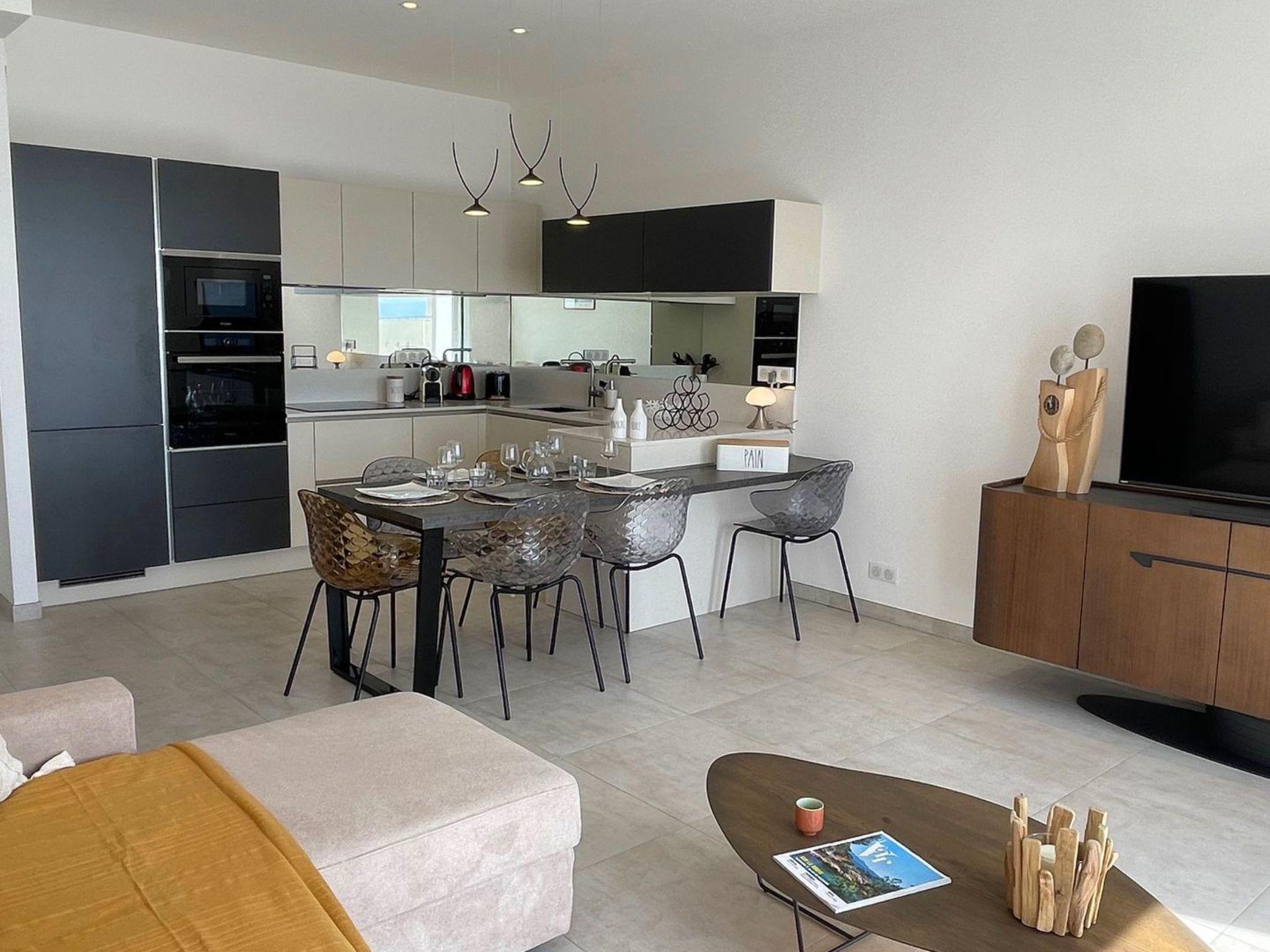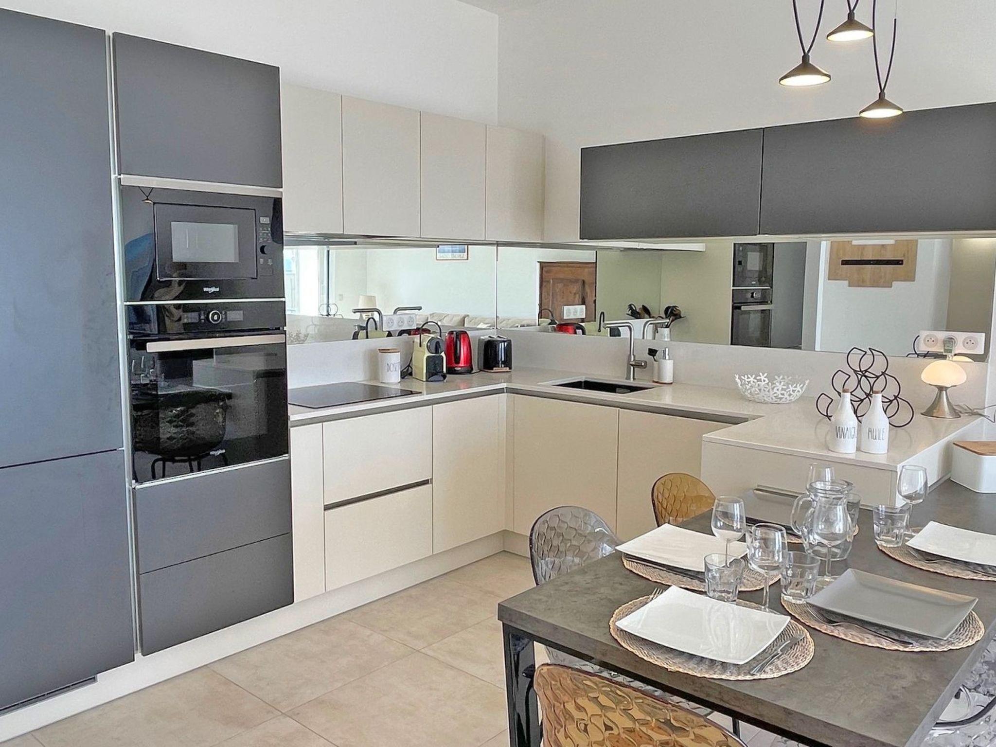 - Air-conditioned living room with sitting area: sofa bed (1 person), television, access to terrace and open-plan kitchen: fridge, freezer, oven, microwave, Nespresso coffee machine, dishwasher, kettle, toaster, crockery and cutlery, table and chairs for 5 guests.