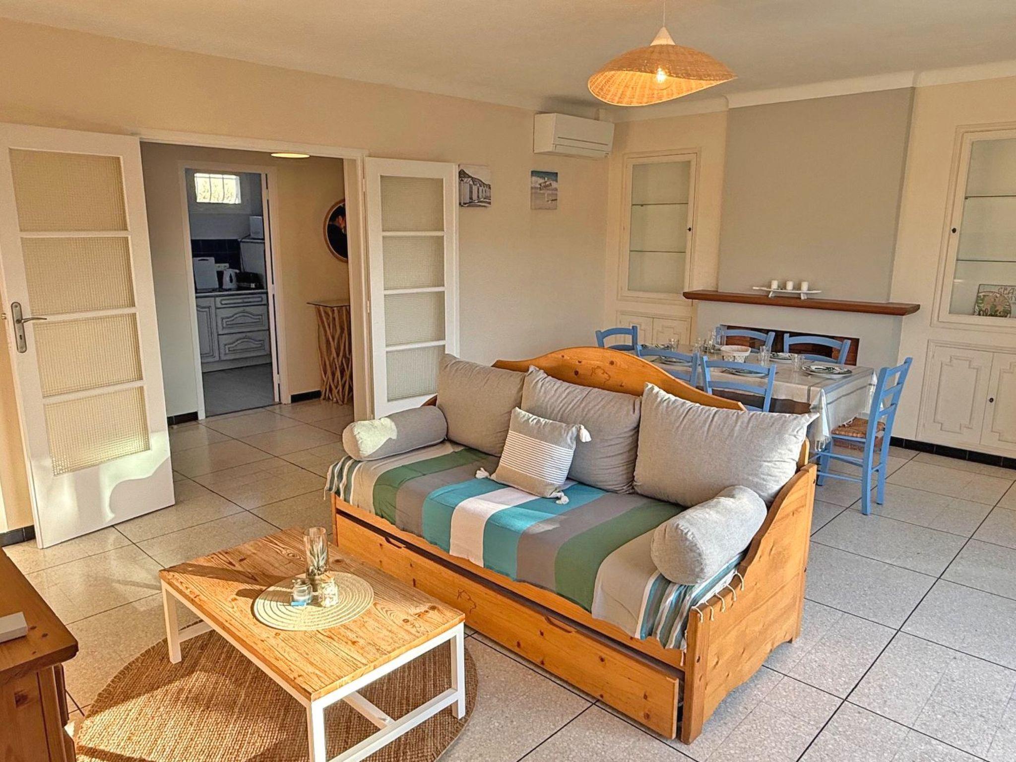 - Air-conditioned living room with dining area for 6 people, pull-out sofa bed (2x80 or 160) and television. Direct access to private terrace.