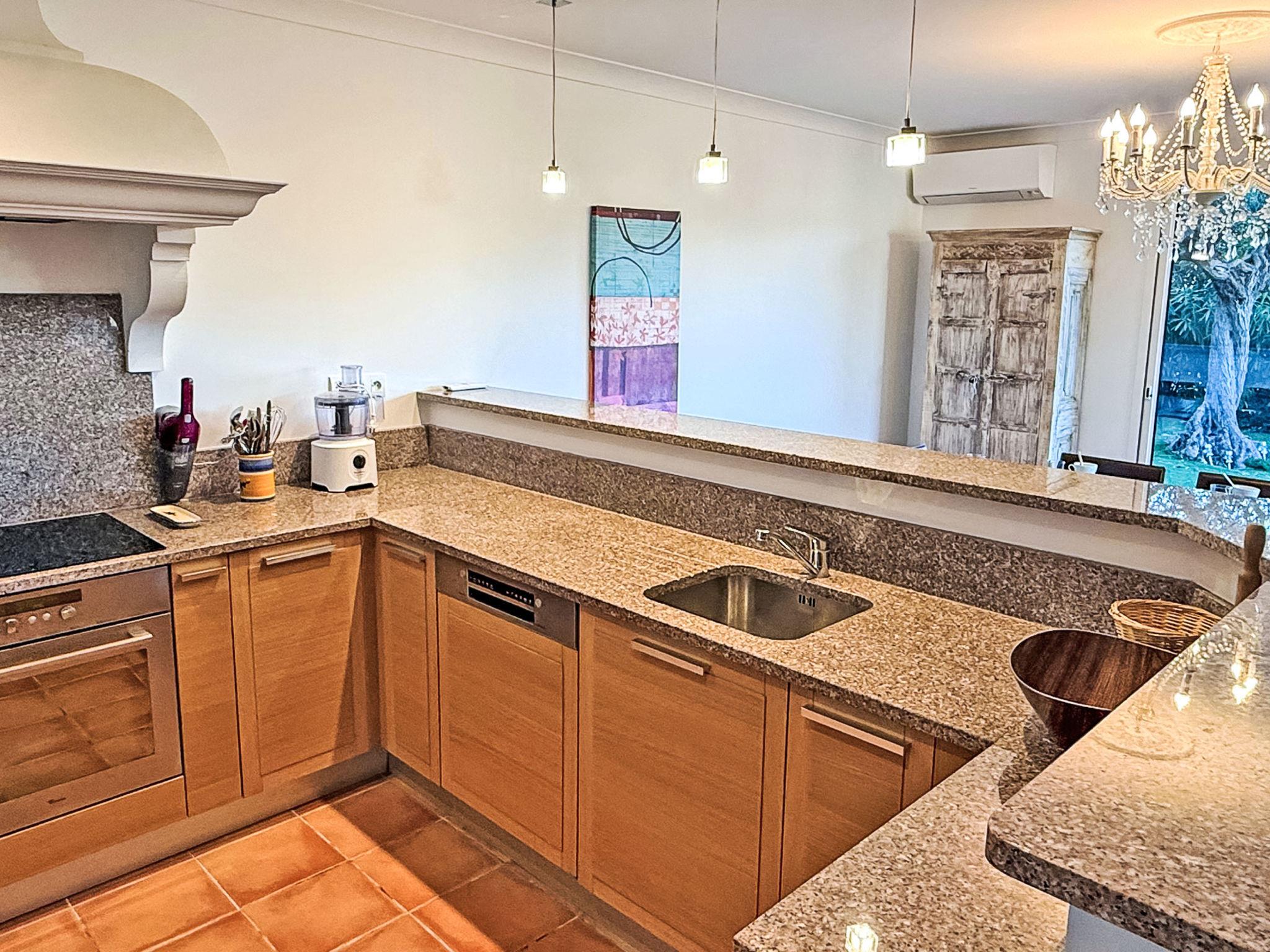 - Fully-equipped open-plan kitchen with sink, 4-burner ceramic hob, oven, microwave, coffee machine, American fridge, dishwasher, crockery, etc.