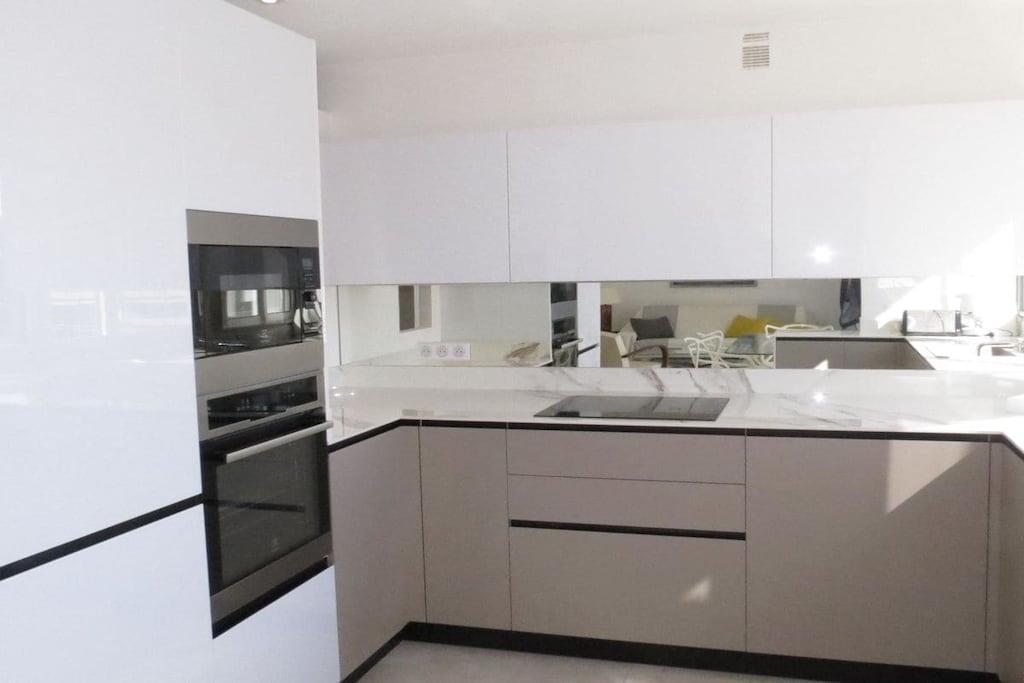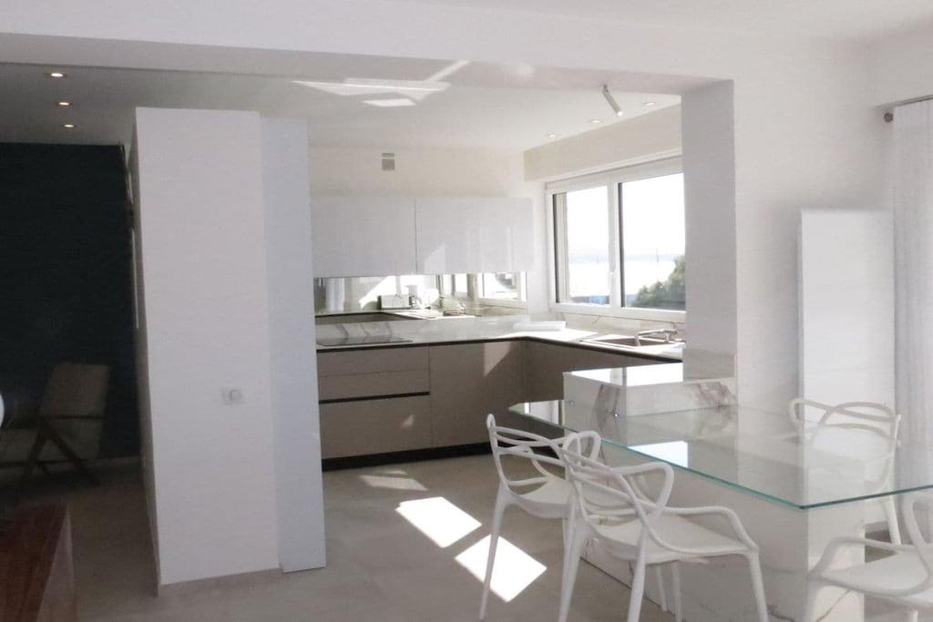 The property measures 75 m² and has an elevator. There's a terrace with garden furniture where you can enjoy the sea and beautiful scenery with a cup of coffee. There's a living room with a dining table, TV, and sofa, as well as access to the terrace. The open-plan kitchen is fully equipped with an induction stove, oven, and refrigerator, as well as a dishwasher and washing machine. Two double bedrooms are also part of the property, as well as a bathroom with a shower.