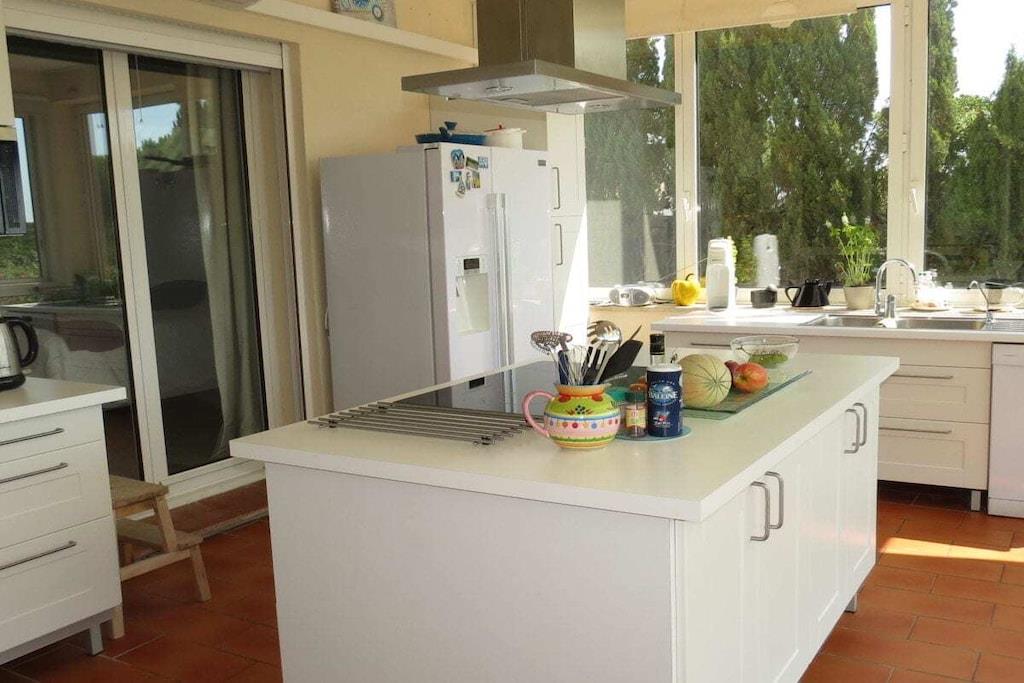 The garden, with a pool and garden furniture, covers an area of 1200 m². Indoors, there is a living room with a TV and sofa, as well as a dining room where you can enjoy a cozy meal together. The kitchen has an island and is equipped with everything you need for a stay (dishwasher, refrigerator, stove). There are also three bedrooms with three double beds. In the basement, there is another bedroom with a double bed, as well as a laundry room and a second kitchen. The terrace with garden furniture invites you to linger. For your convenience, Wi-Fi and a washing machine and dryer are available.