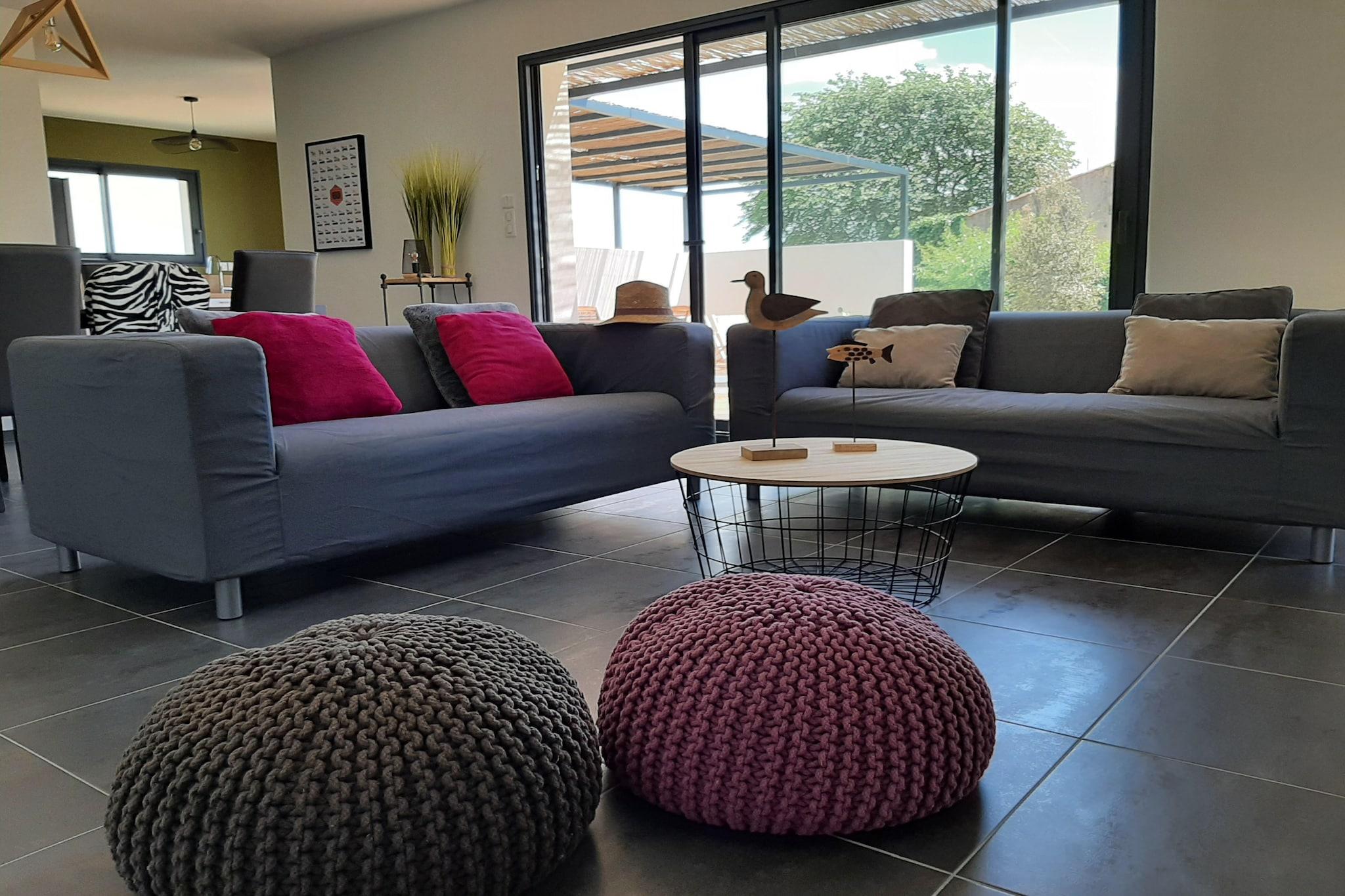 Ground floor: (Living room(TV, dining table, seating area, air conditioning), Kitchen(coffee machine, oven, microwave, dishwasher, fridge-freezer), bedroom(double bed(160 x 200 cm)), bedroom(double bed or 2 single beds), bedroom(double bed or 2 single beds), bathroom(bath tub, shower), toilet) garage, terrace(private, 30 m2), garden, BBQ, swimming pool(private)