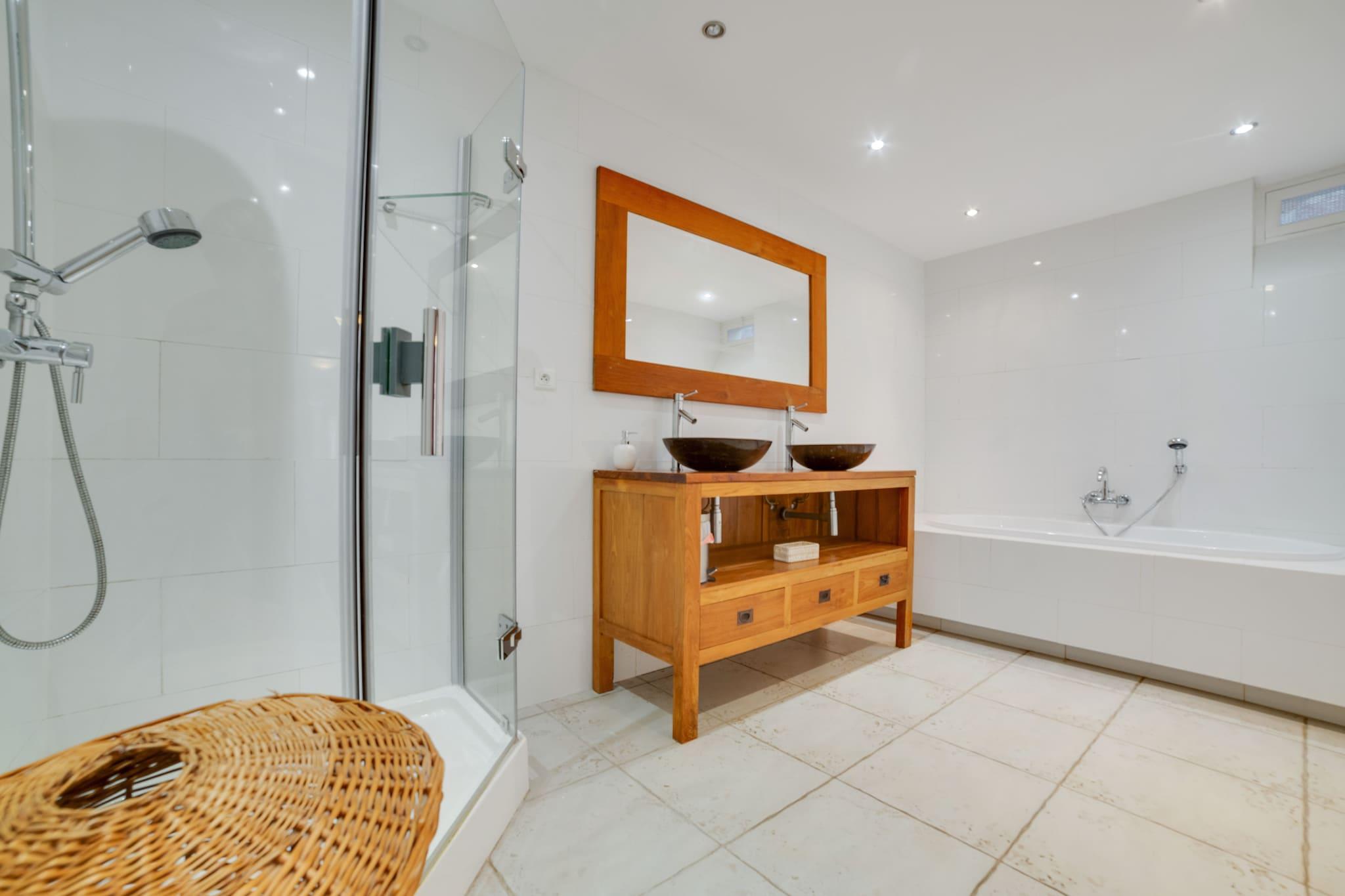 Ground floor: (Living room(TV(dutch television channels, international television channels), dining table, seating area), open kitchen(cooker(induction), hood, oven, microwave, dishwasher, fridge(+ ice machine, american), freezer, washing machine), Bedroom with bathroom(double bed, fireplace, shower, 2x washbasin, air conditioning), toilet) Basement: (bedroom(bunk bed, air conditioning), bedroom(double bed), bedroom(2x single bed), bathroom(shower, 2x washbasin, toilet), bathroom(bath tub, shower, 2x washbasin), toilet) outdoor kitchen, shower, terrace(150 m2), terrace(roofed), garden(> 1000 m2), garden furniture, BBQ, parking, deckchairs, swimming pool(private, 10 x 4 m.), children's bed, high chair, high chair