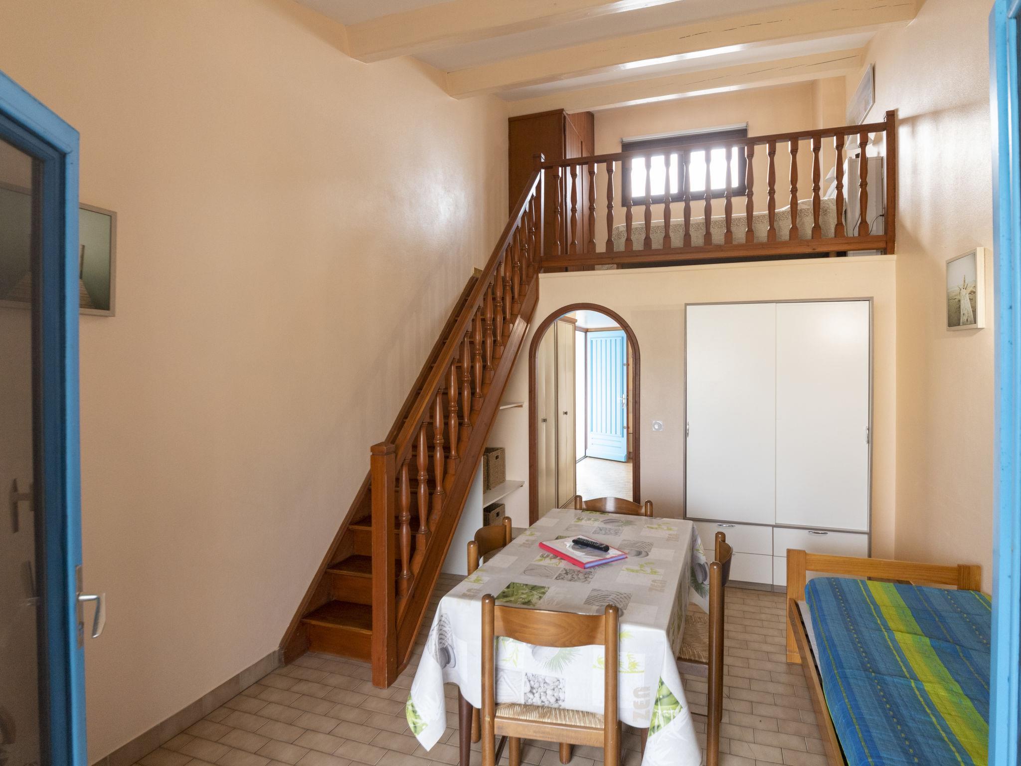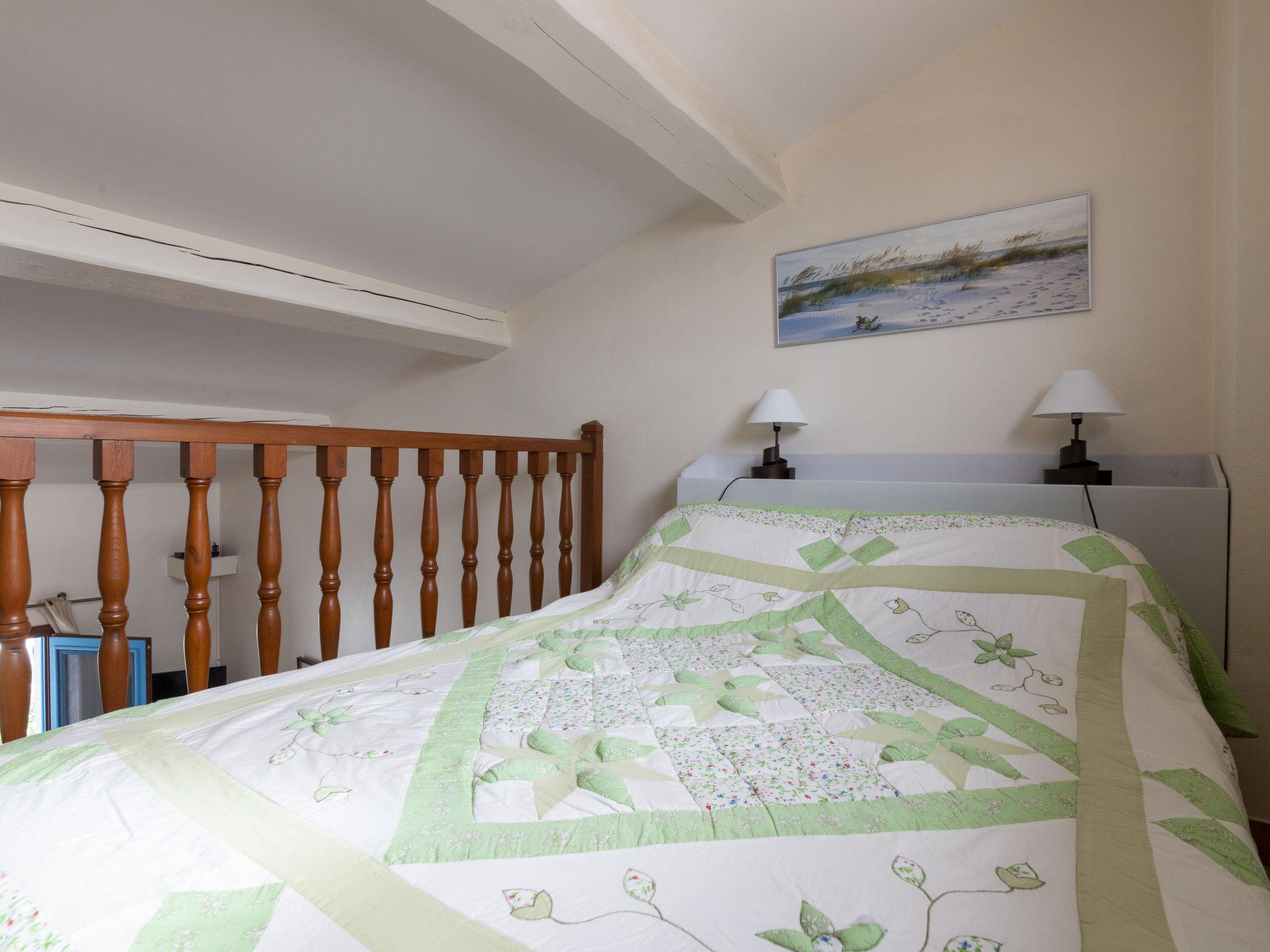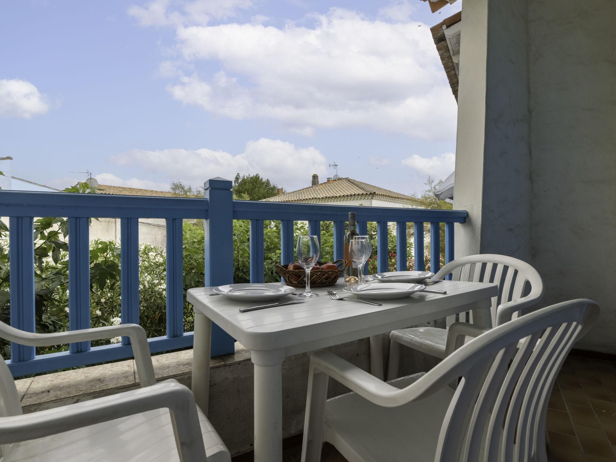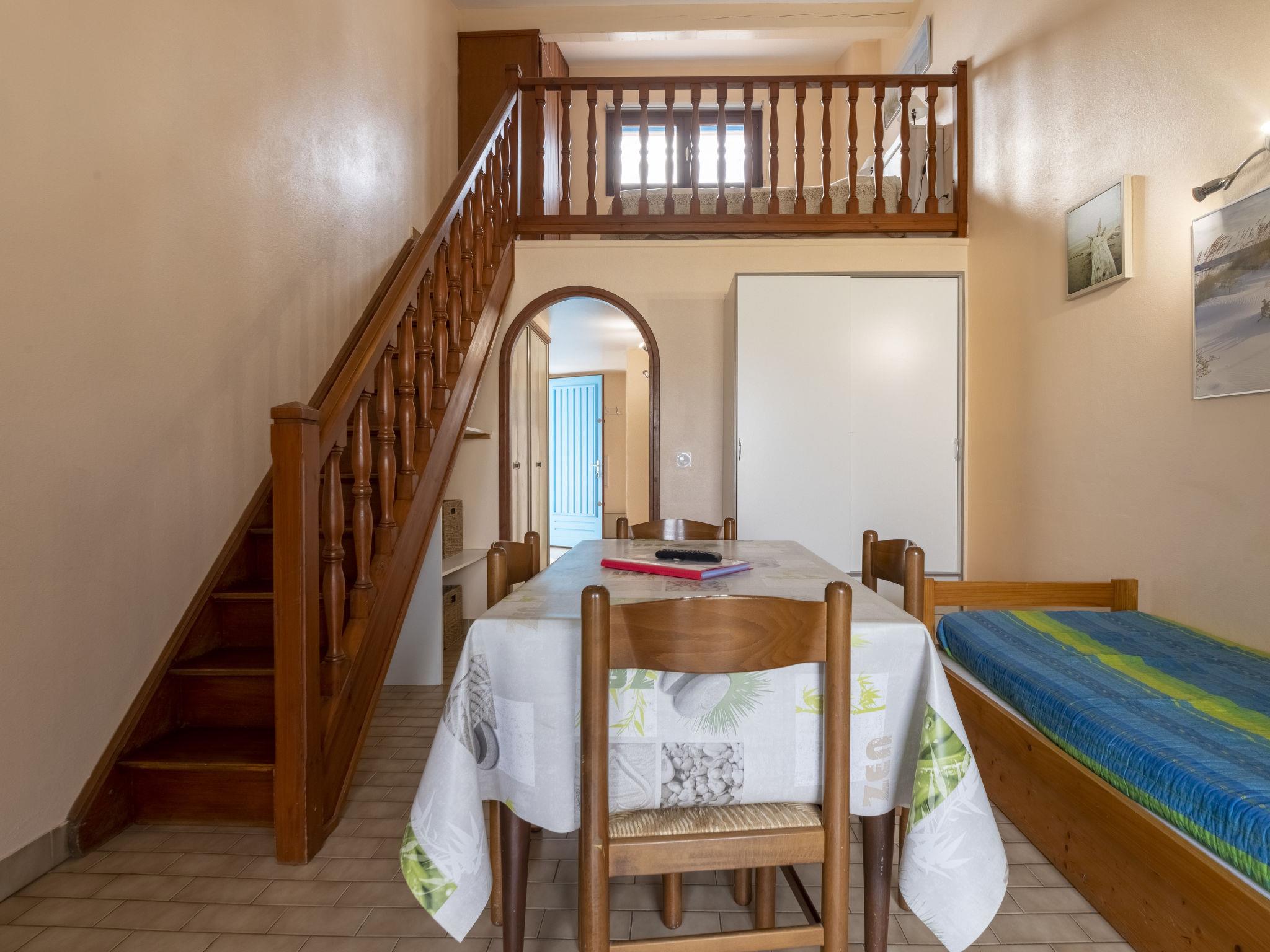 "Soleil Camarguais", 1-room apartment 40 m2 on 2 levels. Simple and practical furnishings: living/sleeping room with 1 bed (140 cm, length 190 cm), dining table and TV. Exit to the balcony. Gallery with 2 pull-out beds (2 pers. 2 x 80 cm, length 180 cm). Kitchenette (mini-oven, 3 ceramic glass hob hotplates, toaster, kettle, microwave, freezer, electric coffee machine). Shower/WC. Electric heating. Balcony. Balcony furniture. Facilities: iron. Internet (WiFi, free). Instead of an enclosed bedroom, some sleeping areas are located in an open-plan area (gallery, alcove, etc.). 13096000014AK