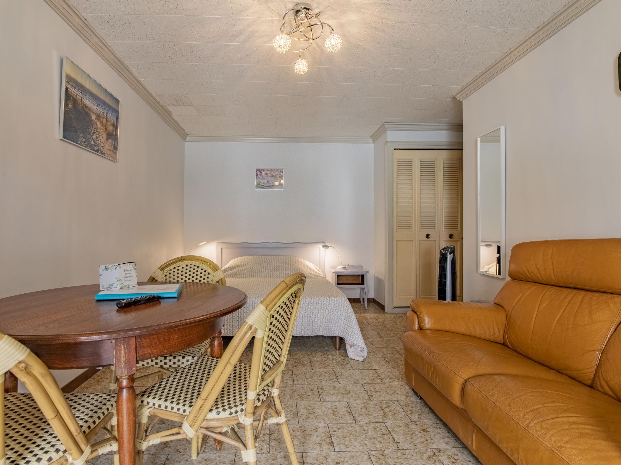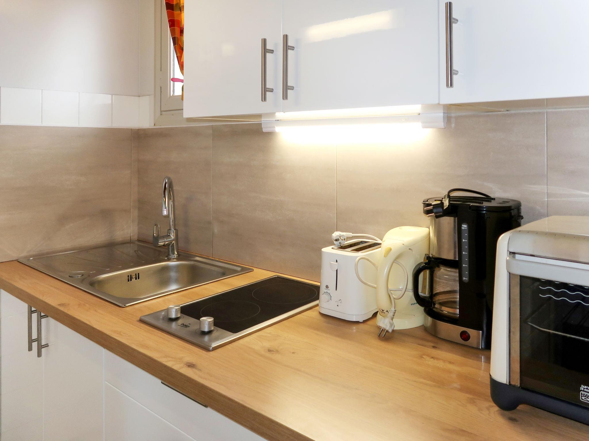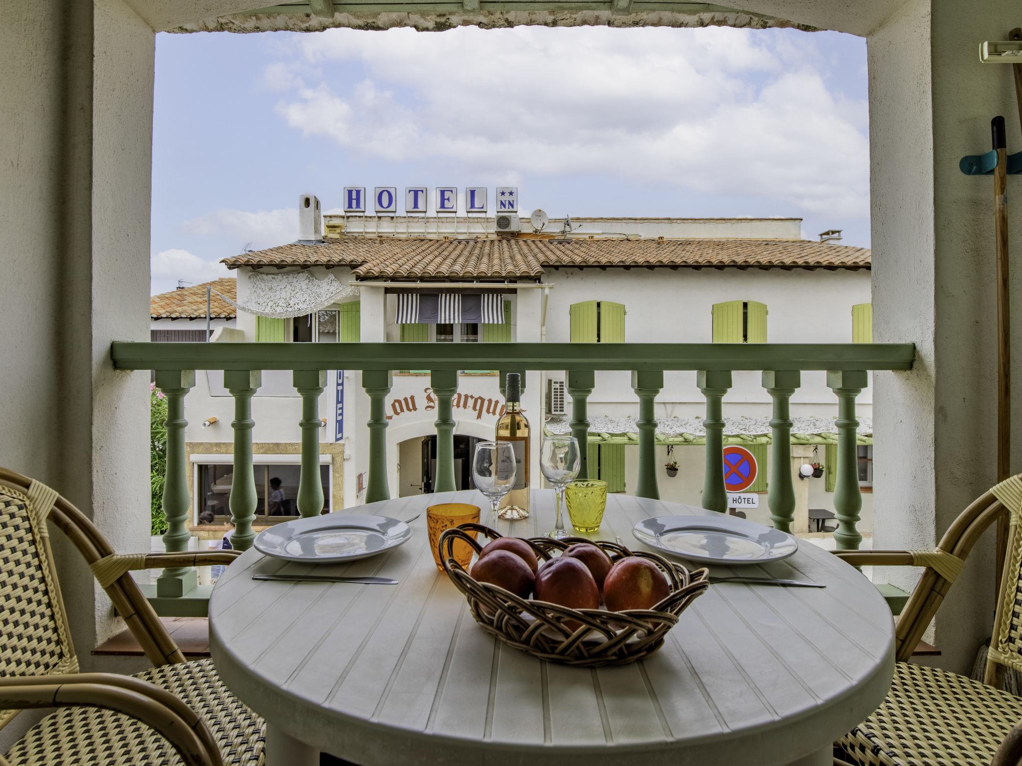 "Le Soleil Camarguais", 1-room apartment 30 m2 on 1st floor. Simple and practical furnishings: living/sleeping room with 1 french bed (140 cm, length 190 cm), dining table and TV. Exit to the balcony. Small kitchen (mini-oven, 2 ceramic glass hob hotplates, toaster, kettle, microwave, electric coffee machine). Shower/WC. Electric heating. Balcony. Balcony furniture. Facilities: iron. Internet (WiFi, free). Garage (extra). 13096000010HT