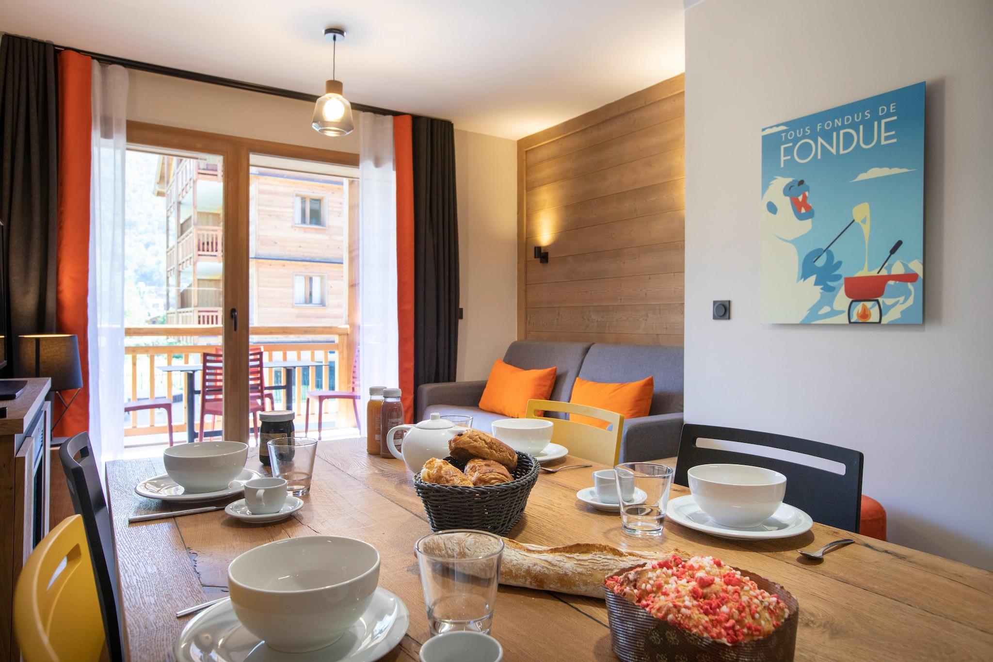 Résidence Samoëns Village is a stylish, comfortable residence with contemporary and warmly decorated apartments. Several larger connected chalets house inviting apartments of various sizes. It is located 600m from the attractive centre of Samoëns and 500m from the Télécabine du Grand Massif. This ground-floor apartment is finely and fully furnished. The living room has a double sofa bed, TV and electric fireplace. The kitchen is fully equipped, including a dishwasher and microwave oven. The apartment also has a bedroom with a double bed or two single beds, a bathroom with a shower (in a bathtub) and a separate toilet. For extra comfort, your beds will already be made on arrival. Outside, the apartment offers a balcony or terrace overlooking the skiing domain. Indoor and outdoor parking is available (subject to availability). In Résidence Samoëns Village, you can book various comfortable apartments for four to ten people.