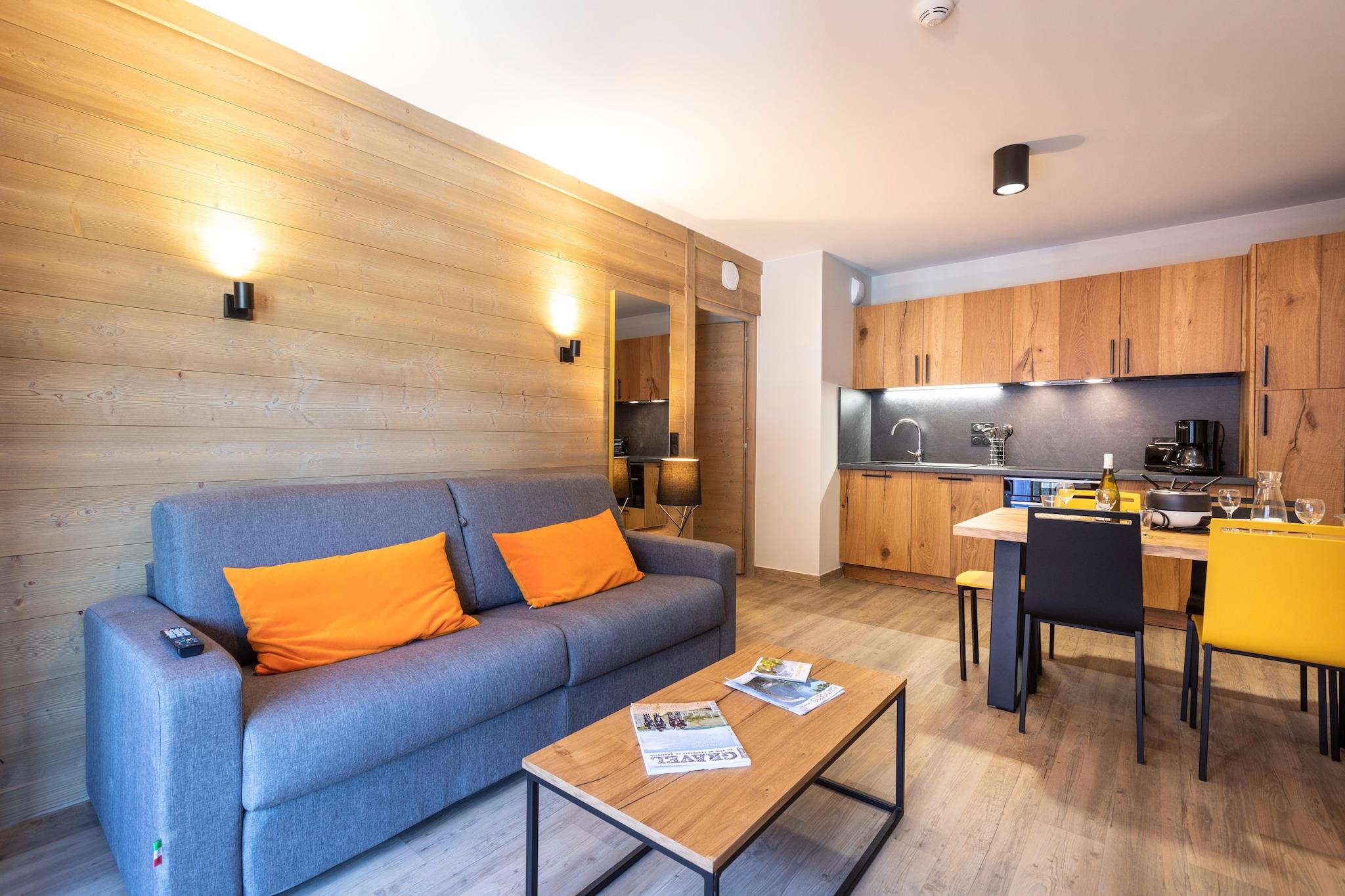 Résidence Samoëns Village is a stylish and comfortable residence with contemporary and warmly decorated apartments. A number of larger connected chalets house inviting apartments of various sizes. It is located 600 m. from the attractive center of Samoëns and 500 m. from the Télécabine du Grand Massif. This ground-floor apartment is nicely and fully furnished. The living room has a 2-pers. sofa bed, TV and electric fireplace. The kitchen is fully equipped including a dishwasher and combination microwave. The apartment also has two bedrooms with a double bed or two 1-pers. beds, a bathroom with shower (in bath) and separate toilet. For extra comfort, your beds are already made upon arrival.Outside, the apartment offers a balcony or terrace with a view of the ski domain. There is both indoor and outdoor parking (depending on availability). In Résidence Samoëns Village you can book various comfortable apartments for four to ten people.