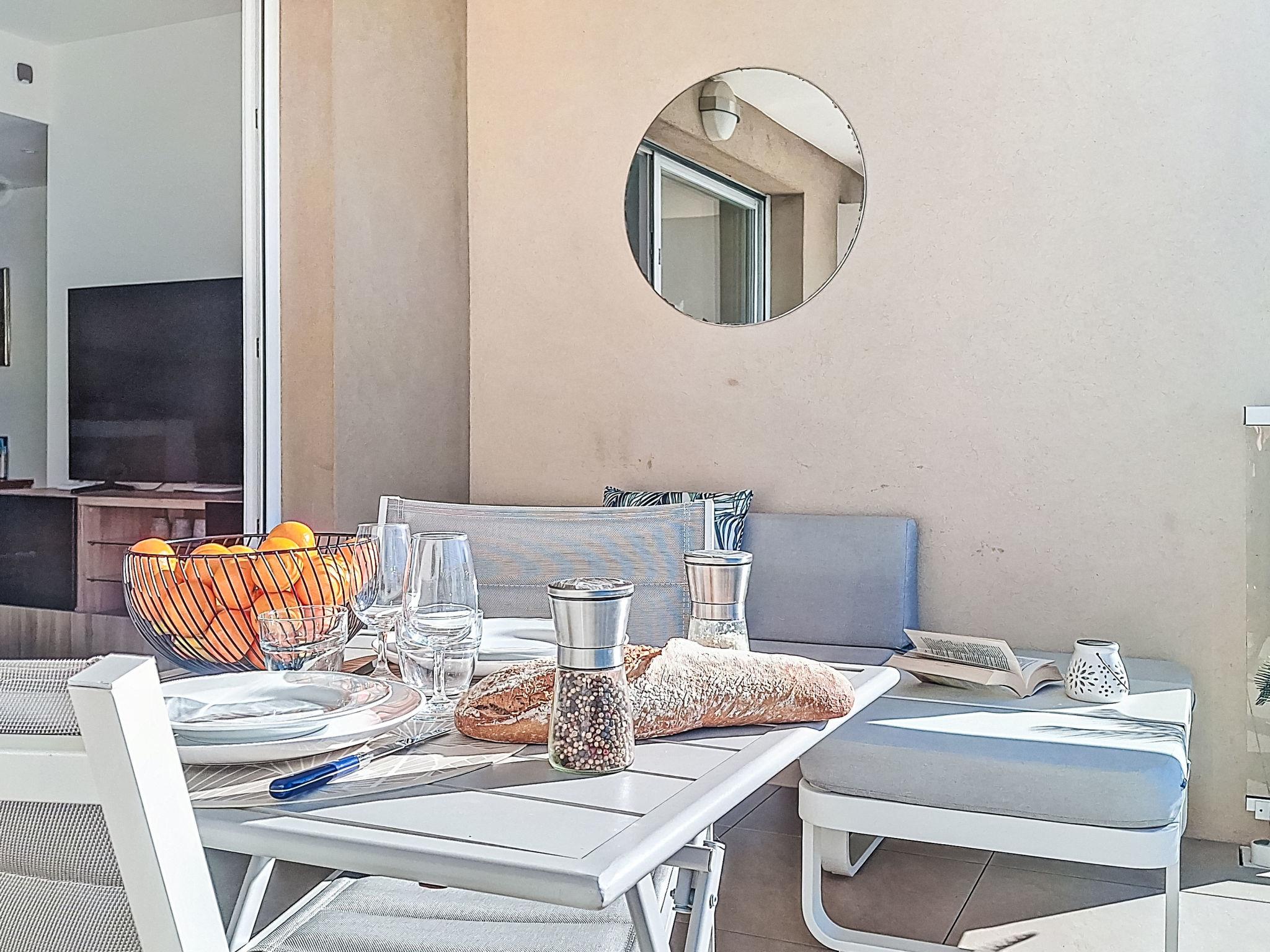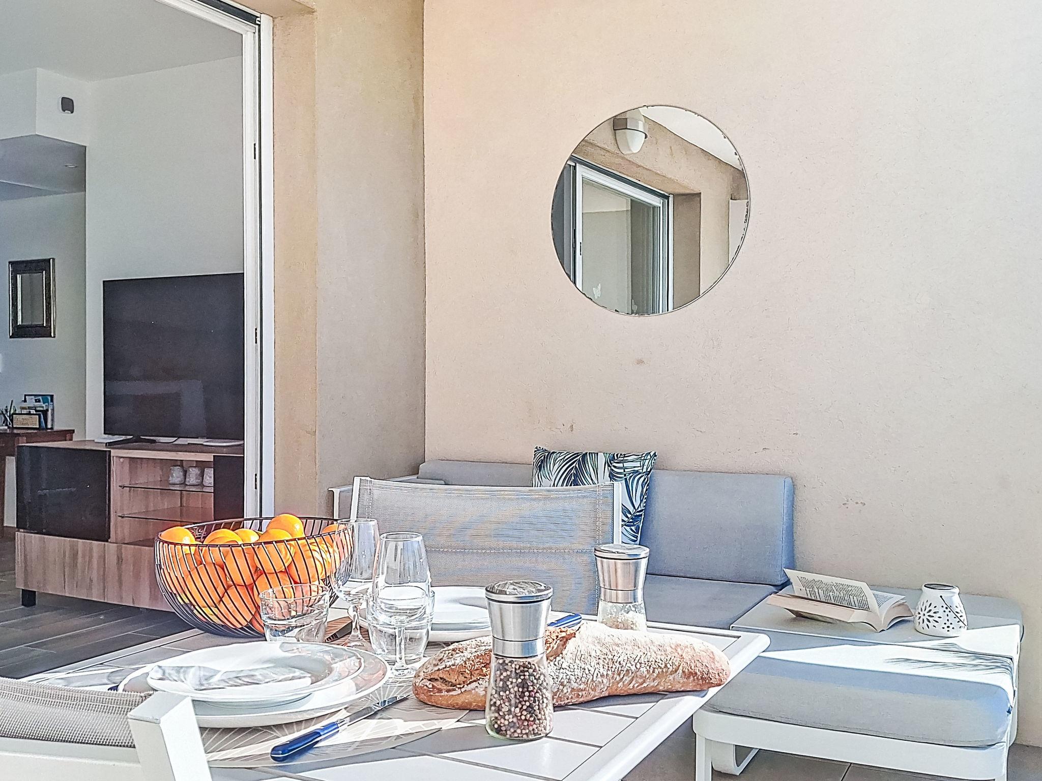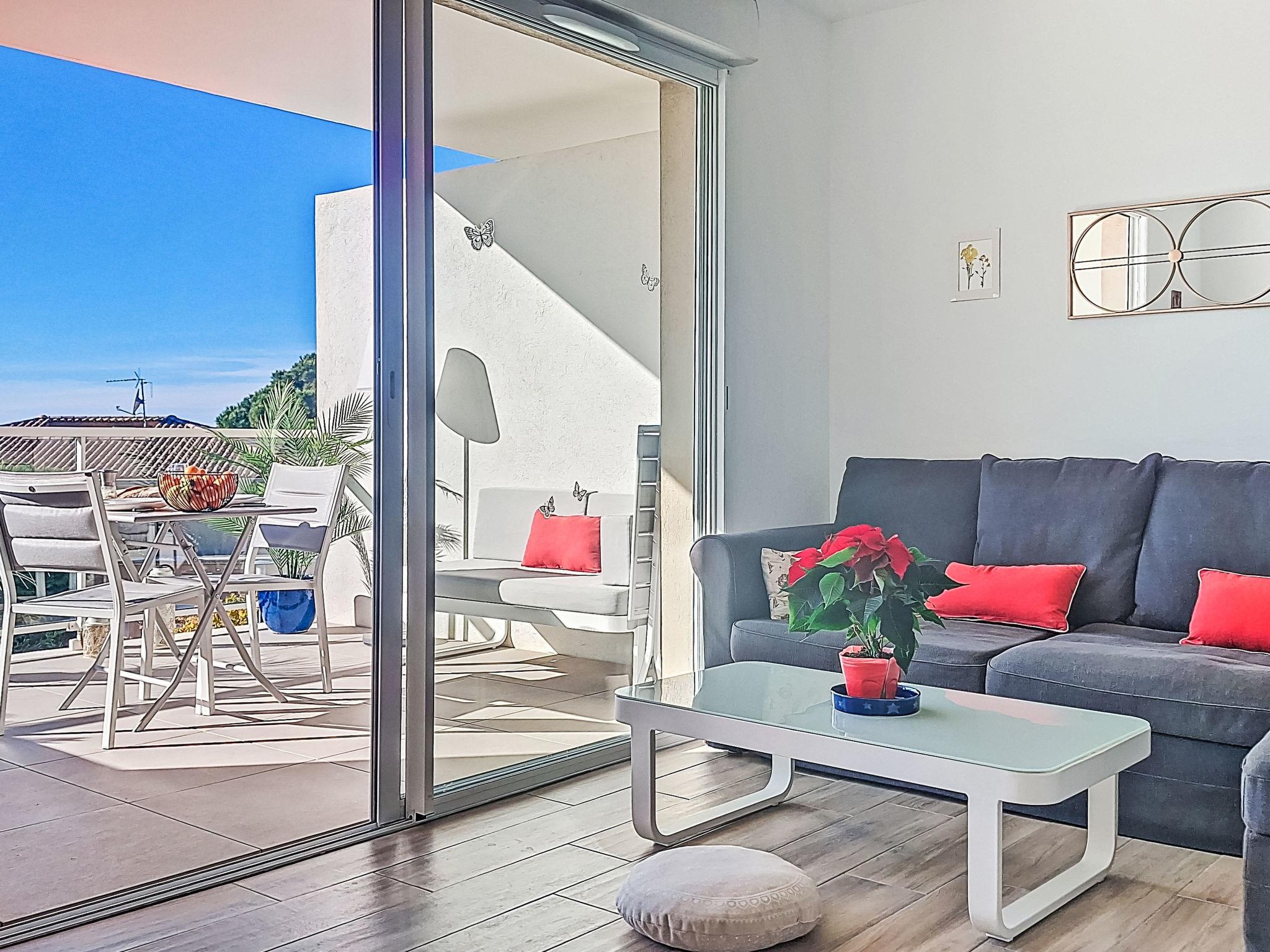 2-room apartment 40 m2 on 1st floor. Bright, comfortable and beautiful furnishings: living/dining room 20 m2 with TV (flat screen), air conditioning. Exit to the terrace. 1 room with 1 french bed (140 cm, length 190 cm), air conditioning. Open kitchen (dishwasher, 1 induction hot plates, 3 gas rings, toaster, kettle, freezer, electric coffee machine, Capsules for coffee machine (SENSEO) extra, combination microwave). Shower, sep. WC. Forced-air heating. Terrace 20 m2, south-west facing position. Terrace furniture. View of the sea. Facilities: washing machine. Internet (WiFi). Parking space n 14 (1 car). Please note: non-smokers only. TV only FR. Smoke alarm. Offer by a private individual according to Art. 155, IV of CGI. 83123002313T8