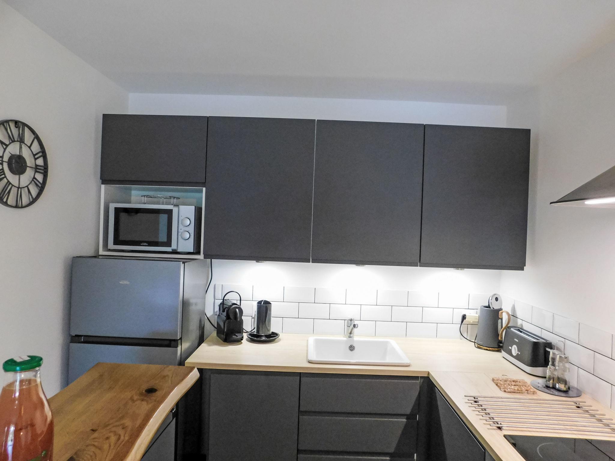 2-room apartment 40 m2, on the ground floor. Bright, comfortable and beautiful furnishings: living/dining room 23 m2 with TV (flat screen). Exit to the garden, to the terrace. 1 room with 1 french bed (160 cm, length 200 cm). Open kitchen (oven, dishwasher, 3 induction hot plates, toaster, kettle, freezer, electric coffee machine, Capsules for coffee machine (NESPRESSO) extra, combination microwave). Shower, sep. WC. Electric heating. Terrace 20 m2, south-west facing position, patio, south-west facing position. Terrace furniture. Facilities: washing machine. Internet (WiFi, free). Parking. Please note: non-smokers only. TV only FR. Smoke alarm. Offer by a private individual according to Art. 155, IV of CGI. 1888137723388
