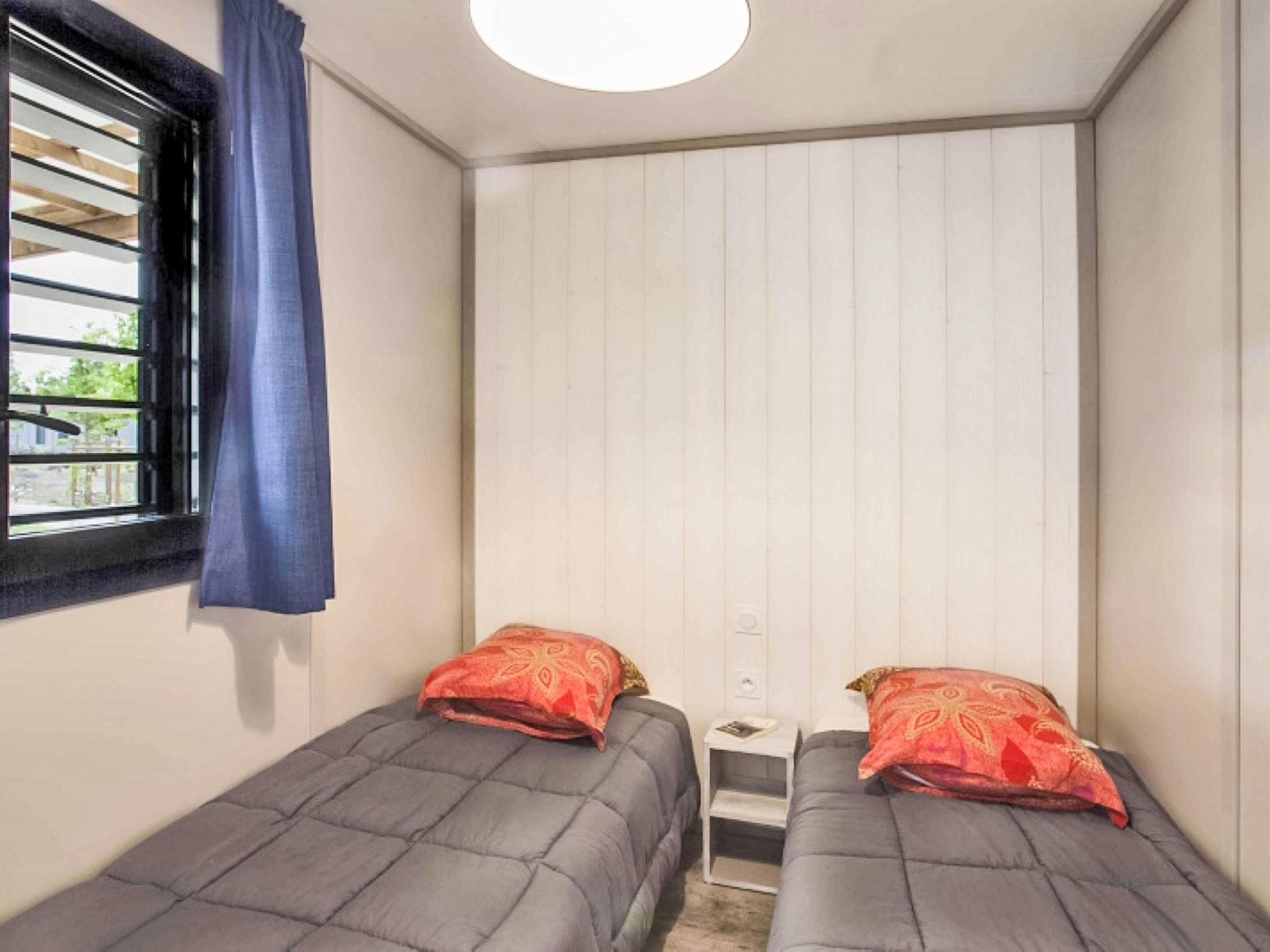 "Lodge Natura 4p", 3-room chalet 37 m2. Comfortable furnishings: living/dining room with dining table and TV (flat screen), air conditioning. Exit to the terrace. 1 room with 1 french bed (160 cm, length 200 cm). 1 room with 2 beds (90 cm, length 190 cm). Kitchenette (oven, dishwasher, 3 induction hot plates, toaster, kettle, microwave, electric coffee machine). Shower, sep. WC. Electric heating. Terrace partly roofed, small garden. Terrace furniture, barbecue (portable). Facilities: children's high chair, baby cot (extra), hair dryer. Internet (WiFi, free). Parking (fenced). Please note: non-smokers only. Smoke alarm. Offer by a commercial proprietor according to Art. 155, IV, CGI