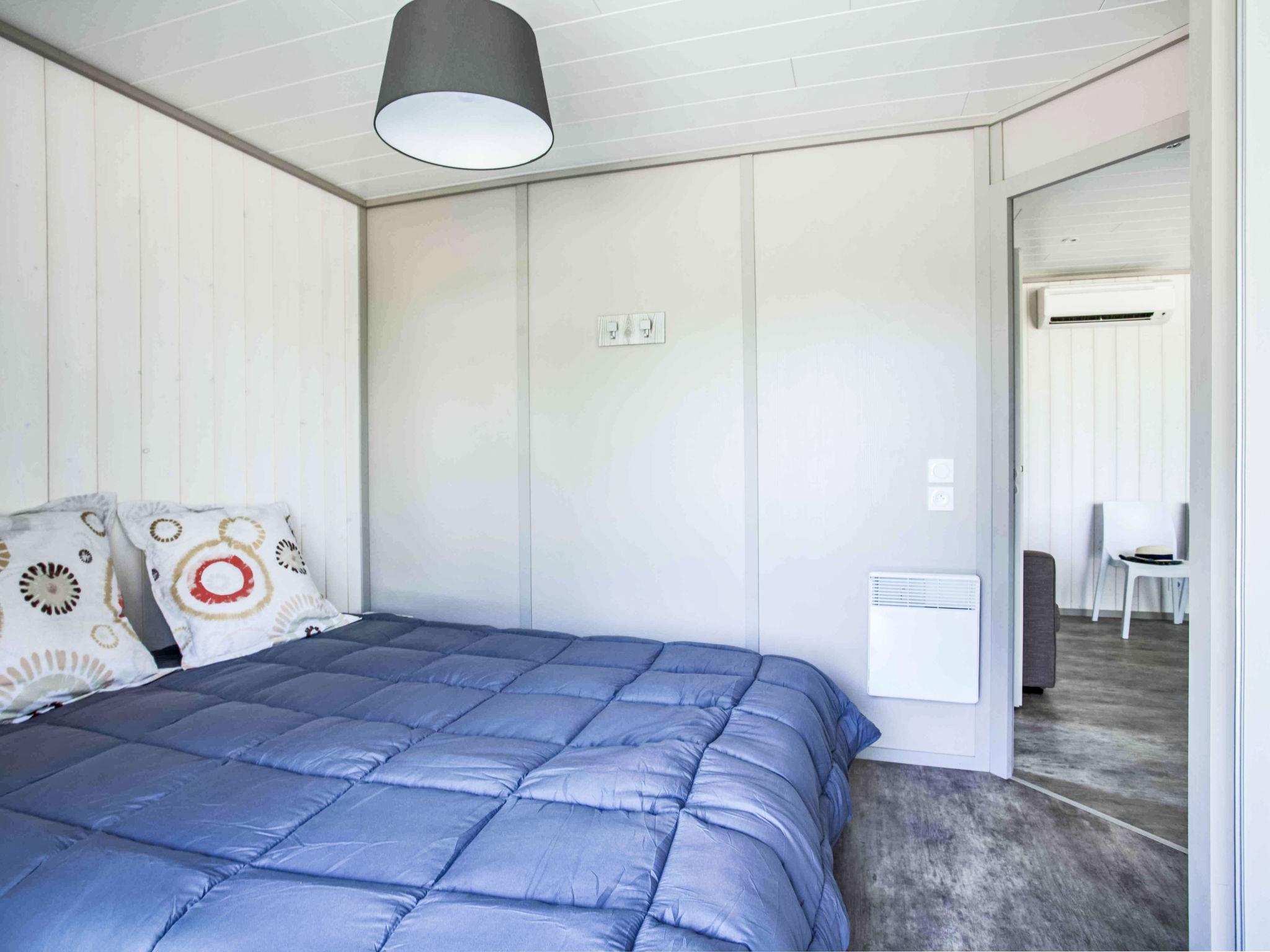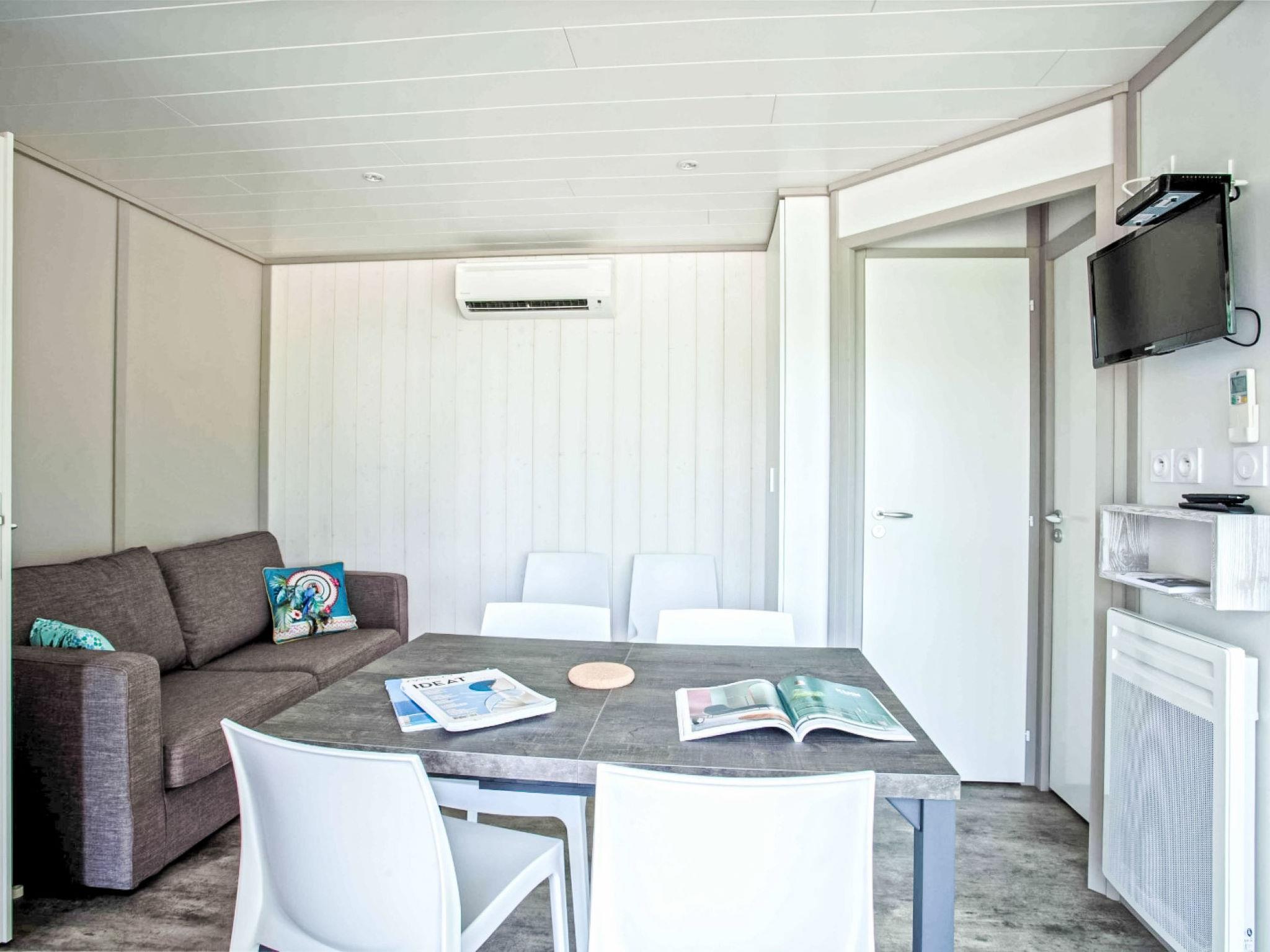 "Lodge Natura 5p", 3-room chalet 40 m2. Comfortable furnishings: living/dining room with dining table and TV (flat screen), air conditioning. Exit to the terrace. 1 room with 1 french bed (160 cm, length 200 cm). 1 room with 1 bed (90 cm, length 190 cm), 1 x 2 bunk beds (90 cm, length 190 cm). Kitchenette (oven, dishwasher, 3 induction hot plates, toaster, kettle, microwave, electric coffee machine). Shower, sep. WC. Electric heating. Terrace partly roofed, small garden. Terrace furniture, barbecue (portable). Facilities: hair dryer. Parking (fenced). Please note: non-smokers only. Smoke alarm. Offer by a commercial proprietor according to Art. 155, IV, CGI