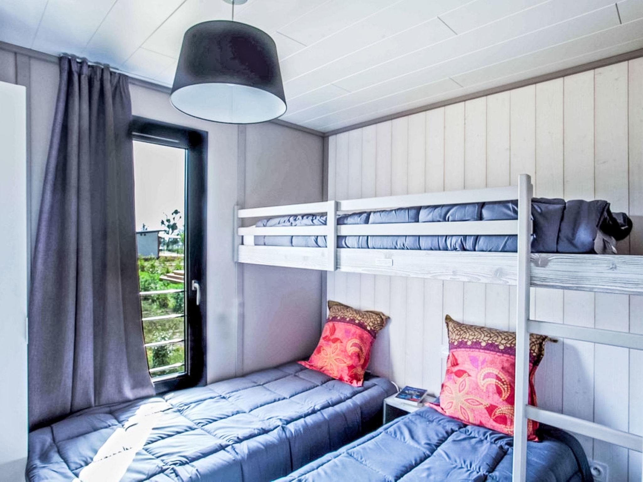 "Lodge Premium 5p", 3-room chalet 40 m2. Comfortable furnishings: living/dining room with dining table and TV (flat screen), air conditioning. Exit to the terrace. 1 room with 1 french bed (160 cm, length 200 cm). 1 room with 1 bed (90 cm, length 190 cm), 1 x 2 bunk beds (90 cm, length 190 cm). Kitchenette (oven, dishwasher, 3 induction hot plates, toaster, kettle, microwave, electric coffee machine). Shower, sep. WC. Electric heating. Terrace partly roofed, small garden. Terrace furniture, barbecue (portable). Facilities: hair dryer. Parking (fenced). Please note: non-smokers only. Smoke alarm. Offer by a commercial proprietor according to Art. 155, IV, CGI
