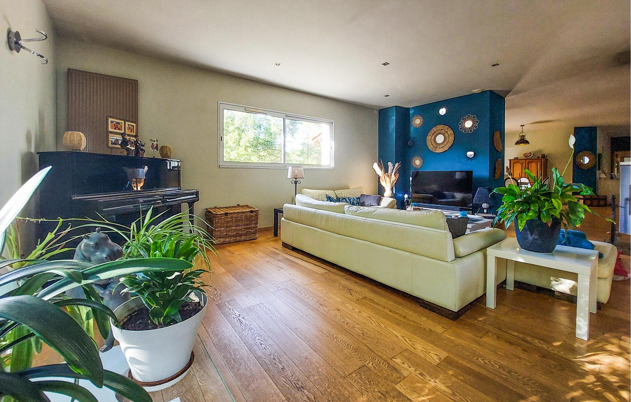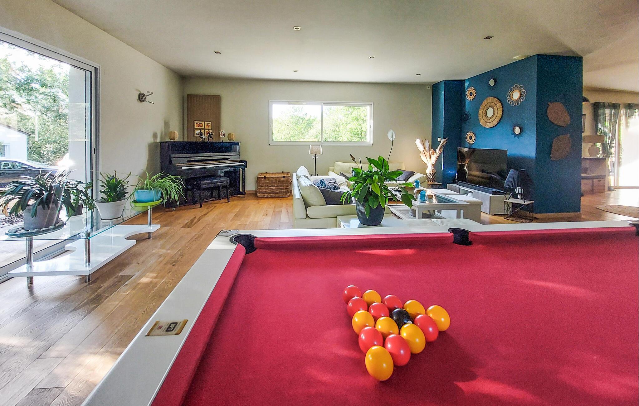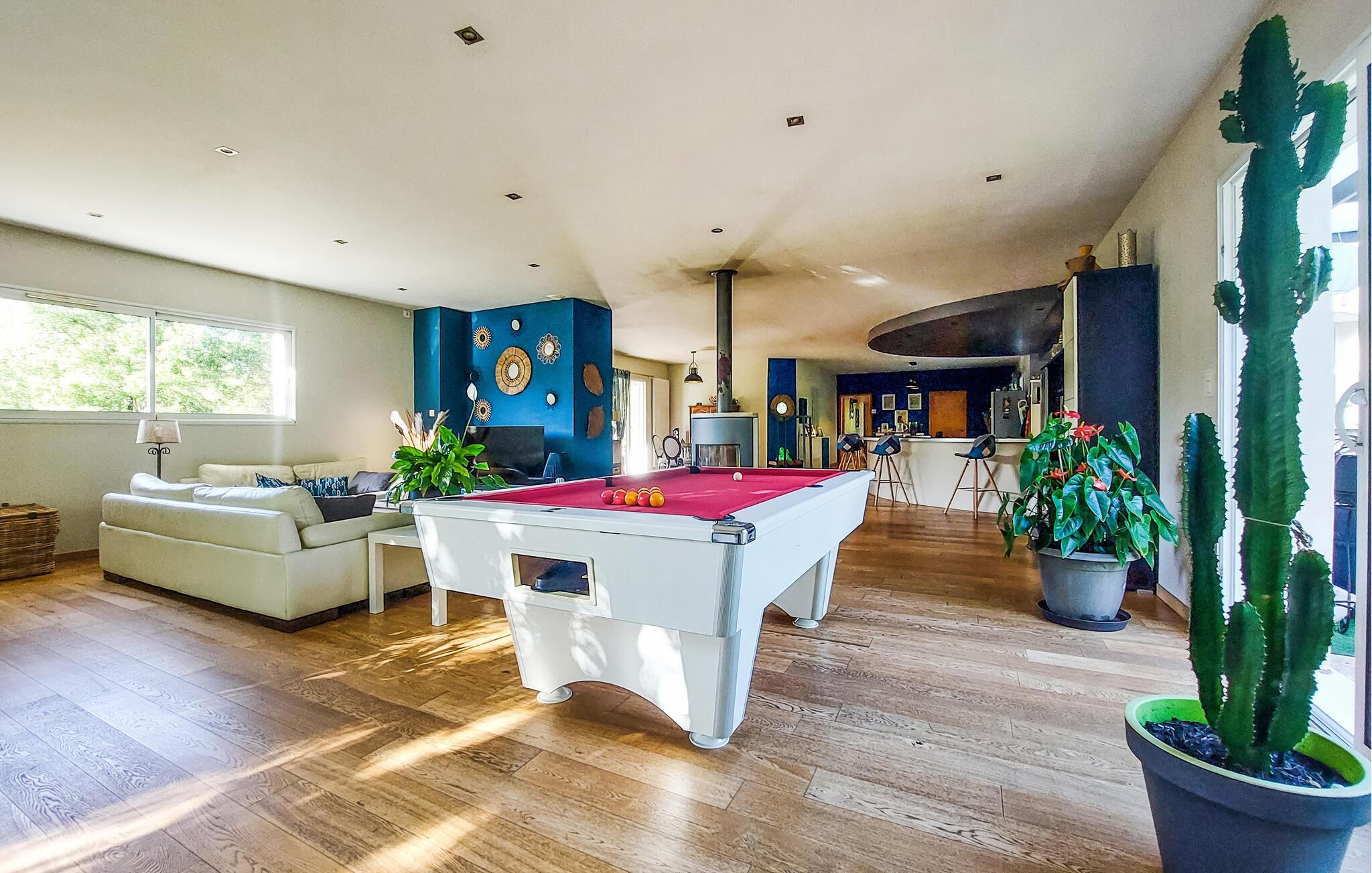 Dieses geräumige Ferienhaus liegt eingebettet in ein idyllisches Grundstück und begrüßt Sie mit einer hellen und behaglichen Atmosphäre aus authentischen Möbeln und liebevollen Details. Zaubern Sie kulinarische Highlights, planen Sie Ihre Unternehmungen bei harmonischen Mahlzeiten und veranstalten Sie gesellige Spieleabende. Plaudern Sie auf den gemütlichen Sofas, spielen Sie eine Runde Billard oder streamen Sie einen spannenden Film.