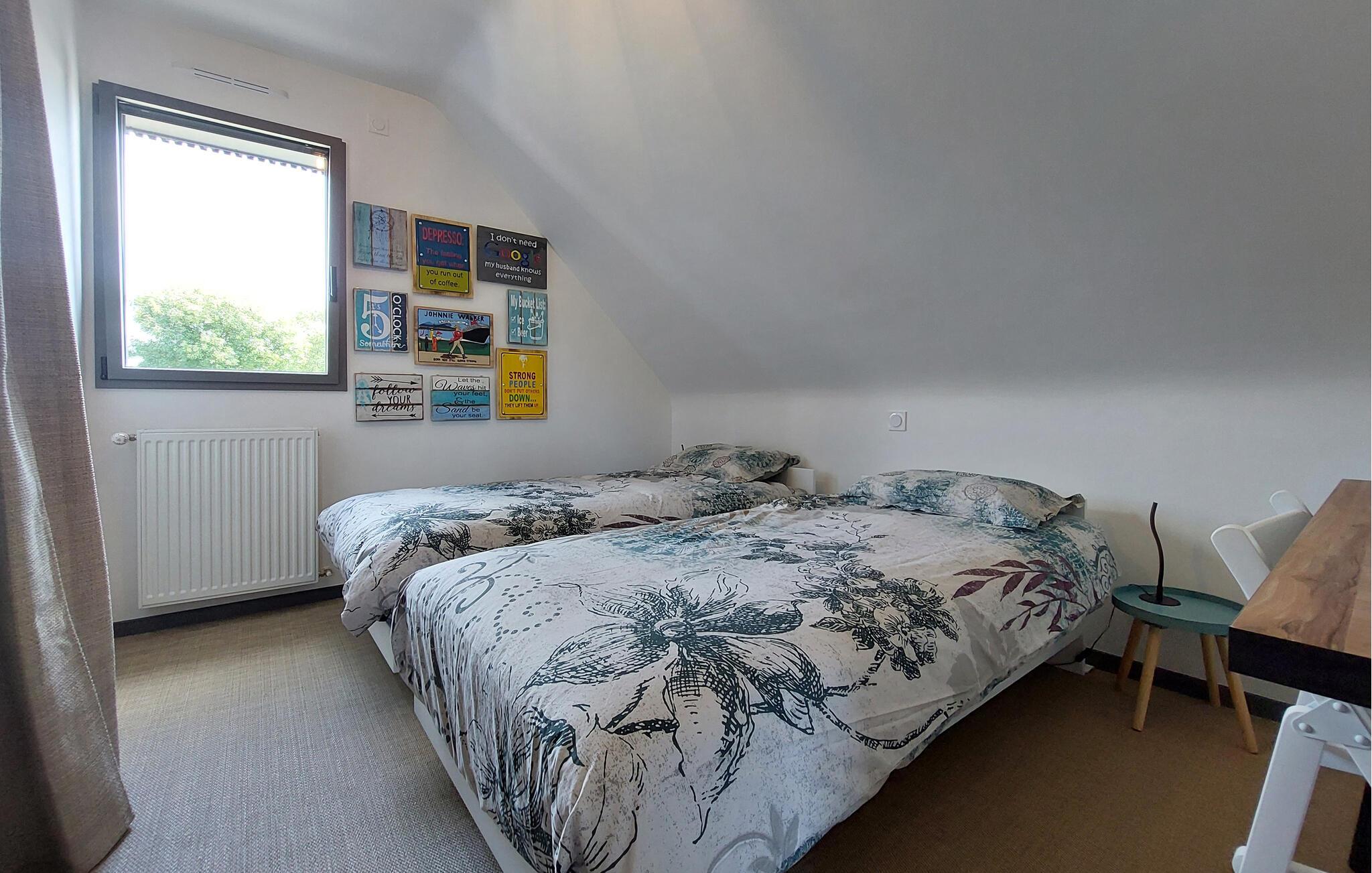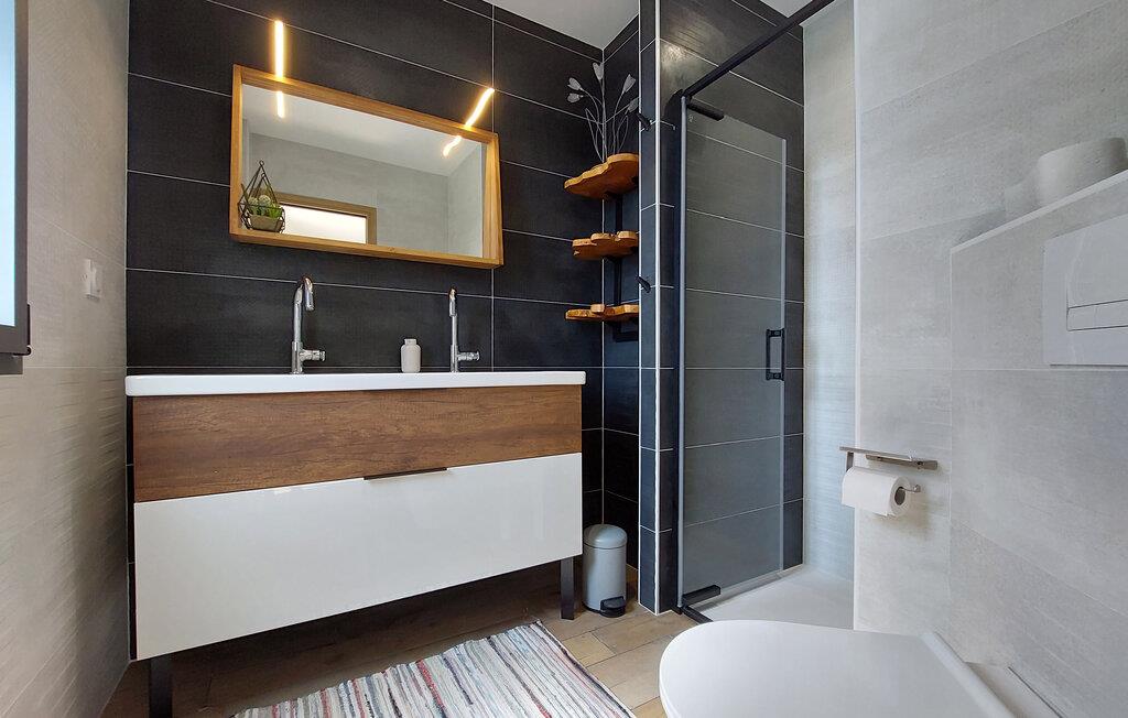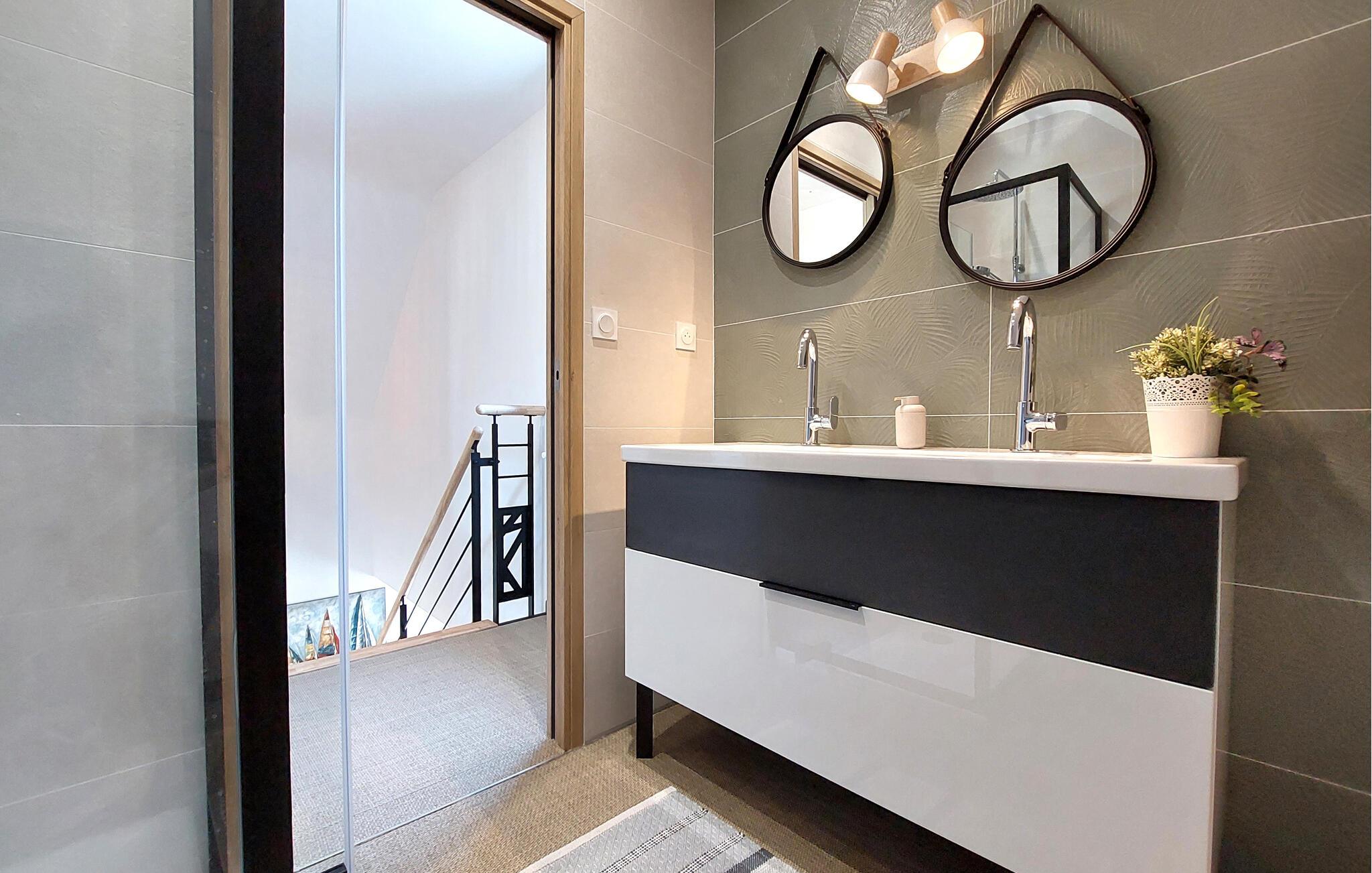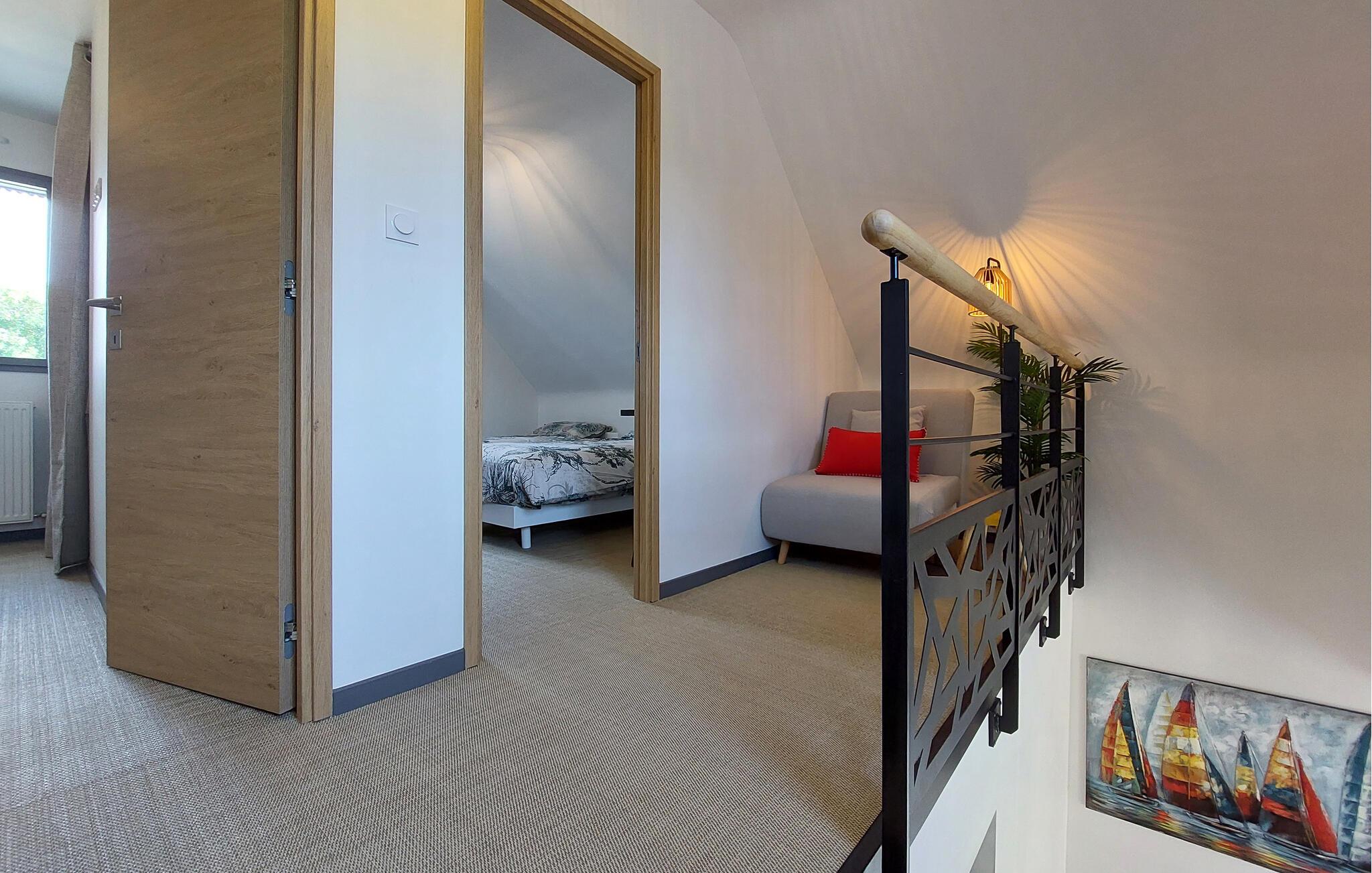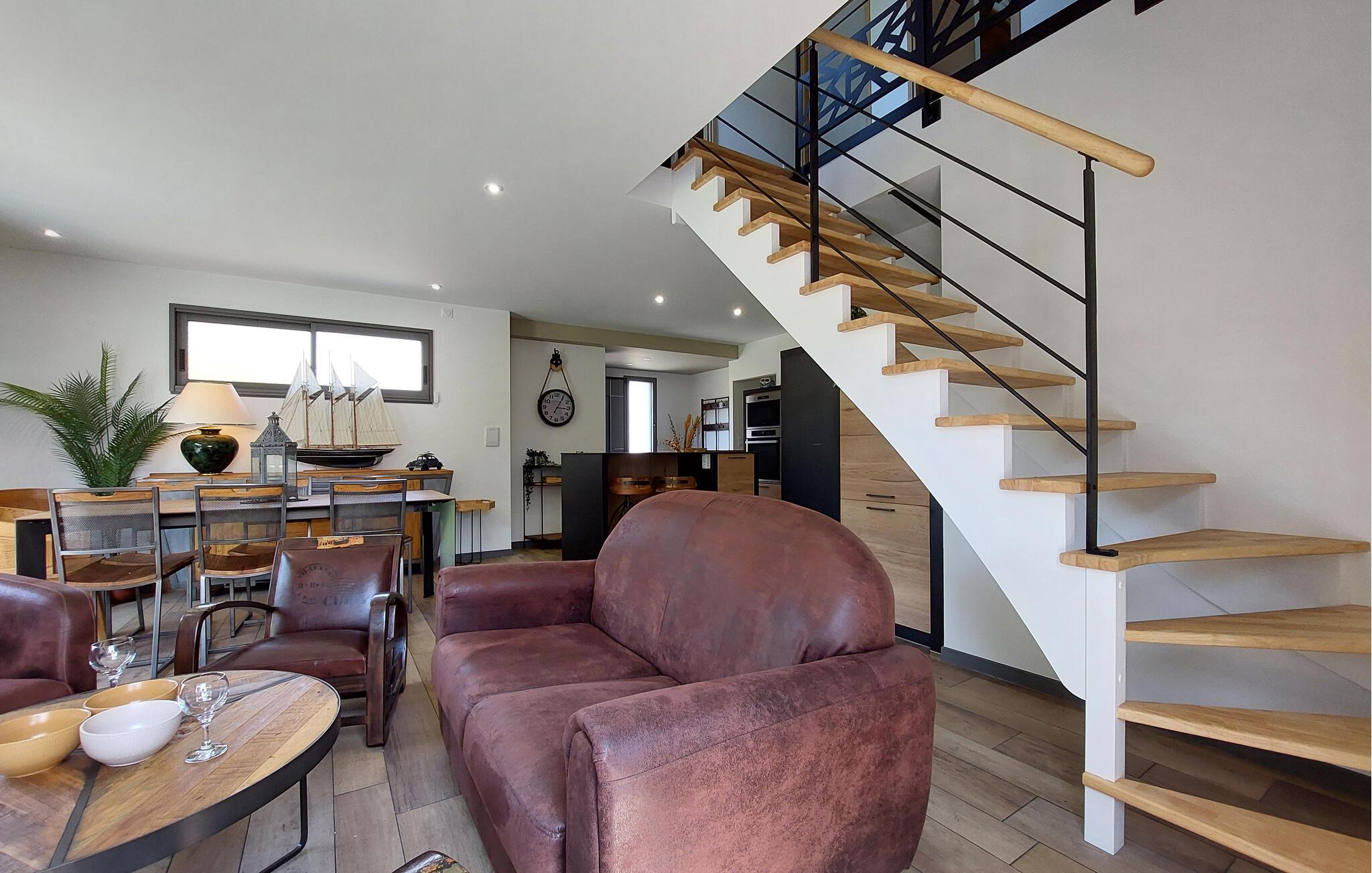 Dieses moderne, voll ausgestattete Ferienhaus in Sarzeau bietet Ihnen eine unvergleichliche Atmosphäre der Entspannung. Schon beim Betreten spüren Sie die hochwertige Einrichtung – stilvolle Architektur, ausgesuchtes Design und elegante Möbel schaffen für Sie ein exklusives Ambiente. Ein besonderes Highlight ist die offene Galerie, die den Innenraum luftig und großzügig wirken lässt. Große Fenster fluten die Räume mit Licht und geben den Blick frei auf den blühenden, wunderschön angelegten Garten. Hier genießen Sie absolute Ruhe und Erholung – ein perfekter Rückzugsort, nur wenige Gehminuten vom Strand und Hafen entfernt. Kommen Sie auf der Terrasse zusammen und genießen die Sonne und gemeinsame Mahlzeiten vom Grill.