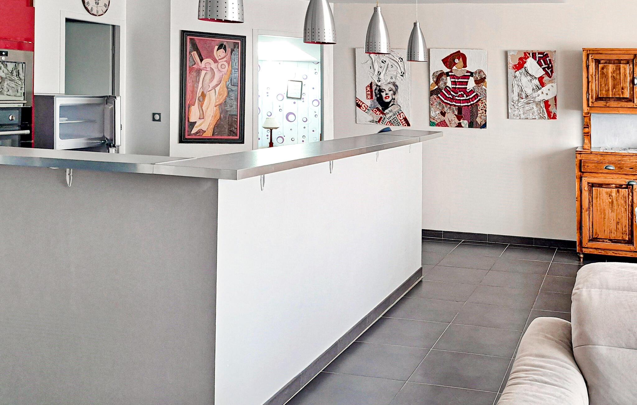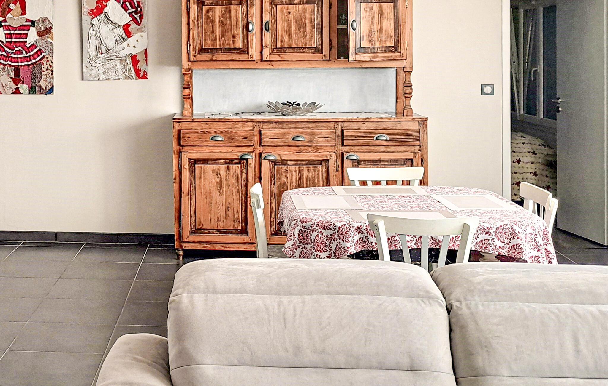 9 km von Béziers und 7 km von den Stränden entfernt lädt dieses großzügig geschnittene Appartement zu einem sonnigen Urlaub in Frankreich ein. Die moderne und helle Ferienwohnung befindet sich in der ersten Etage und bietet eine angenehme Basis für Ihre Ausflüge durch das wunderschöne Hérault. Béziers ist eine sehr schöne Stadt, die das ganze Jahr durch einiges zu bieten hat. Machen Sie in Béziers einen unvergesslichen Spaziergang entlang der alten Schleusentreppe Fonserannes und erleben Sie die Kathedrale Saint-Nazaire. Ein Erlebnis sind auch das ehemalige Oppidum d'Ensérune mit seinem wunderschönen Panorama ins Tal, das Château de Raissac und das Château de Puisserguier. Genießen Sie einen Bummel durch die Markthalle der Stadt und lassen Sie sich dabei von vielen tollen Produkten direkt aus der Region verführen, die Sie in der gut ausgestatteten Küche des Ferienobjekts zu leckeren Gerichten verarbeiten können. Einen Besuch wert sind das in Weinfelder eingebettete Kloster Fontcaude sowie die römischen Arenen in Béziers, die vor allem in den Sommermonaten einer Fülle von Veranstaltungen den passenden Rahmen geben. 16 km entfernt liegt Ihnen eine Reihe herrlicher Sandstrände zu Füßen. Verbringen Sie dort viele schöne Stunden mit der Familie. Der wenige Kilometer entfernte Europark Vias Plage ist ein Spaß für kleine Urlauber. Jetskifahren, Paddeln, Segeln und Tauchen am Strand von Sérignan. Schlafzimmer mit offen integriertem Bad.