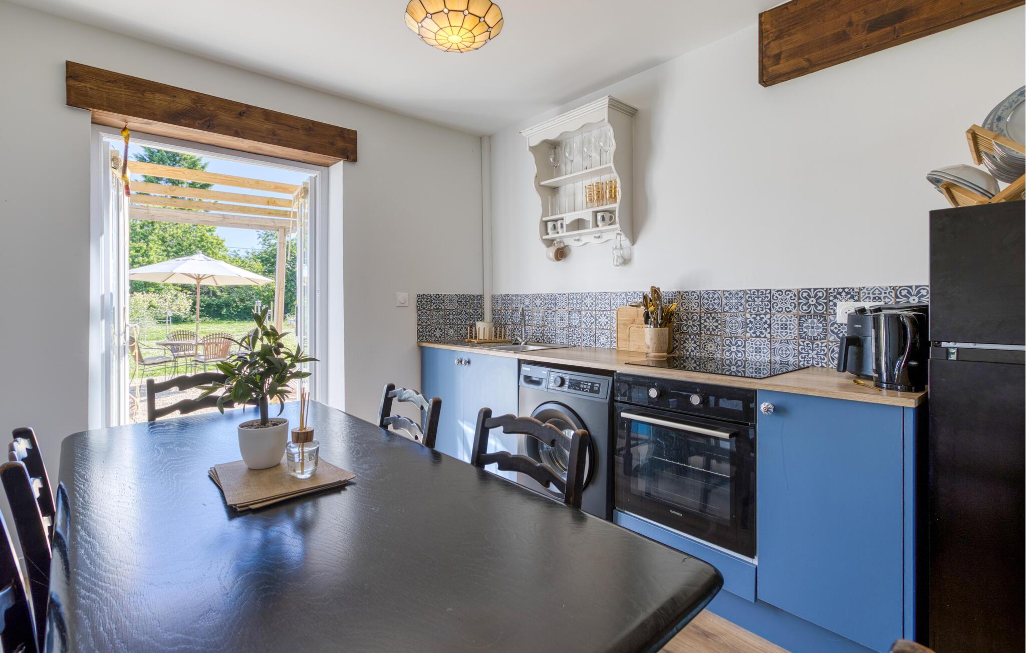 Dieses ruhig gelegene Ferienhaus in Savigné bietet Ihnen den idealen Rückzugsort für erholsame Tage auf dem Land. Genießen Sie das historische Ambiente eines liebevoll restaurierten Hauses und lassen Sie den Alltag hinter sich. Entdecken Sie den einladenden Wohnbereich mit gemütlicher Sitzecke und stilvollen Details. Kochen Sie in der praktisch eingerichteten Küche mit modernem Komfort und genießen Sie Ihre Mahlzeiten am rustikalen Esstisch. Die Mischung aus historischen Elementen und frischer Farbgestaltung sorgt für eine besonders wohnliche Atmosphäre.