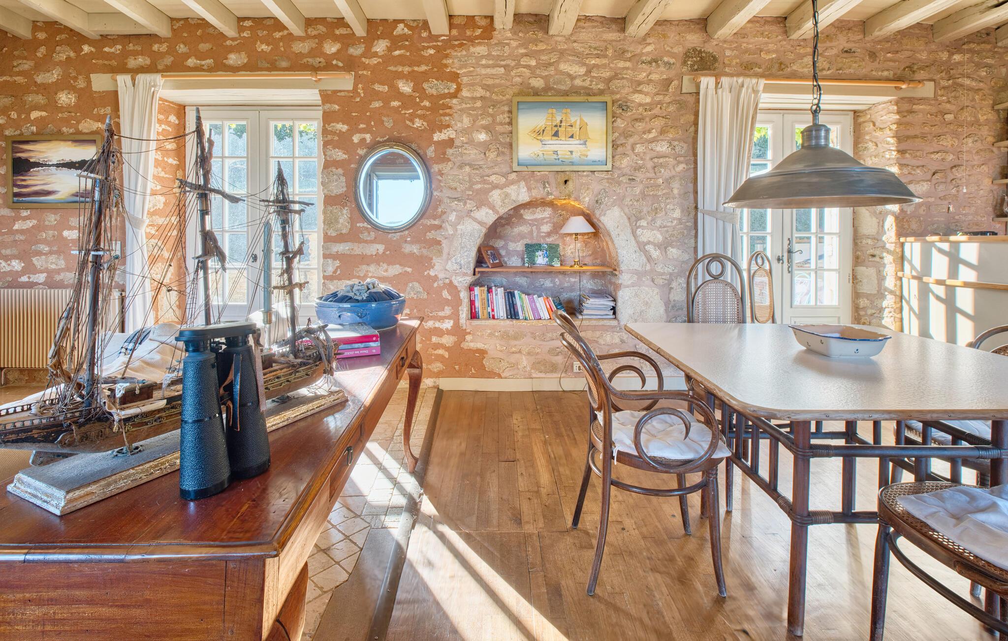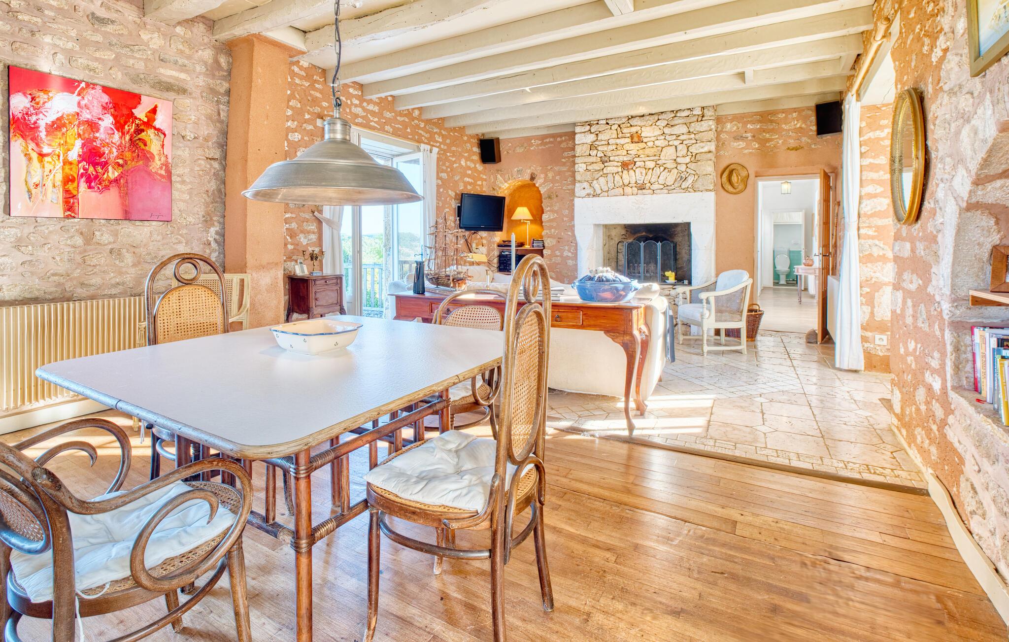 Dieses liebevoll eingerichtete Ferienhaus begrüßt Sie mit einer gelungenen Mischung aus rustikalem Charme und modernem Komfort. Zaubern Sie in der voll ausgestatteten Landhausküche köstliche Gerichte und genießen Sie diese im einladenden Essbereich. Entfachen Sie an kühleren Abenden den Kamin und plaudern Sie bis spät in die Nacht im gemütlichen Wohnzimmer.