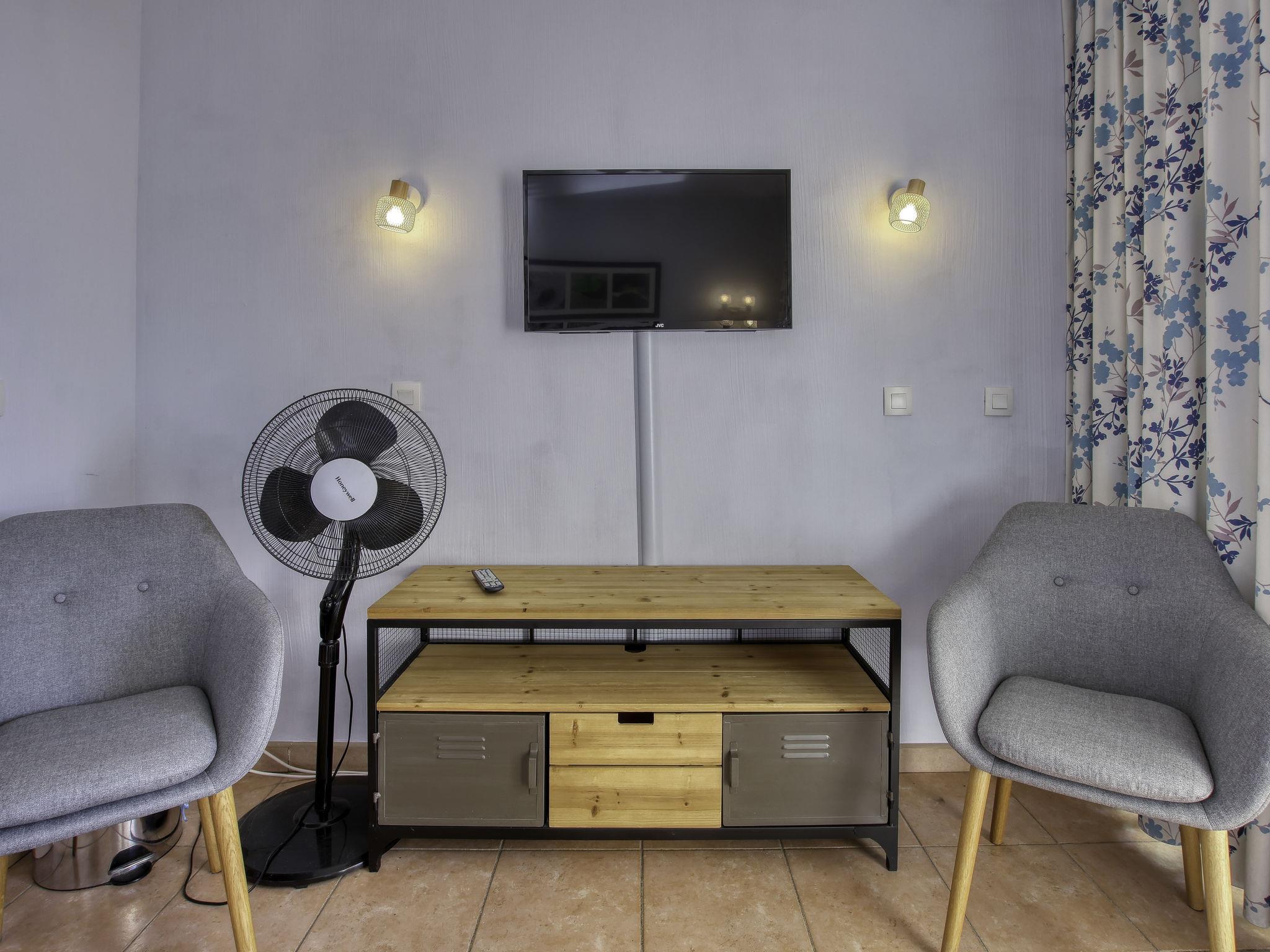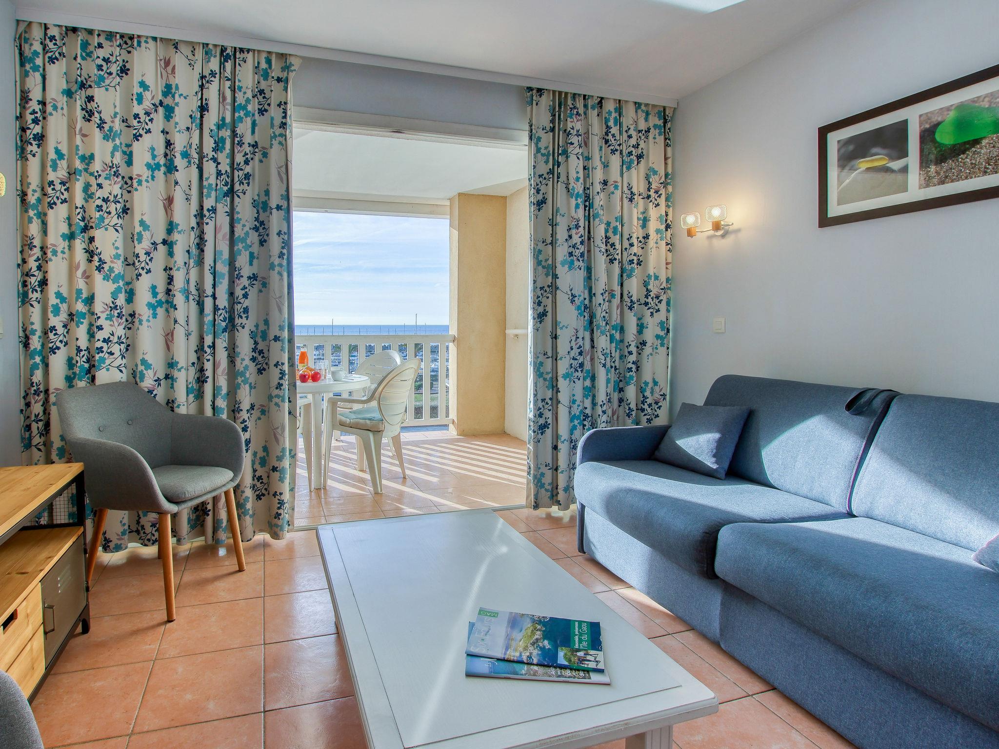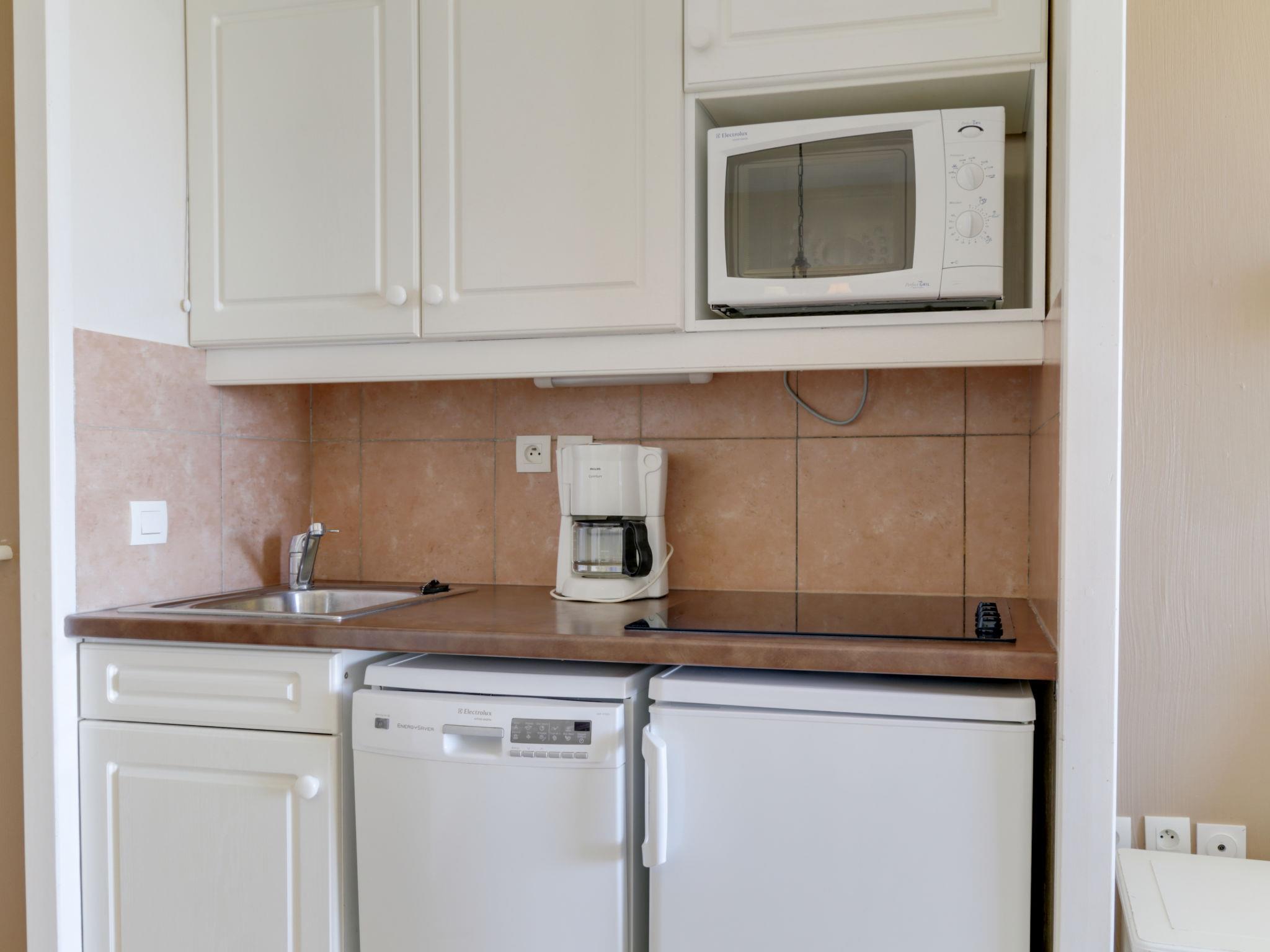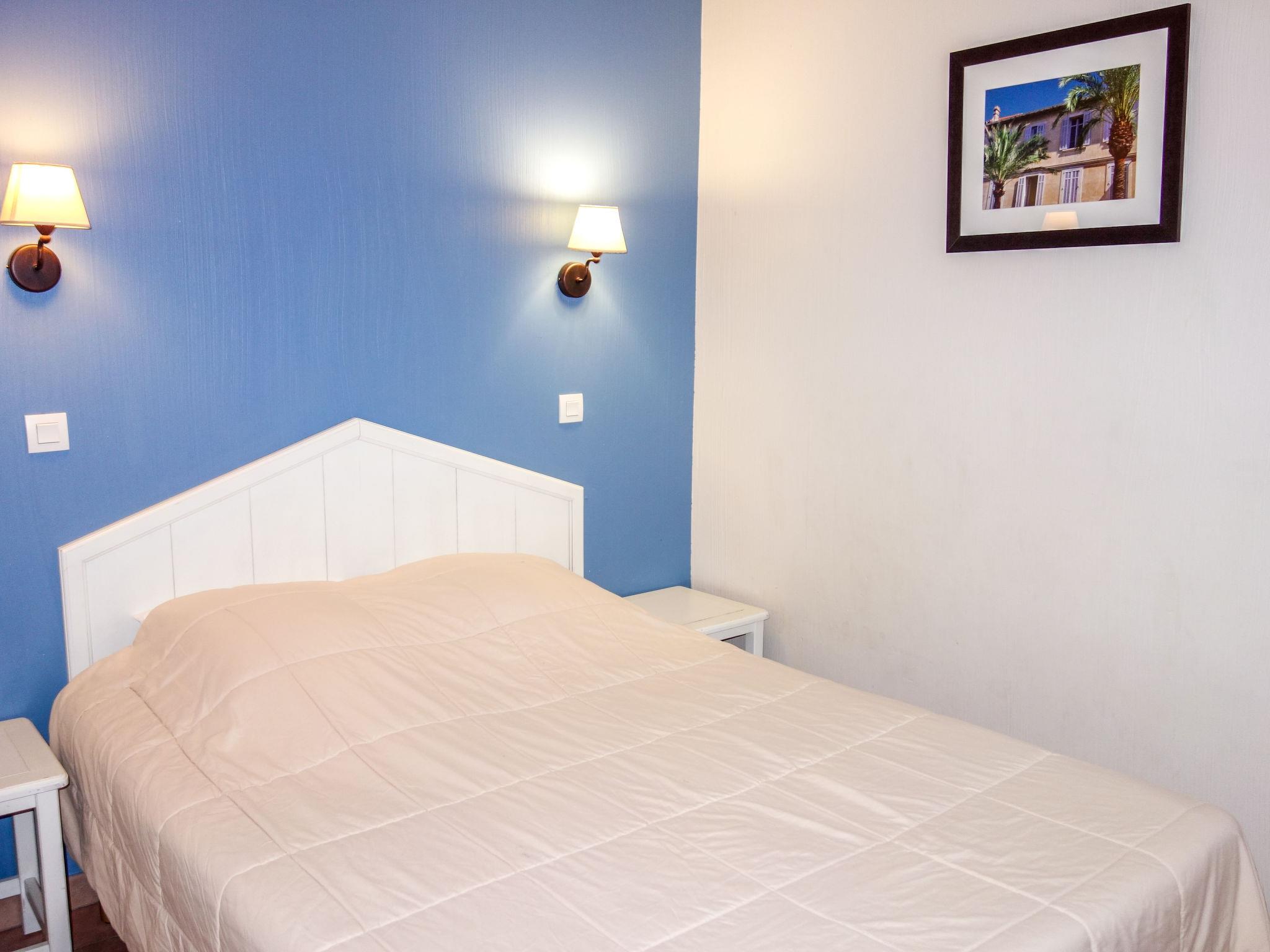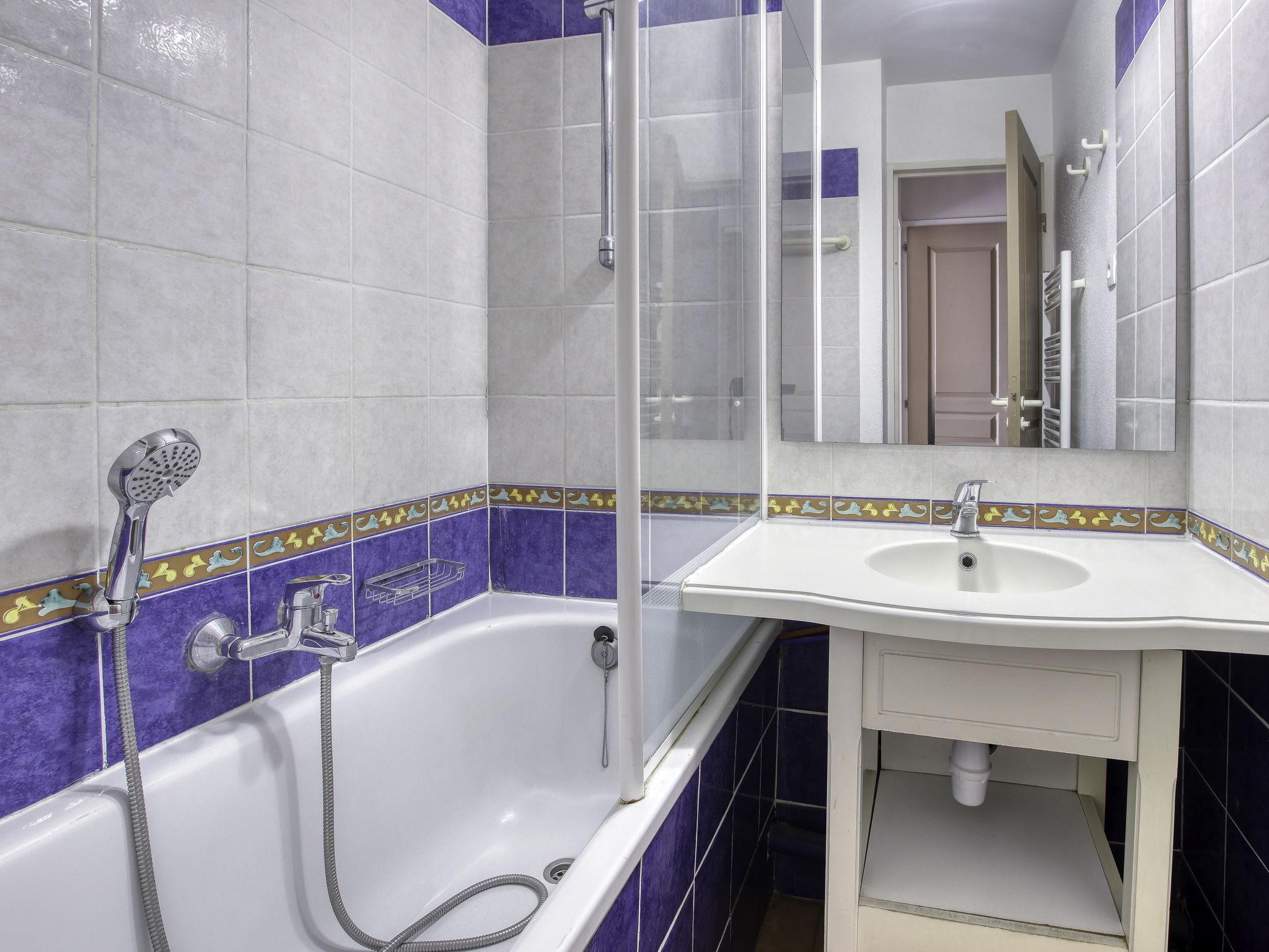 2-room apartment 32 m2 on 2nd floor. Practical and beautiful furnishings: living/dining room with 1 double sofabed (140 cm, length 190 cm), TV (flat screen). Exit to the terrace. 1 room with 1 french bed (1 x 140 cm, length 190 cm). Kitchenette (dishwasher, 4 ceramic glass hob hotplates, toaster, kettle, microwave, electric coffee machine). Bathroom, sep. WC. Electric heating. Terrace 9 m2, roofed, south-west facing position. Terrace furniture. Marvellous view of the sea and the swimming pool. Facilities: Internet (WiFi, extra). Parking space n 460 (Niveau 1) (roofed), height 190 cm, width 232 cm. Please note: maximum 1 pet/ dog allowed. TV only FR. Smoke alarm. FR835410019
