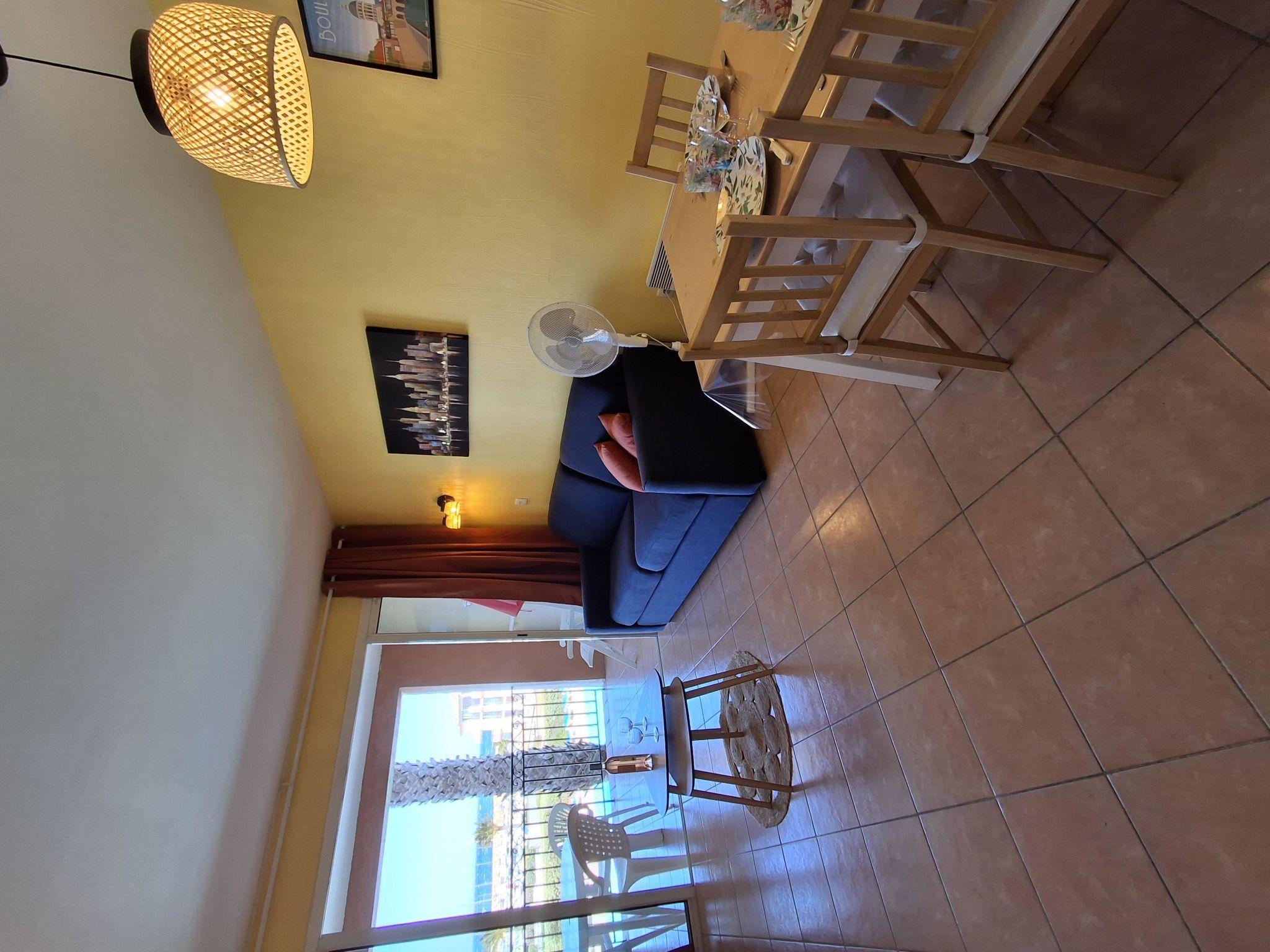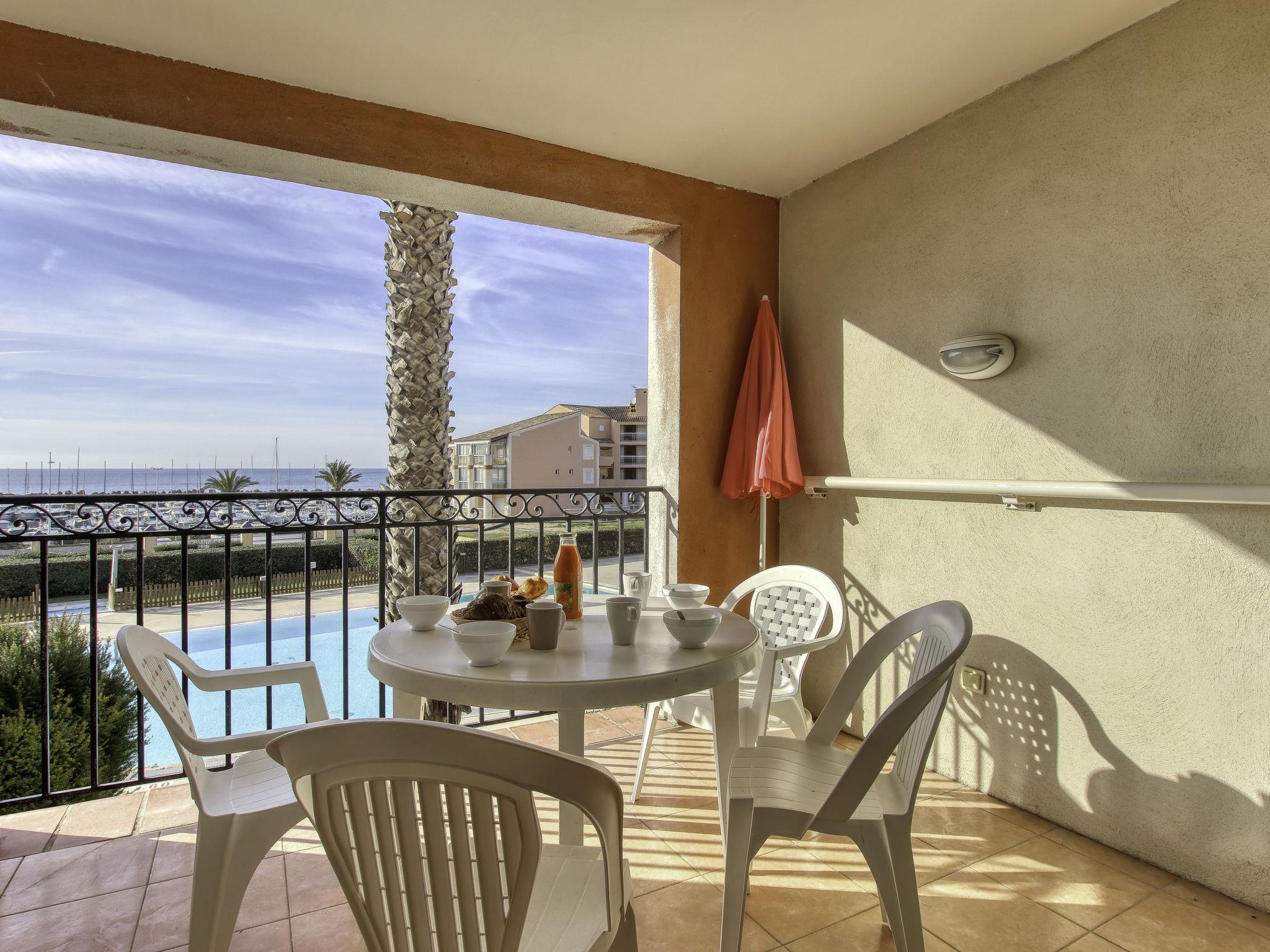 2-room apartment 32 m2 on 1st floor. Beautiful furnishings: living/dining room with 1 double sofabed (140 cm, length 190 cm), TV (flat screen). Exit to the terrace. 1 room with 1 french bed (140 cm, length 190 cm). Kitchenette (dishwasher, 4 ceramic glass hob hotplates, toaster, kettle, microwave, freezer, electric coffee machine). Bathroom, sep. WC. Electric heating. Terrace 9 m2, roofed, west facing position. Terrace furniture. Marvellous view of the sea and the swimming pool. Facilities: washing machine. Internet (WiFi, extra). Parking space n 454 (Niveau 1) (roofed), height 190 cm, width 232 cm. Please note: maximum 1 pet/ dog allowed. TV only FR. Smoke alarm.