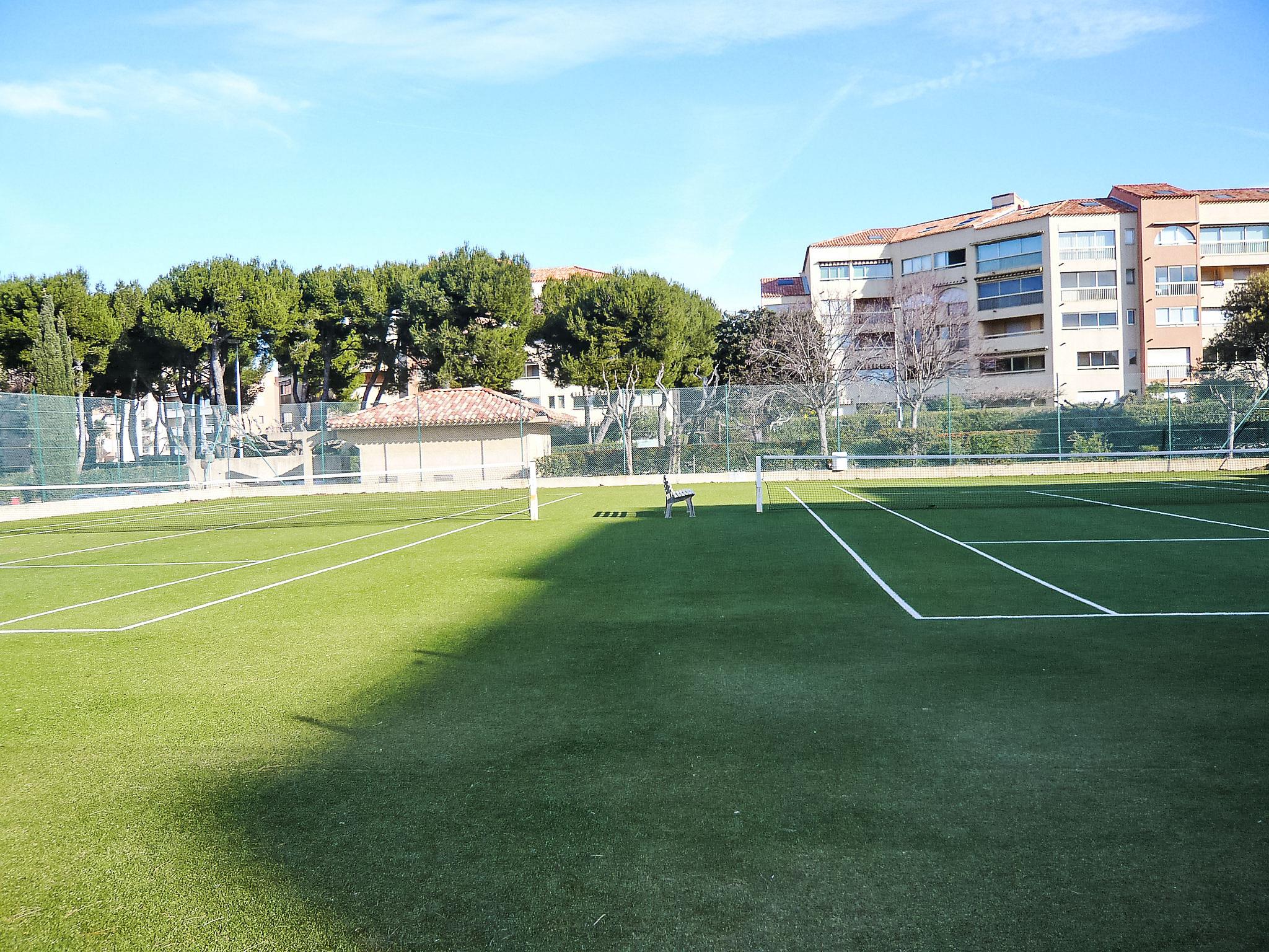 Swimming pool access: Morning: €2.50 - Afternoon: €3.50 - Full day: €4. 10 day passes for €35. Free for children under 4. Tennis access: Open from 8:00 am to 8:00 pm. €6 per hour per court. Reservations required at the swimming pool reception. Laundry facilities at the port of La Coudoulière, 100 m away. Residence "Les Marines d'Aryana", 2 storeys. 100 m from the sea, 100 m from the beach. For shared use: swimming pool fenced (20 x 10 m, seasonal availability: 01.Jul. - 31.Aug. pool opening hours: 09:30-19:30, extra). Tennis (01.Jul. - 30.Sep.) (extra), parking, public parking 50 m. Shop, grocery 300 m, supermarket 1 km, restaurant 200 m, bus stop 400 m, sandy beach "La coudoulière" 100 m. Tennis 50 m. Hiking paths: Sainte Baume, Sainte Victoire, Calanques Port-Cros, Porquerolles, Ile verte, Embiez, Figuerolles, Cassis. Please note: the keys‘ handover takes place by the agency Interhome in Six fours les plages, 3 km. The photograph shows a typical example.