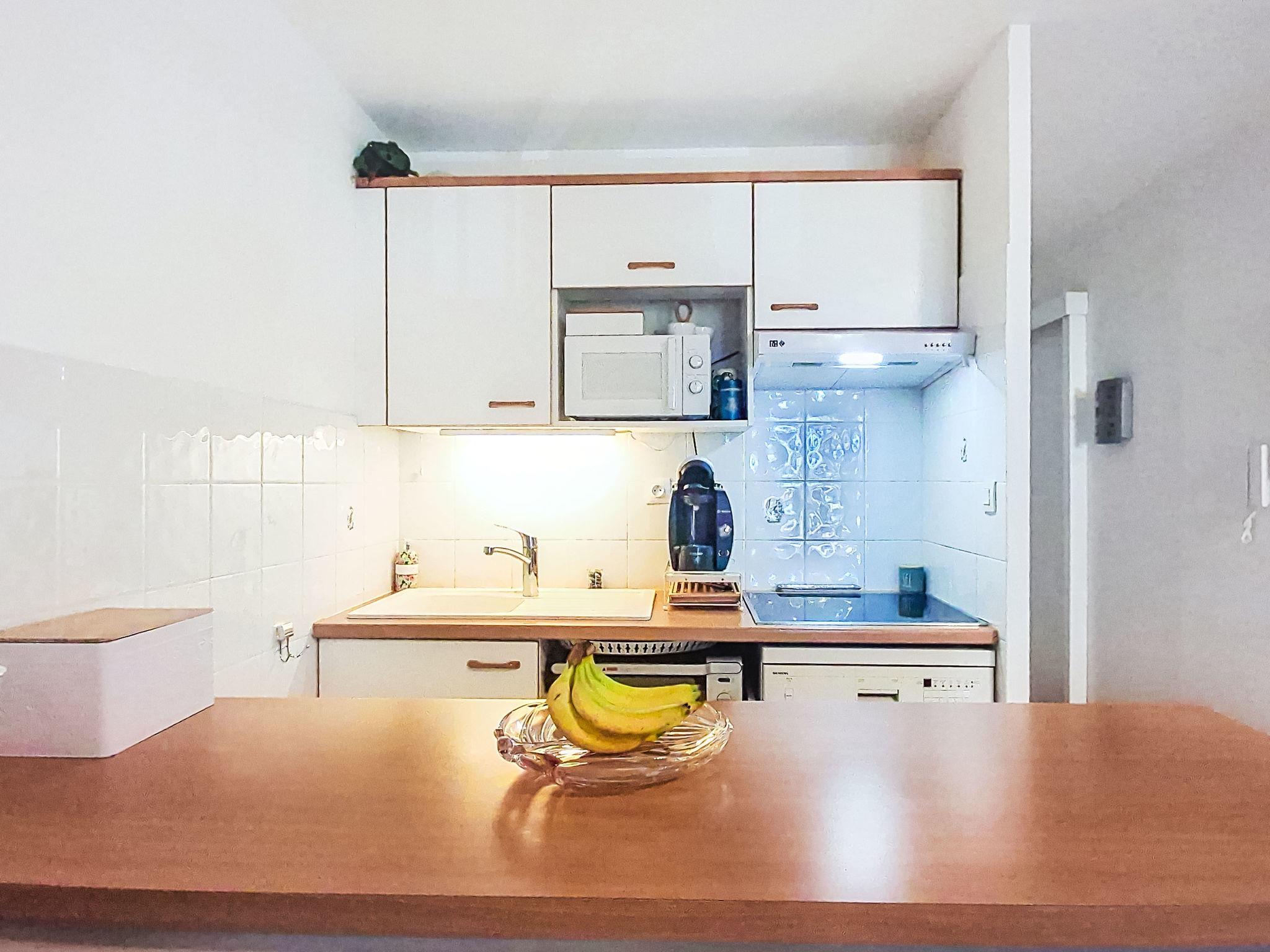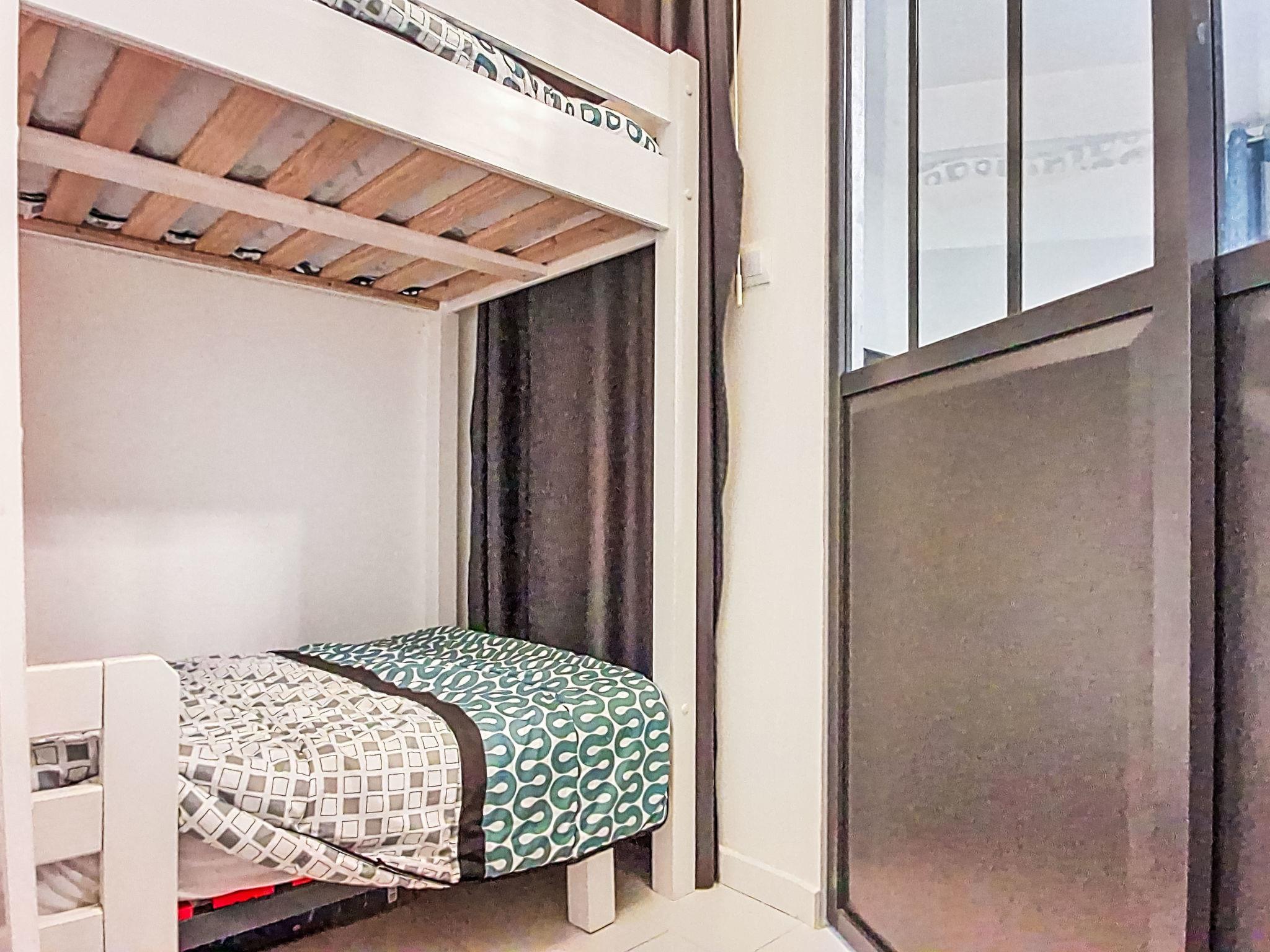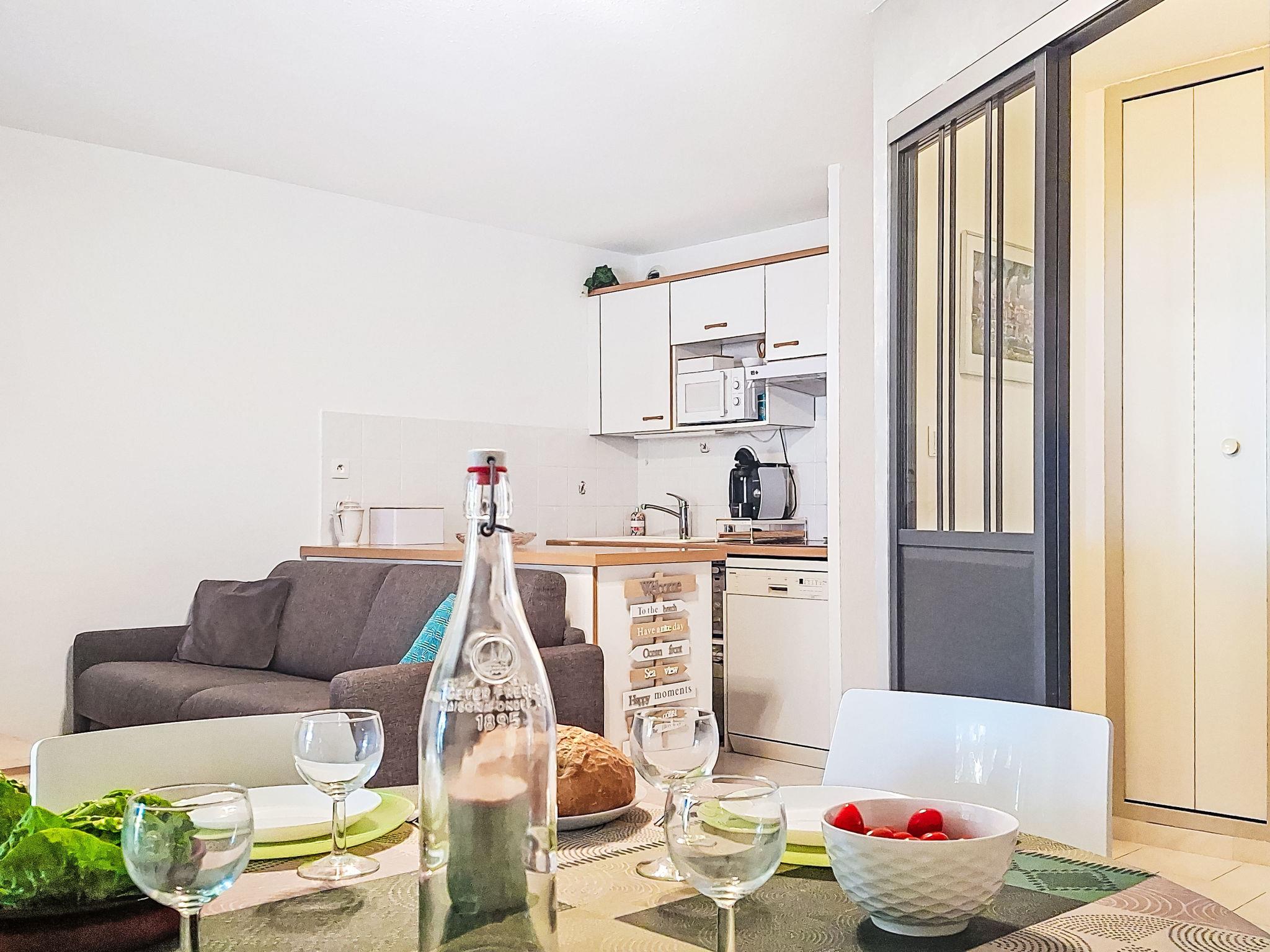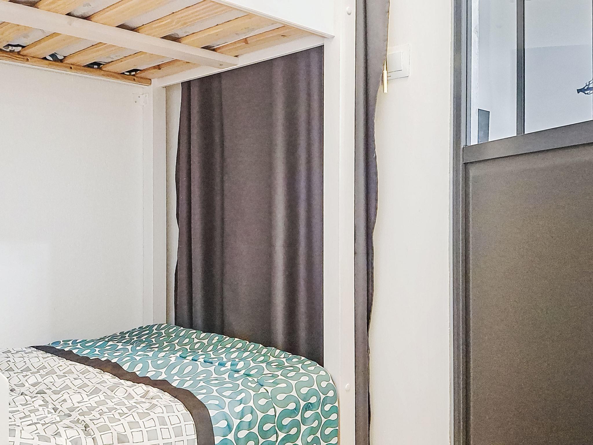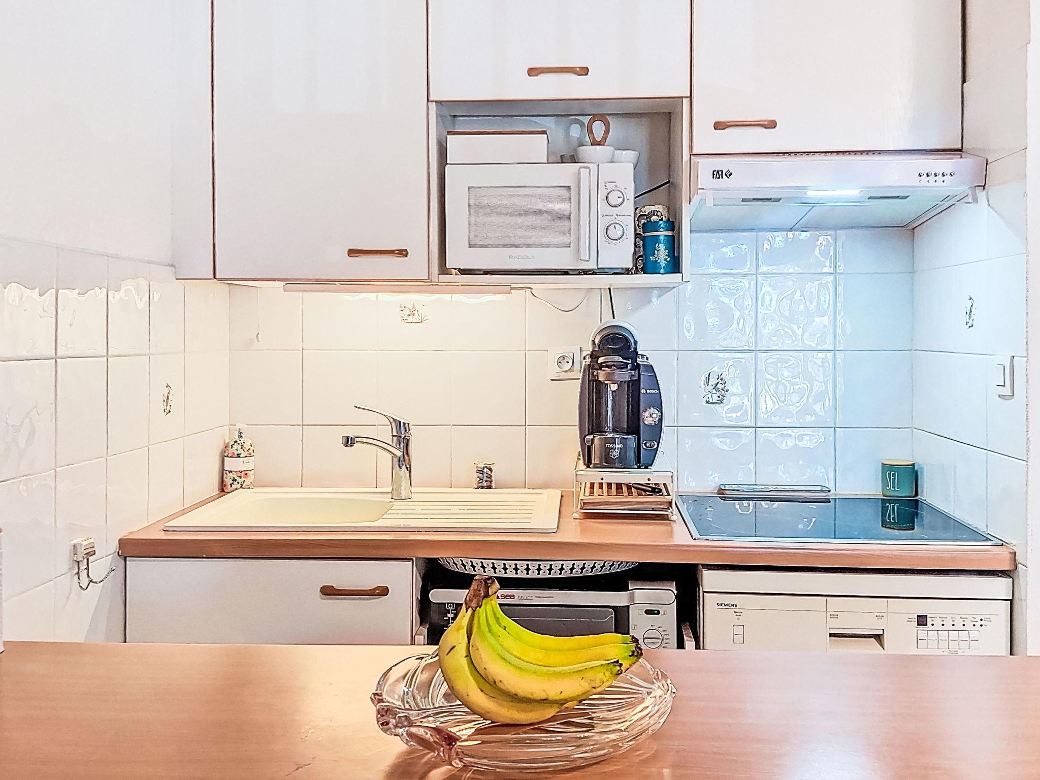 2-room apartment 45 m2 on 2nd floor. Comfortable furnishings: living/dining room with TV (flat screen). Exit to the terrace. 1 room with 1 french bed (160 cm, length 200 cm), fan. 1 small room with sliding door, window onto the living room with 1 x 2 bunk beds (90 cm, length 200 cm). Kitchenette (dishwasher, 3 ceramic glass hob hotplates, toaster, microwave, freezer, electric coffee machine, Capsules for coffee machine (TASSIMO) extra). Bathroom, sep. WC. Electric heating. Terrace 10 m2, roofed. Terrace furniture. Facilities: washing machine. Internet (WiFi, extra). Please note: TV only FR. Smoke alarm. Offer by a private individual according to Art. 155, IV of CGI.