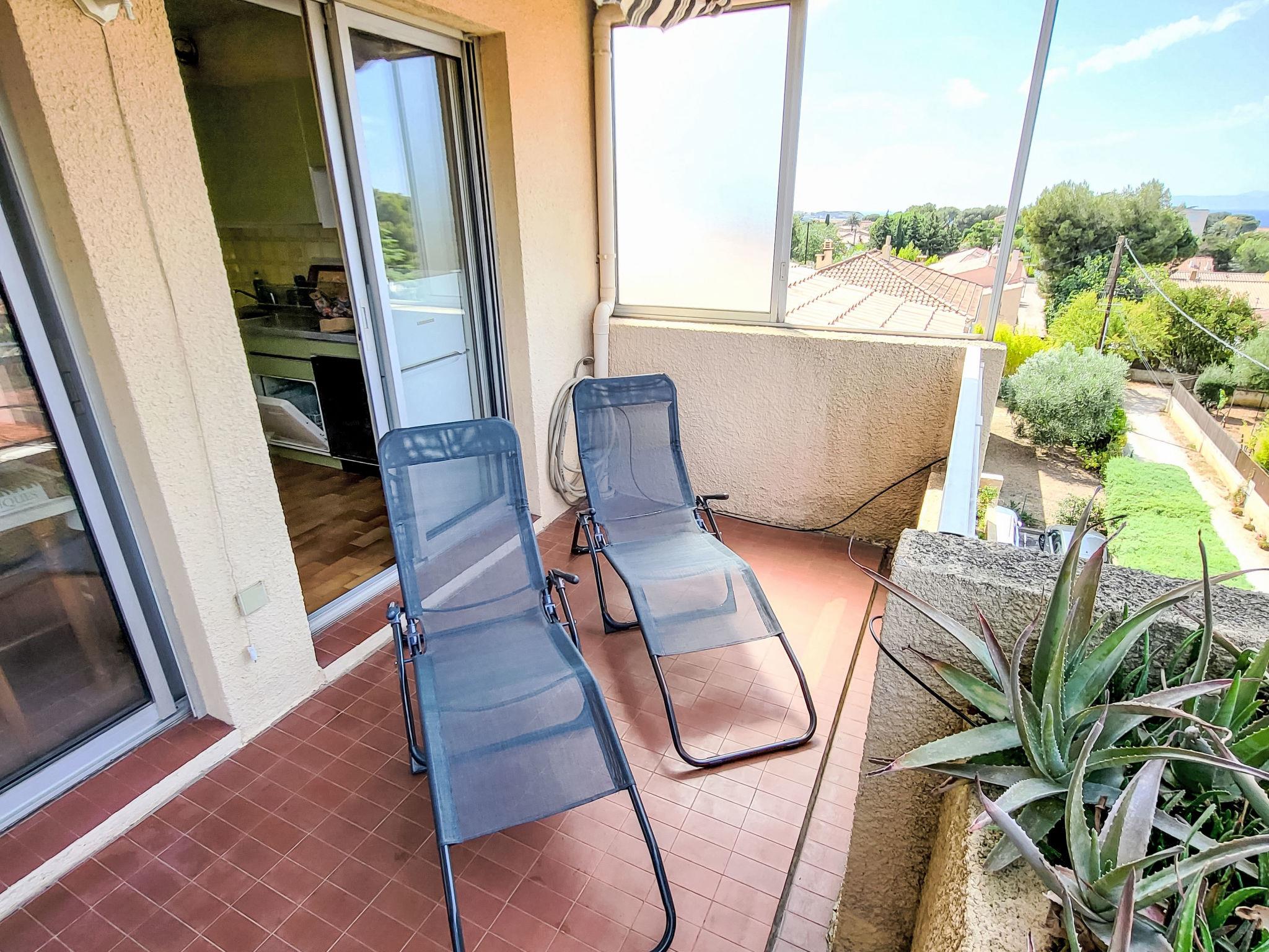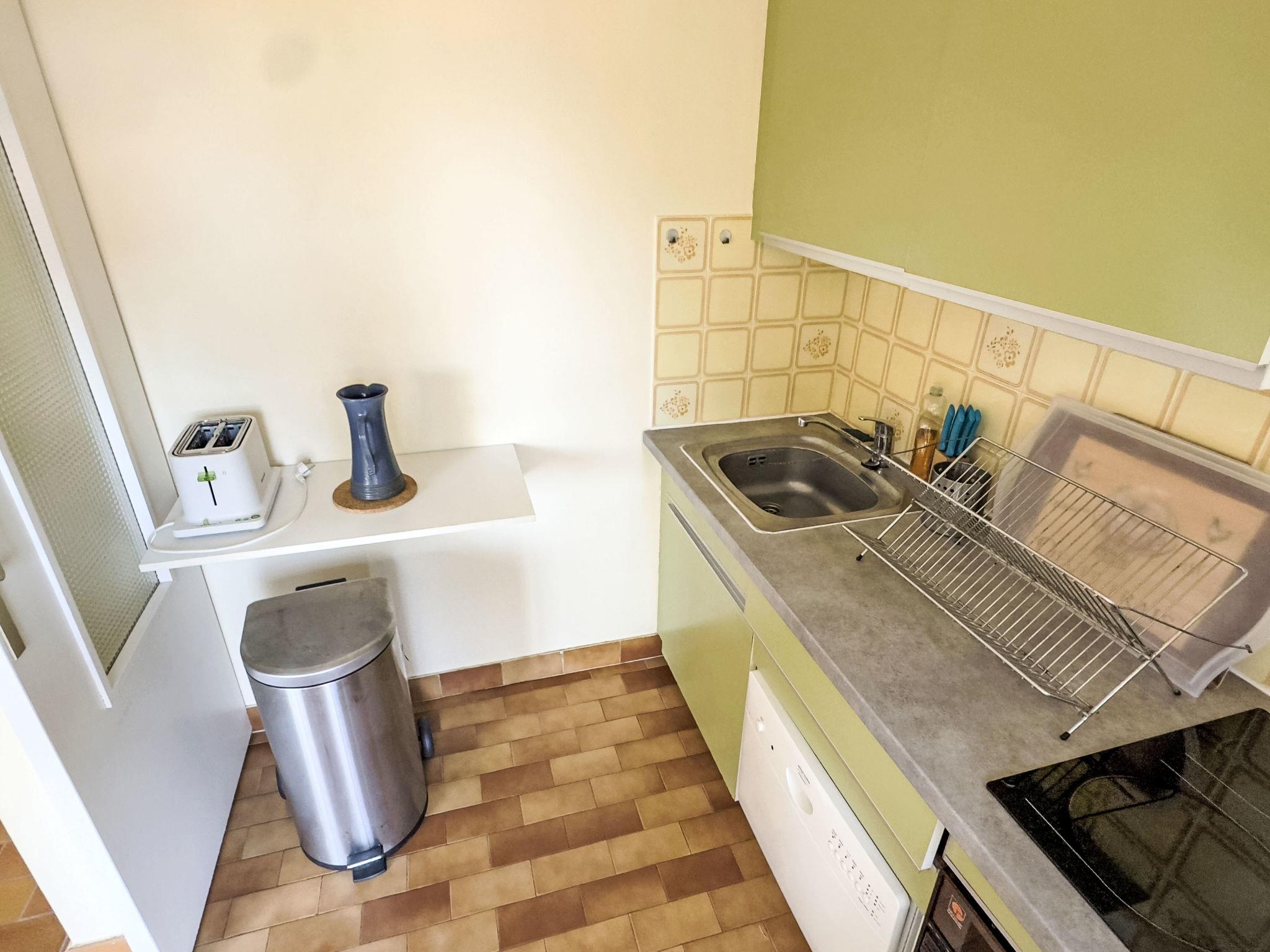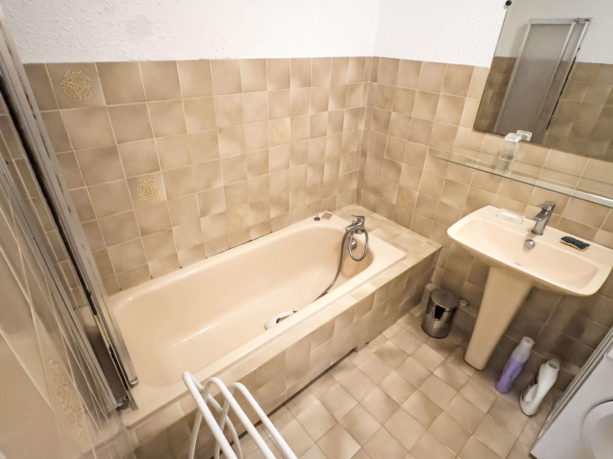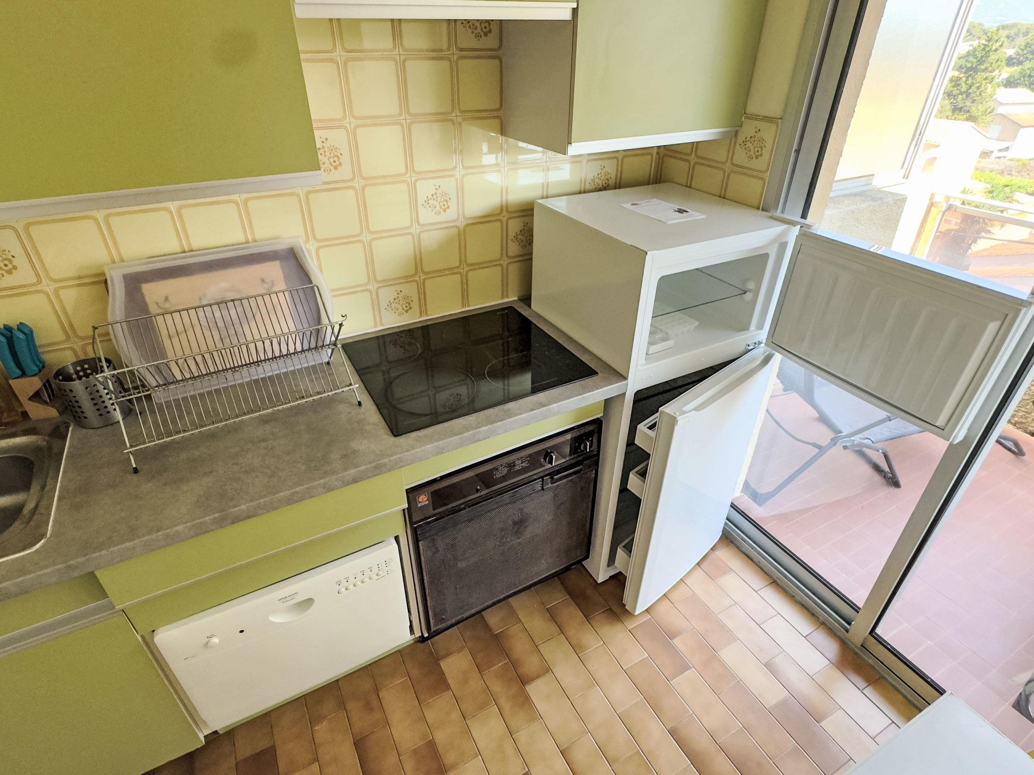 1-room apartment 28 m2 on 3rd floor. Comfortable furnishings: living/dining room with 1 sofabed (140 cm, length 190 cm), dining table and TV (flat screen). Exit to the veranda. Entrance hall with 1 bed (80 cm, length 190 cm). Kitchenette (2 ceramic glass hob hotplates, toaster, kettle, freezer, electric coffee machine, combination microwave). Bath/WC. Electric heating. Terrace 15 m2, roofed. Terrace furniture. Partial view of the sea. Facilities: washing machine. Internet (WiFi, extra). Please note: non-smokers only. TV only FR. Smoke alarm, no lift. Offer by a private individual according to Art. 155, IV of CGI.