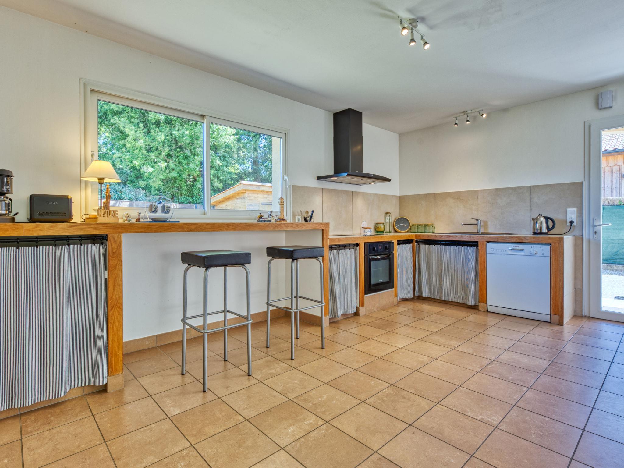"Mimosa", 4-room house 110 m2. Beautiful and cosy furnishings: living/dining room with panoramic window with dining table and satellite TV (flat screen), DVD and wood-burning stove. Exit to the garden. 1 room with 1 french bed (140 cm, length 200 cm). 1 room with 1 french bed (140 cm, length 190 cm). Exit to the garden. 1 room with 1 french bed (140 cm, length 200 cm), shower/WC. Open kitchen (oven, dishwasher, 3 induction hot plates, toaster, kettle, microwave, freezer, electric coffee machine) with bar. Shower, sep. WC, double hand-basin. Underfloor heating. Terrace furniture, barbecue (portable), deck chairs (6). Facilities: washing machine, iron, children's high chair, baby cot. Internet (WiFi, free). Please note: non-smoking house. Smoke alarm. Offer by a private individual according to Art. 155, IV of CGI.