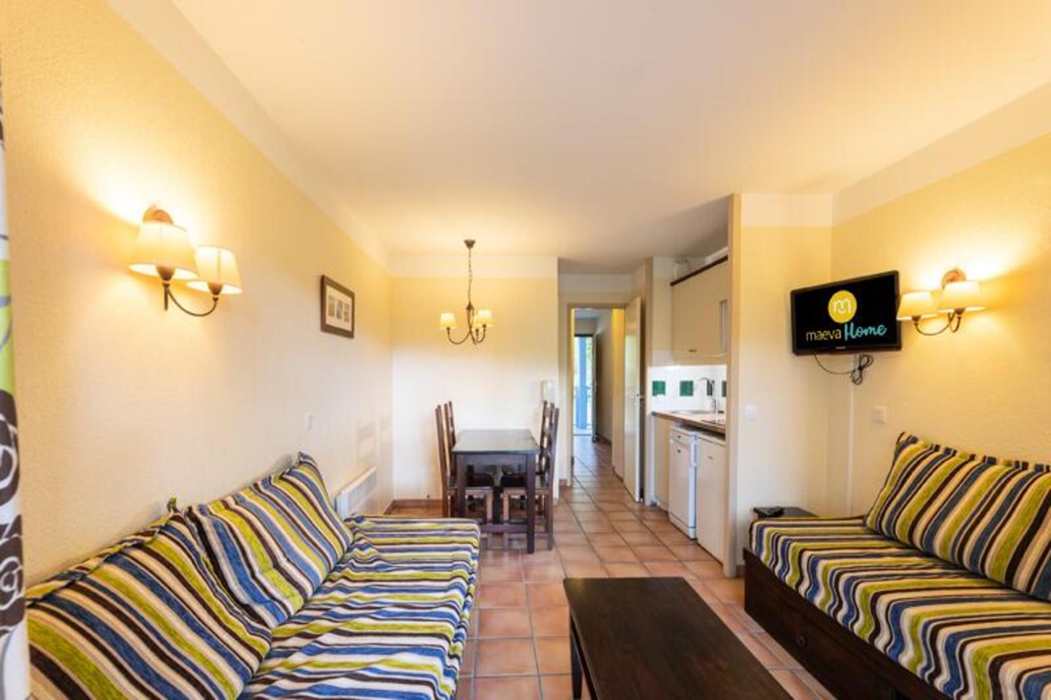 A stone's throw from the fine sandy beaches, the Le Domaine du Golf de Pinsolle residence is located on the edge of the golf course, 1 km from the Etangs marine lake. This holiday residence in Soustons offers quality accommodation in a calm and relaxing atmosphere. In the heart of a pine forest, this vacation rental in the South of Landes offers you a range of activities for young and old (at an additional cost): golf, tennis, horse riding... Free access to the outdoor swimming pool heated (with paddling pool, solarium, terrace...). is also planned for accommodation tenants, open from mid-June until 10/15/2024. An ideal destination on the Silver Coast, Soustons is a town with a thousand facets set in an exceptional setting: vast sandy beaches all along the ocean, beautiful tree-lined pine forests, marine lakes... Some ideas for walks for hiking enthusiasts: Étang de Soustons: Walk around this large pond surrounded by pine forests. There are marked trails for hikers and cyclists. Adour Trail: A hike along the Adour allows you to discover the beauty of the Landes landscapes. Your vacation rental includes: 1 living room, 1 kitchen, 1 bedroom, 1 bathroom, 1 toilet, 1 balcony and parking. The advantages of your rental: Apartment for 5 people benefiting from a south-facing balcony, view of the forest, located near the golf course and access to the residence's swimming pool (depending on opening period). Area: 30 m². Location: Floor of accommodation: 1st floor Beach or slope access: No Town or village center: No Distance from slopes to sea: >500m Distance to business: >500m Distance activities: between 100m and 500m Cycle paths: nearby Number of housing levels: Single storey Composition of the stay: Standard sofa: Yes Seating places on the sofa: 2 Convertible sofa: Yes Number of beds on the convertible sofa: 2 sofa beds including 1 with trundle bed (3 beds) Table in the dining room: Yes Number of chairs (or stools): 5 Coffee table: Yes Fireplace: No Meal side: Type of cuisine: Semi-Open Table in the kitchen: No Number of chairs in the kitchen: 0 Composition of the rooms: Bedroom 1: Single beds bedroom 1: No Double beds bedroom 1: 1 Bunk beds bedroom 1: No Composition of the bathroom: Condition of the main bathroom: Good condition A private water closet inside the accommodation: Yes A second private bathroom with independent access: No A second water closet: No Exteriors: Balcony: Yes Opposite balcony: No Balcony view: Forest Balcony orientation: South Parking dedicated to accommodation: No Type of Parking: Outdoor How would you describe the brightness of the accommodation as a whole? : Normal maeva Home Confort label: good value for money. Correct services, accommodation maintained and equipped with the main amenities. The essentials for a vacation at the best price. Wifi access - With supplement - subject to availability. Pets allowed - In addition, inquire directly with the residence for prices. Bed linen - Additional charge - Cover, sheet or duvet cover and pillowcase (contents may vary depending on accommodation) Towels - Extra charge. Possibility of changing daily linen available, inquire at reception for prices. End of stay cleaning - Mandatory cleaning service to be paid upon check-in or upon arrival. Parking - Free outdoor parking located within the residence. Swimming pool - Heated outdoor swimming pool within the residence (open mid-June until 10/15/2024 with paddling pool, solarium, terrace, etc.) - Included. Tourist tax (additional charge) - Payment of the tourist tax is made via your personal space: https://mon-compte.maeva.com, the amount varies depending on the location. Free for under 18s. Television - Depending on accommodation. Deposit (in euros) - 500 End of stay cleaning - Mandatory cleaning service to be paid upon check-in or upon arrival. Bed linen - Additional charge.
