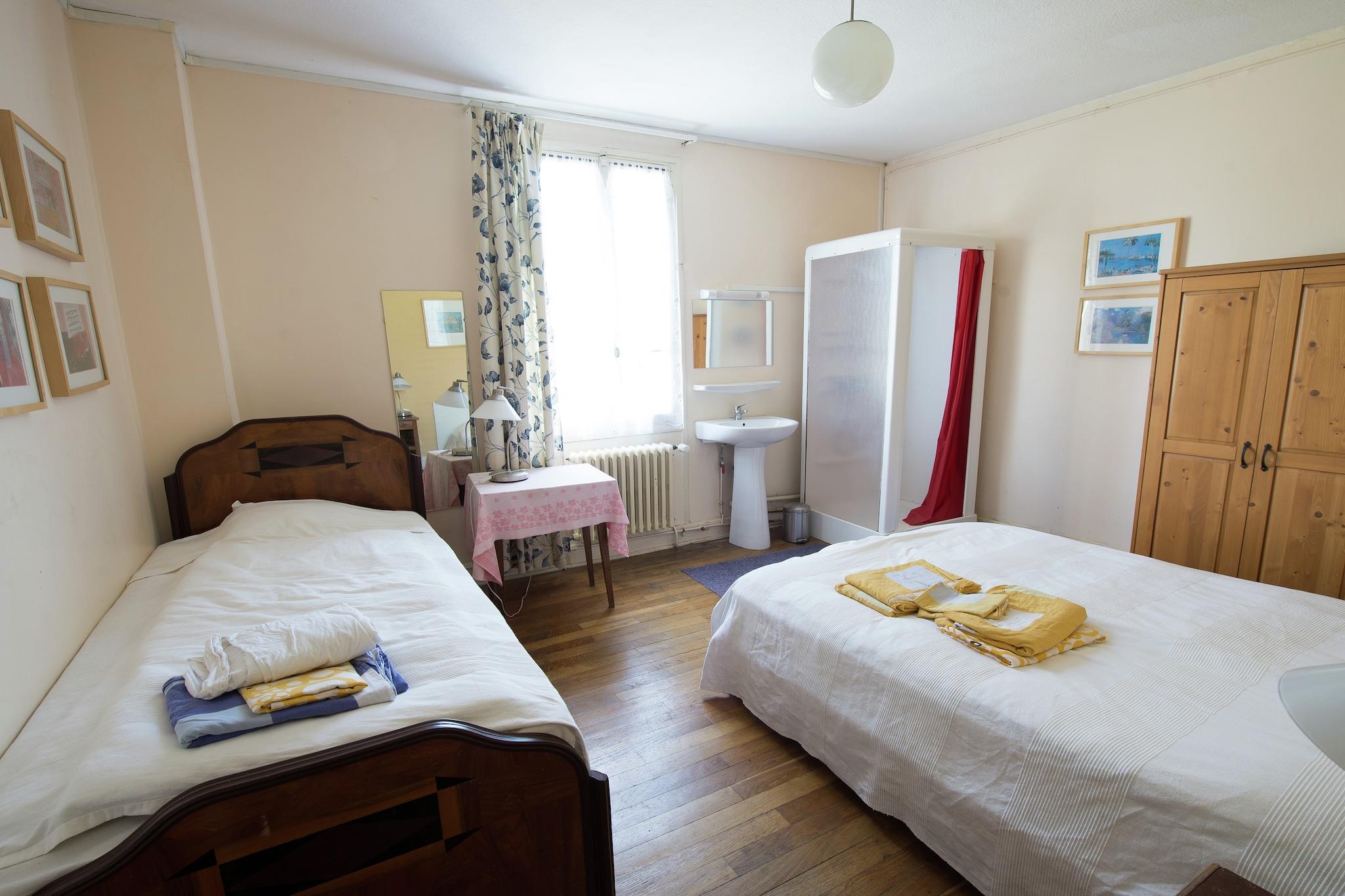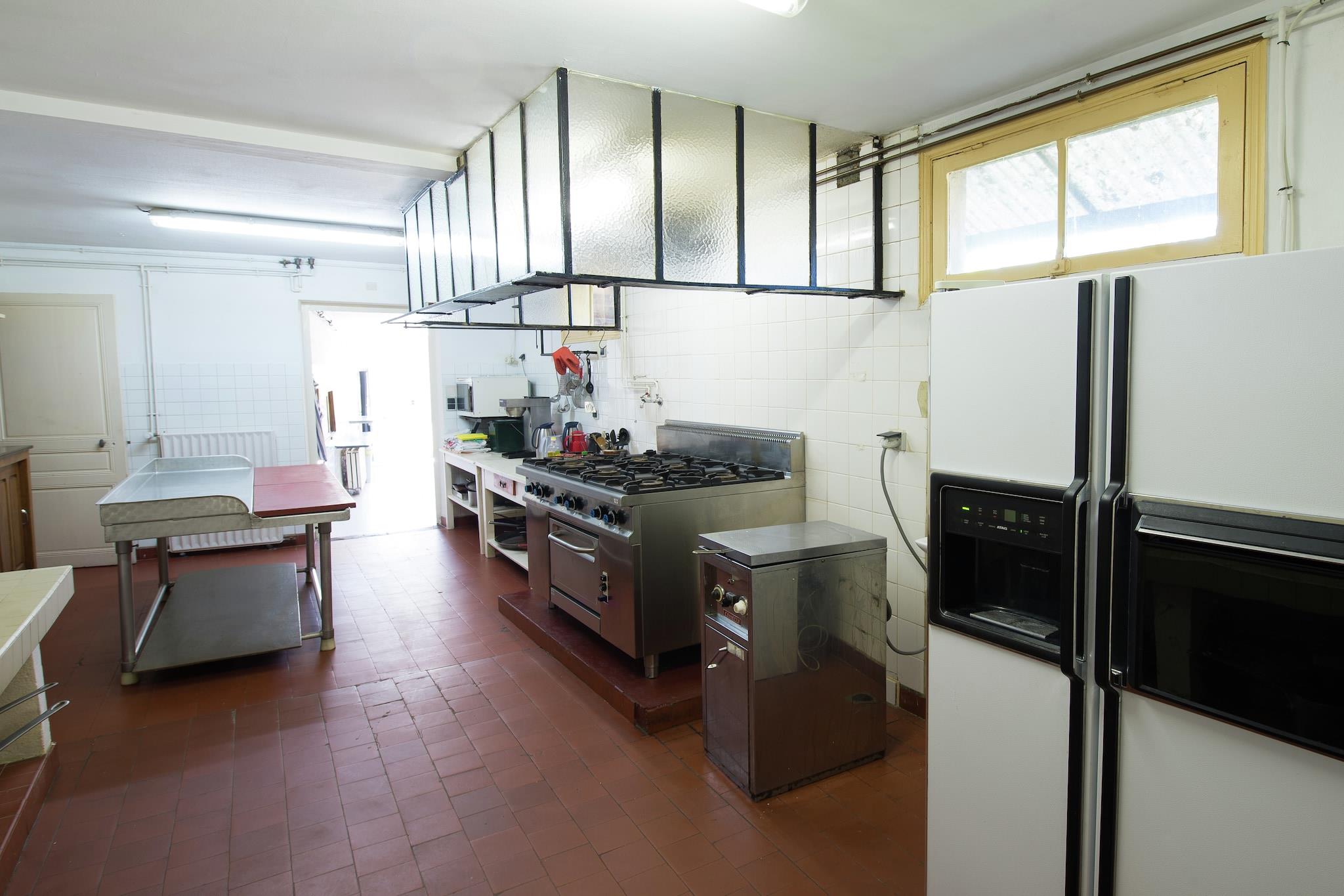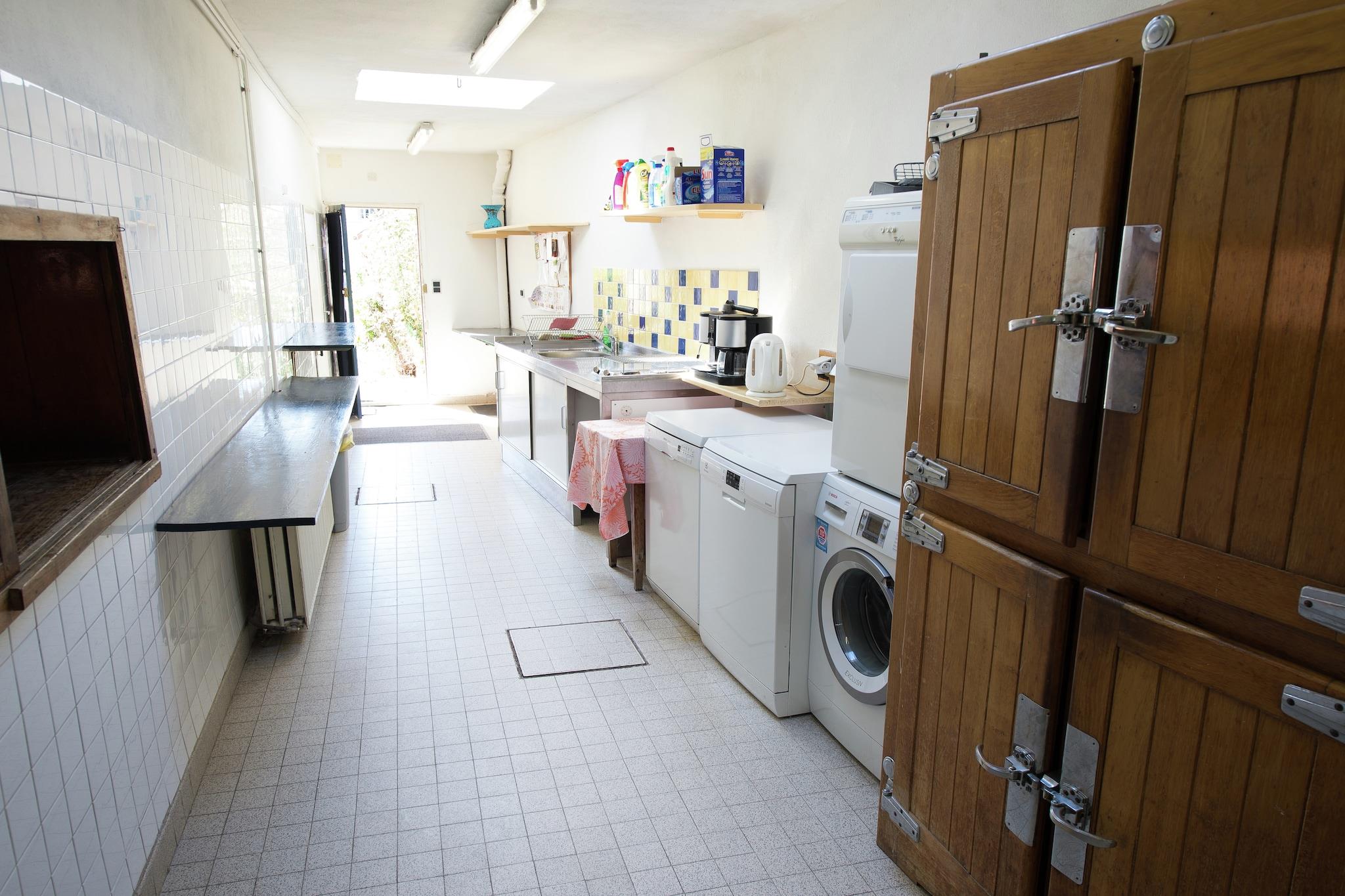 Ground floor: (hallway, Sitting room(TV(satellite)), dining room(fireplace, stereo unit), Kitchen(coffee machine, oven, microwave, microwave, dishwasher), bedroom(2x single bed, shower, washbasin, toilet), toilet, pantry(dishwasher, fridge-freezer, tumble dryer, washing machine), pantry(fridge-freezer)) On the 1st floor: (bedroom(3x single bed, shower, washbasin), bedroom(3x single bed, shower, washbasin), bedroom(single bed, bunk bed, shower, washbasin), bedroom(single bed, double bed, shower, washbasin), bedroom(3x single bed, washbasin), bedroom(2x single bed, shower, washbasin), walk-through bedroom(double bed, shower, washbasin), walk-through bedroom(double bed, shower, washbasin), bathroom(bath tub, shower), toilet) On the 2nd floor: (bedroom(3x single bed, washbasin), bedroom(3x single bed, washbasin), bathroom(bath tub), toilet) fireplace, washing machine, garden(fenced), garden furniture, BBQ, parking, boules court, play equipment, table tennis table, table football, table football, children's bed, children's bed, high chair, ironing board