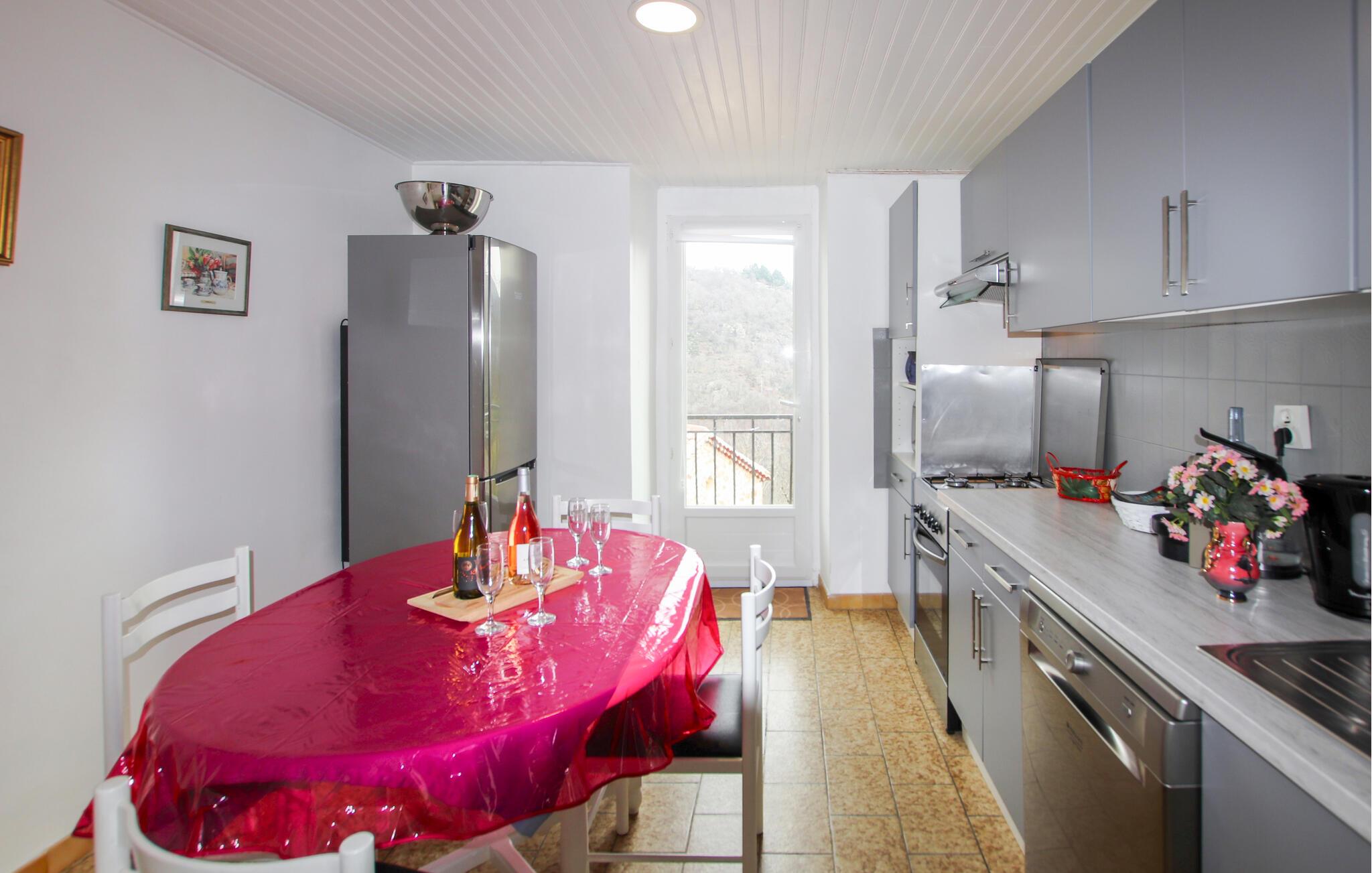 Dieses Anwesen mit historischem Flair, im Regionalpark Monts d’Ardèche oberhalb eines wilden Flusses gelegen, ist wie geschaffen für einen ruhigen Urlaub inmitten der Natur. Entspannen Sie im hellen und mit hochwertigen Möbeln und einem gemütlichen Kaminofen eingerichteten Wohnbereich. Verbringen Sie gesellige Abende, streamen Sie Serien oder genießen Sie vom Balkon aus den weiten Panoramablick.