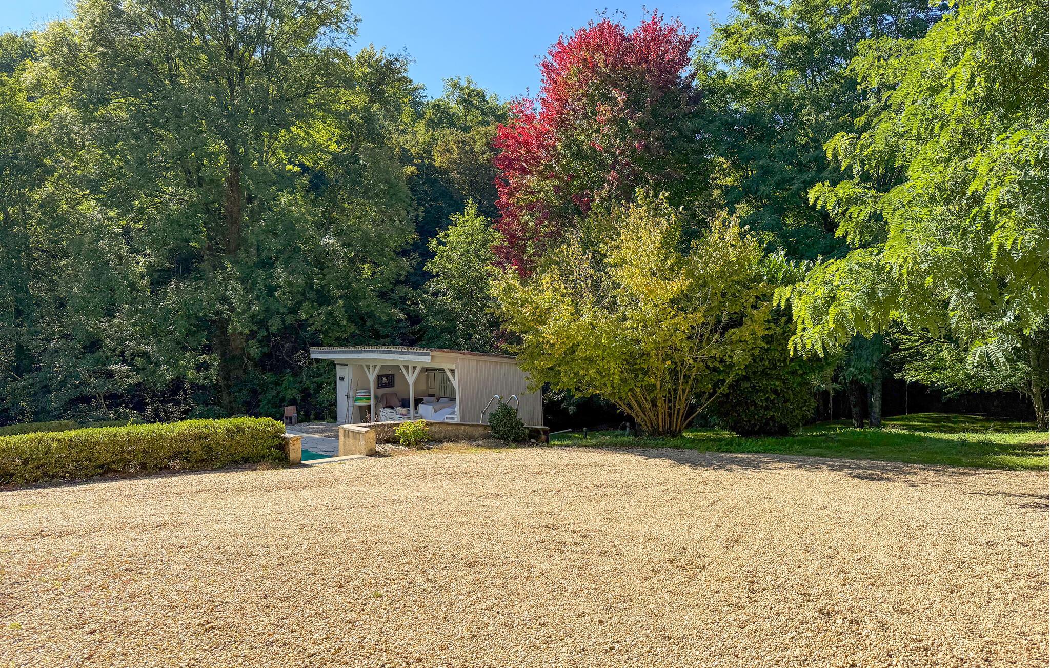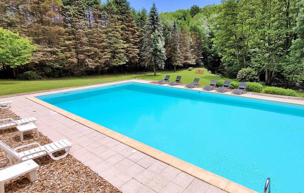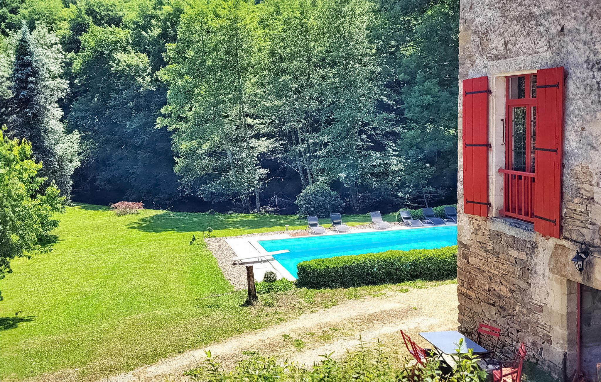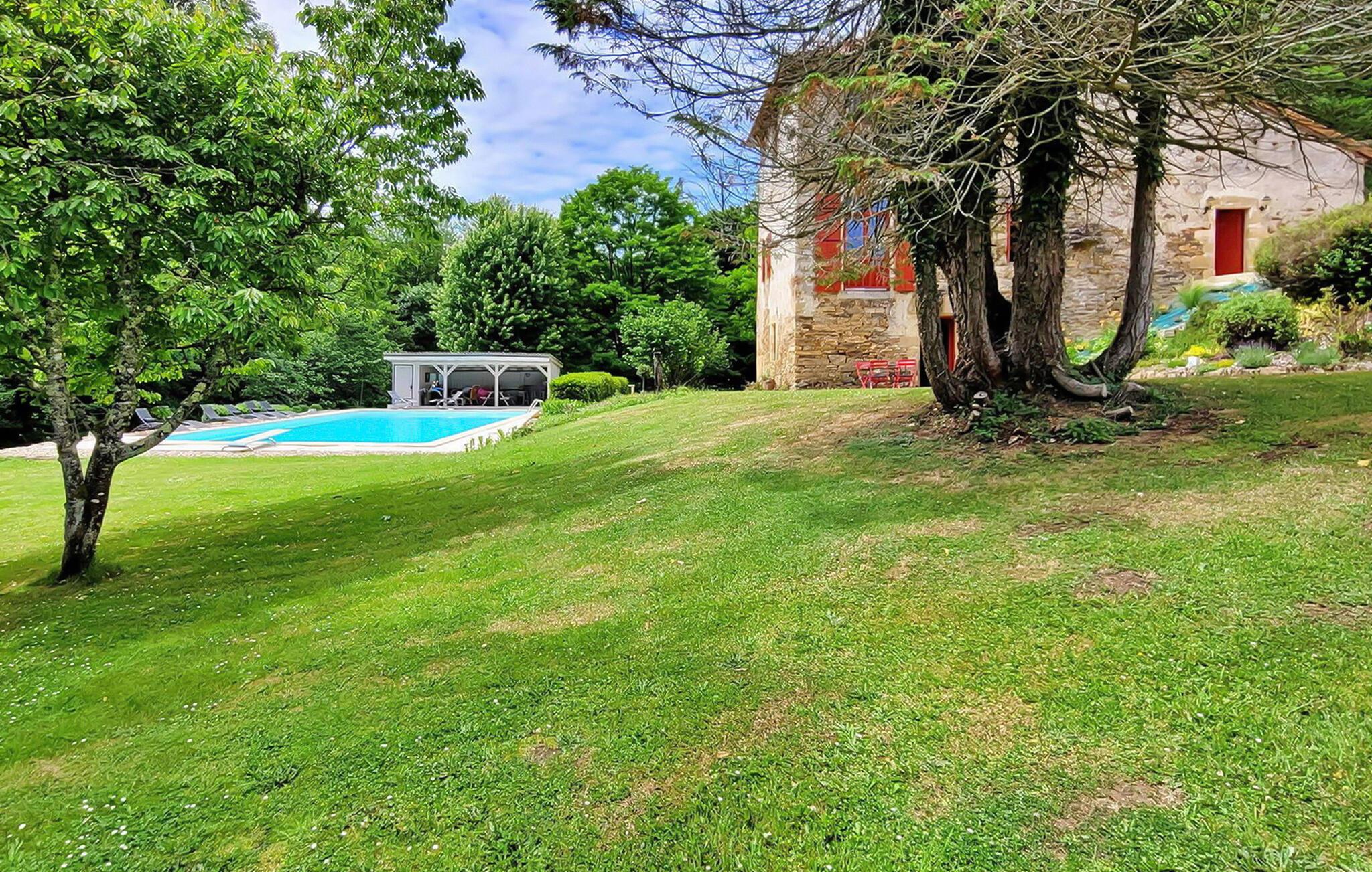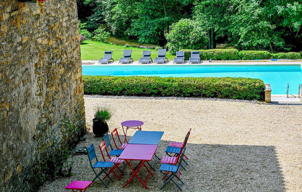 Dieses Landhaus in Saint-Paul-la-Roche, Grünes Perigord Vert, verfügt über einen großen privaten Pool (18 x 8 m), eingebettet in eine natürliche Umgebung entlang des Flusses L'Isle. Das Anwesen verfügt über eine gut ausgestattete Küche mit direktem Zugang ins Freie und ein geräumiges Ess-/Wohnzimmer mit Kamin im Erdgeschoss. Die komfortablen Schlafzimmer befinden sich im ersten und zweiten Stock. Im Außenbereich bietet das Anwesen einen großen Garten mit einem Waldgebiet und einen weitläufigen Pool, der von einem 800 m langen Flussufer begrenzt wird und über ein Sprungbrett und Nachtbeleuchtung verfügt. Das Anwesen umfasst auch ein überdachtes Poolhaus mit Essbereich und eine Bar mit Kühlschrank sowie Sonnenliegen und eine Plancha zum Kochen im Freien. Mit dem bereitgestellten Tisch und den Liegestühlen können Sie ein Picknick am Fluss genießen. Das Anwesen verfügt über mehrere Terrassen mit Sitz- und Essbereichen, die eine schöne Aussicht und einfachen Zugang zur Küche und zum Essbereich bieten. Orte, die Sie während Ihres Aufenthalts besuchen sollten: Brantome: Das Venedig des Périgord. Charmante Stadt mit idyllischer Atmosphäre, in der Sie spazieren gehen, einkaufen und essen können, aber auch eine schöne Kanufahrt unternehmen können. Die Brücken, die die Kanäle überspannen, führen Sie zu den vielen Terrassen, wo Sie die lokale Küche probieren können. Jeden Freitagmorgen gibt es einen schönen Markt. Jumilhac-le-Grand: Diese mittelalterliche Stadt verfügt über ein wunderschönes Schloss und einen großen zentralen Platz mit Terrassen. Das Goldmuseum organisiert Einführungen in das Goldwaschen im Fluss. Buchen Sie rechtzeitig. Thiviers ist die Hauptstadt der Gänseleberpastete. Jeden Samstag gibt es einen traditionellen Bauernmarkt mit vielen regionalen Produkten.