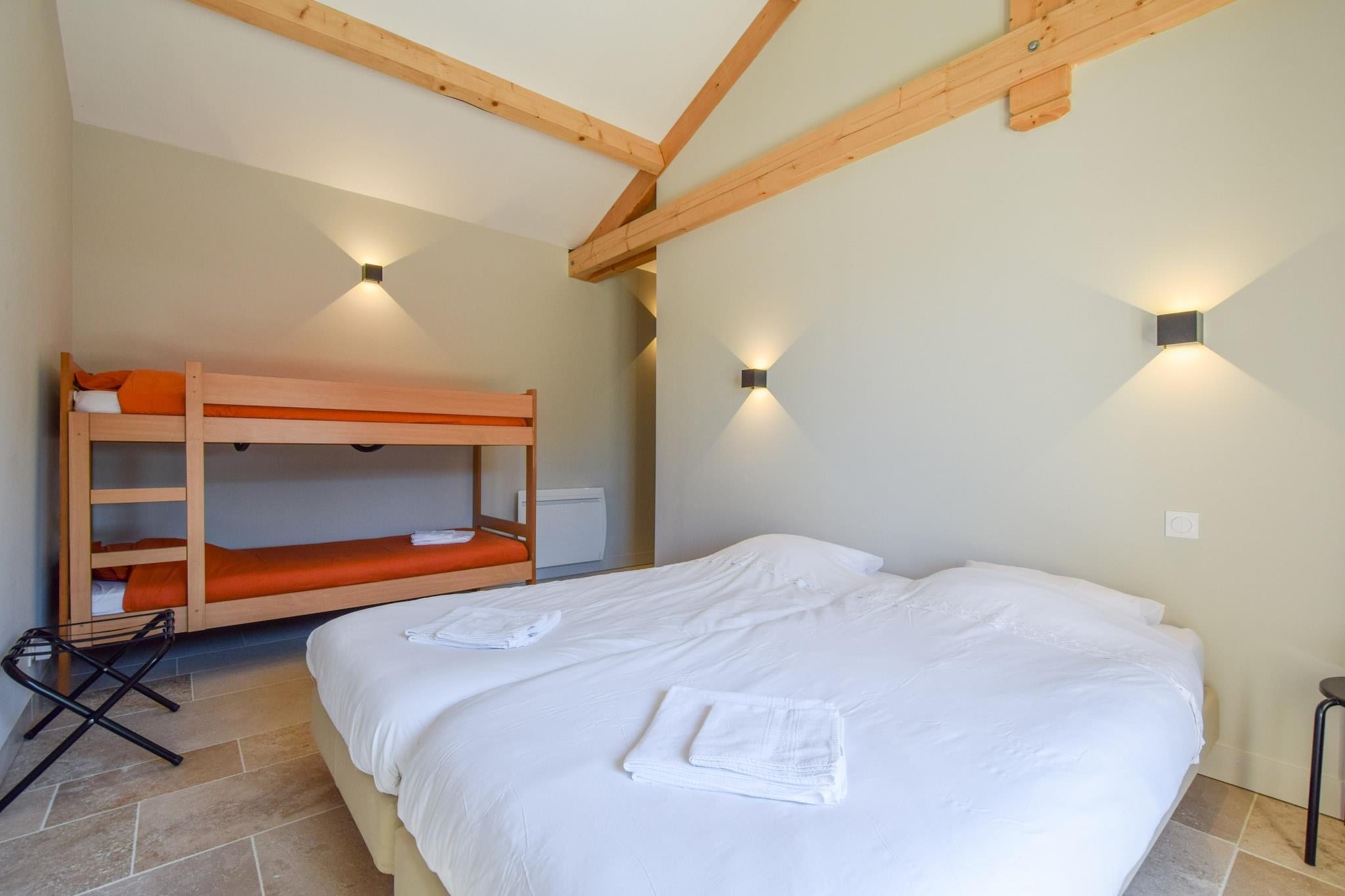 Ground floor: (Living room(TV(satellite, dutch television channels, international television channels), fireplace), open kitchen(hob(induction), coffee machine, combination microwave, dishwasher, fridge-freezer, washing machine), Bedroom with bathroom(single bed(90 x 220 cm), single bed(90 x 220 cm), shower, washbasin, washbasin, toilet), Bedroom with bathroom(single bed(90 x 220 cm), single bed(90 x 220 cm), shower, washbasin, toilet), Bedroom with bathroom(single bed(90 x 220 cm), single bed(90 x 220 cm), bunk bed, shower, washbasin, washbasin)) heating(electric, wood), terrace(private, roofed), garden(private), garden furniture, BBQ(charcoal), parking, trampoline(shared with other guests), swimming pool(private, heated, opened from May upto and including Sep), tennis court(shared with other guests), boules court(shared with other guests), play equipment(shared with other guests), bicycles available(on request), children's bed(on request), high chair(on request)