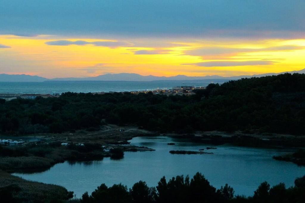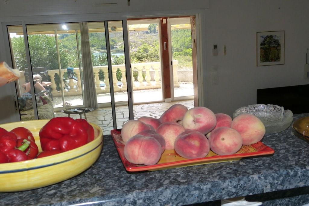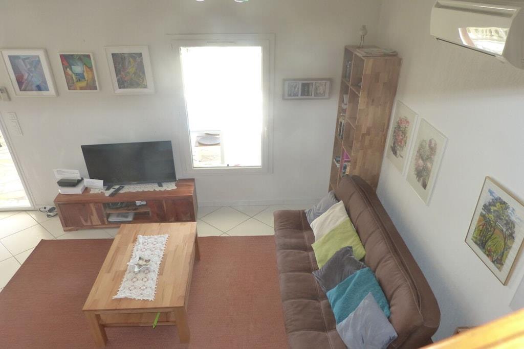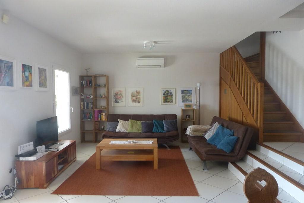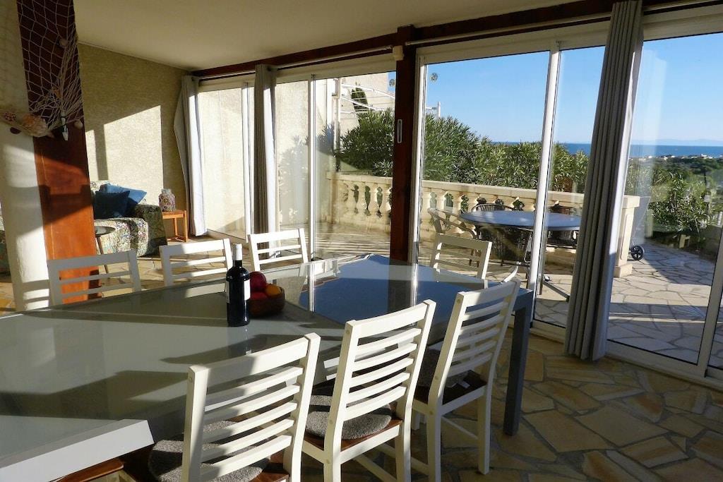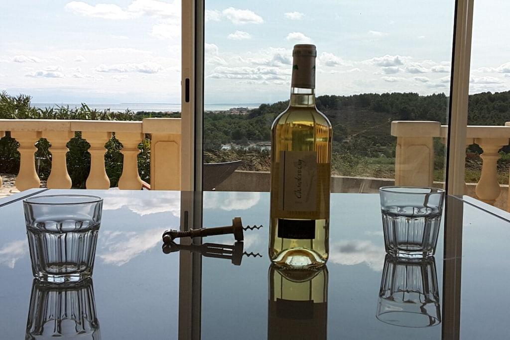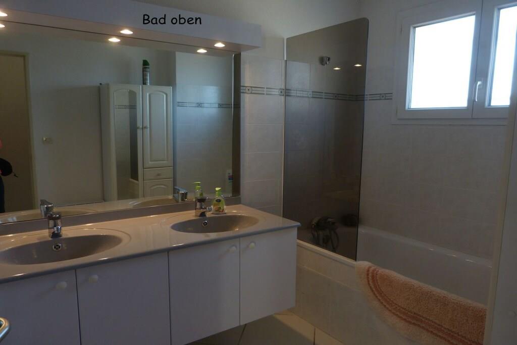 Sie wohnen auf 132 qm mit 4 Schlafzimmern,einem großen Wohn-/ Esszimmer und ca. 30qm ganzjährig bewohnbarem Wintergarten. Vom Wohnzimmer und Wintergarten im Erdgeschoss aus hat man einen fantastischen Blick auf das Meer, den See, das Clape-Gebirge bis hin zu den Pyrenäen. Drei Terrassen mit Gartenmöbeln, eine davon mit Pool, lassen jederzeit zwischen Sonne und Schatten wählen. Die beiden Südterrassen bieten einen herrlichen Panoramablick über See, Meer, Garrigue des Clape-Gebirges und Pyrenäen. Im Erdgeschoss befinden sich das Wohnzimmer mit 2 Klappsofas, Couchtisch und Fernseher, W-Lan sowie das Esszimmer mit Esstisch für ca. 8 Personen, der Wintergarten mit Klappsofa u. großem Esstisch für 8 bis 14 Personen, eine Einbauküche (Mikrowelle, Ceran-Kochfeld, Backofen, Kühl- und Gefrierkombination, Geschirrspüler), ein Bad mit Dusche, ein WC, 1 kleines Schlafzimmer mit Doppelbett (1,40m x 1,90m) und eine als Abstellraum dienende Garage, wo auch die Waschmaschine steht. Im Obergeschoss befinden sich drei Schlafzimmer (2 davon mit Balkon u. Meer- und Seeblick, eines mit Meerblick); zwei Zimmer beherbergen je ein Doppelbett (1,60 x 1,90; 1,60 x 2m), im dritten Schlafzimmer steht ein Etagenbett (unten Doppelbett mit 1,40m x 2m, oben Einzelbett mit 90cm x 2m). In zwei Schlafzimmern befindet sich außerdem noch je ein Sekretär. Ebenfalls im Obergeschoss liegt noch ein weiteres Badezimmer mit Badewanne und Duschtrennwand sowie Doppelwaschbecken und ein separates WC.