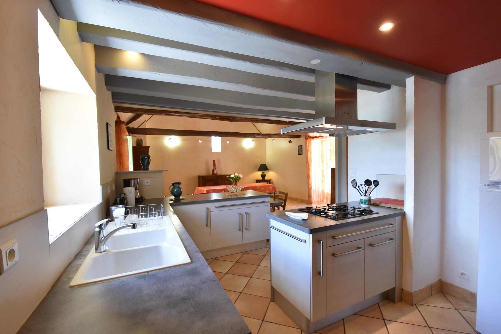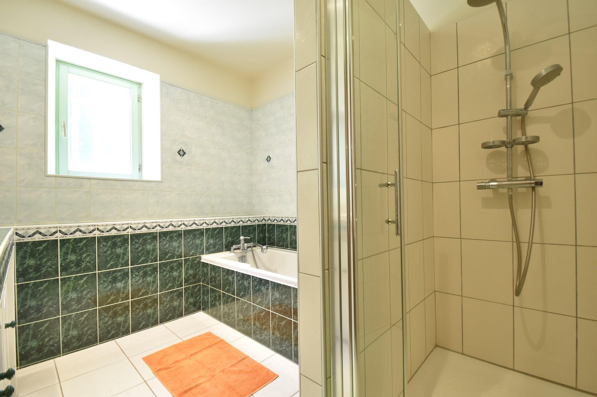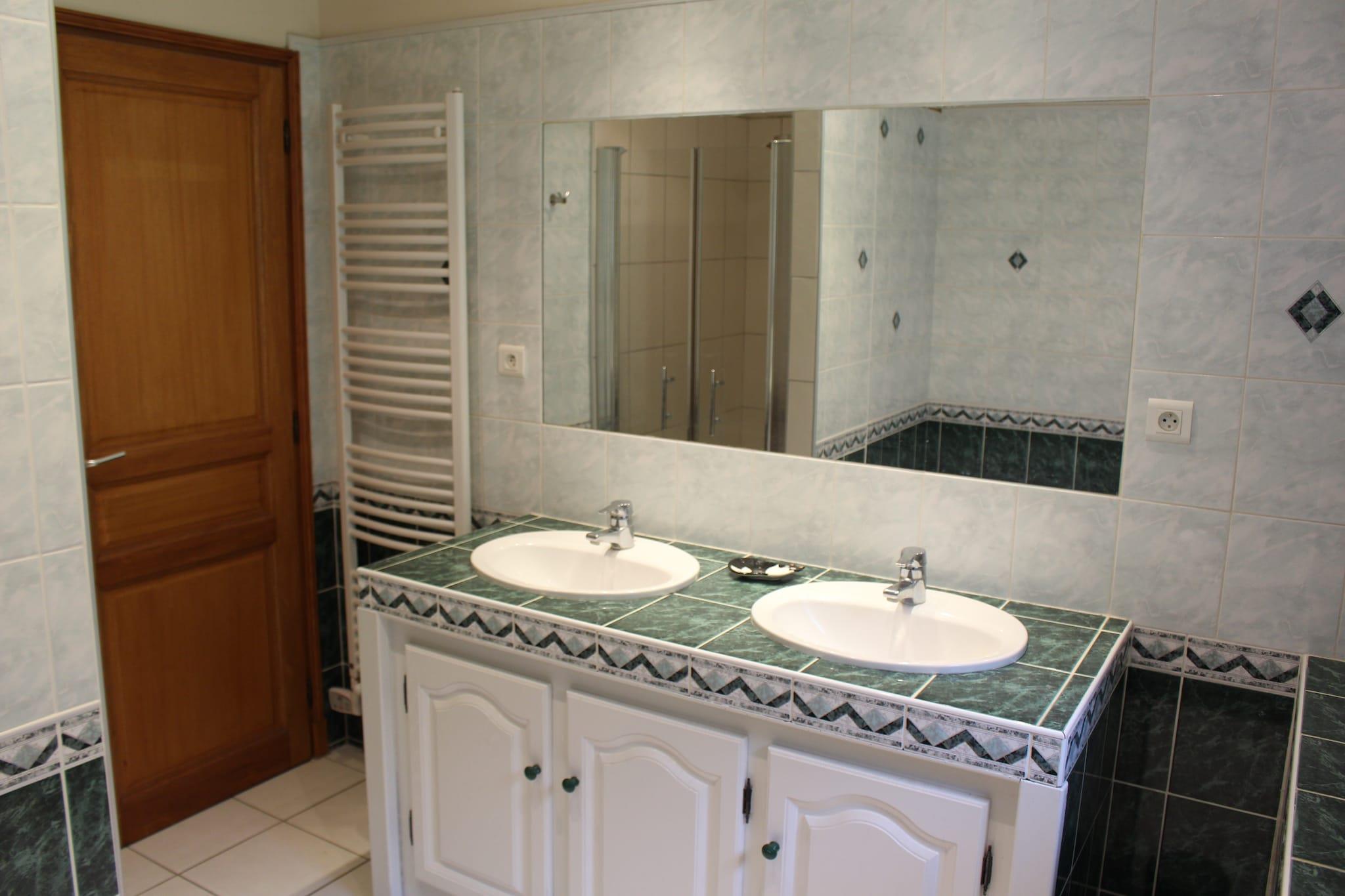 Ground floor: (Sitting room(TV(no dutch television channels), DVD player, radio, CD player), dining room, open kitchen(coffee machine, oven, microwave, dishwasher, fridge-freezer), bedroom(double bed(160 x 200 cm)), bedroom(2x single bed(90 x 190 cm)), bedroom(double bed(140 x 190 cm)), bathroom(bath tub, shower, 2x washbasin), mezzanine) toilet, washing machine, heating(floor heating), terrace(roofed), terrace, garden, garden furniture, BBQ, swimming pool(shared with other guests, 10 x 5 m., opened from 1/2 May upto and including Sep), boules court, play equipment, table tennis table