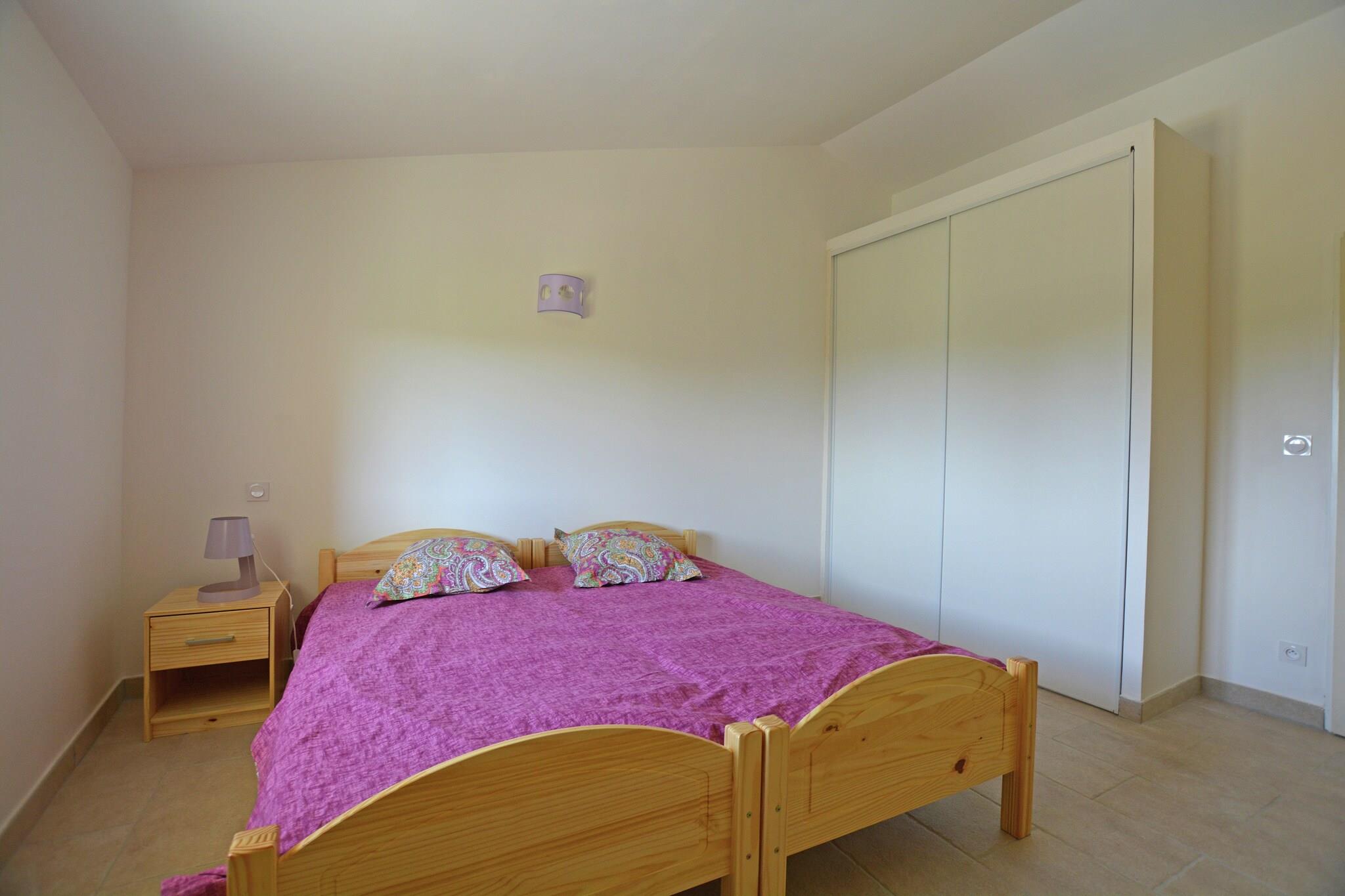 Ground floor: (open kitchen(cooker(4 ring stoves, gas), coffee machine, oven, microwave, dishwasher, fridge-freezer), Living/diningroom(TV, dining table, radio), bedroom(bunk bed), bathroom(shower, washbasin, air conditioning), toilet, garden doors) On the 1st floor: (bedroom(2x single bed(90 x 200 cm)), bedroom(double bed(160 x 200 cm)), bathroom(shower, washbasin, toilet)) terrace(private, roofed), terrace, garden(private, fenced, 500 m2), deckchairs, swimming pool(private, 8 x 4 m.)