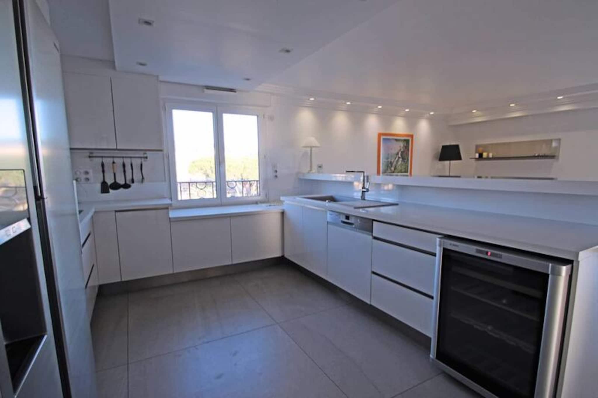 This spacious 110m², 4-room apartment offers a luxurious and comfortable stay for up to 7 people. Featuring three well-appointed bedrooms, the apartment boasts a large living room with a cozy sofa, coffee table, and a flat-screen TV, perfect for relaxing or entertaining. The fully equipped American kitchen includes modern appliances such as a US fridge/freezer, dishwasher, oven, microwave, coffee maker, kettle, 3-burner hob, and an electric wine cellar. The master suite, with a double bed (160cm) and private bathroom, offers direct access to the terrace, while the other bedrooms provide ample storage and comfort. The property is ideally located in the heart of Sainte-Maxime, just 350 meters from the city center and 250 meters from the beach, making it a prime spot for both relaxation and exploration. Shops are conveniently located just 50 meters away, while the residence’s swimming pool provides a refreshing escape. Guests will also appreciate the stunning river and sea views from the large 28m² terrace, which features garden furniture, perfect for outdoor dining or simply enjoying the surroundings. Additional amenities include a laundry room with a washing machine and a second refrigerator, air conditioning throughout, and Wi-Fi for added convenience. The apartment also comes with a private underground parking space, ensuring easy access for guests. The property is non-smoking, and pets are not allowed. The residence’s pool is available from May to October, providing an excellent place for relaxation during the warmer months.