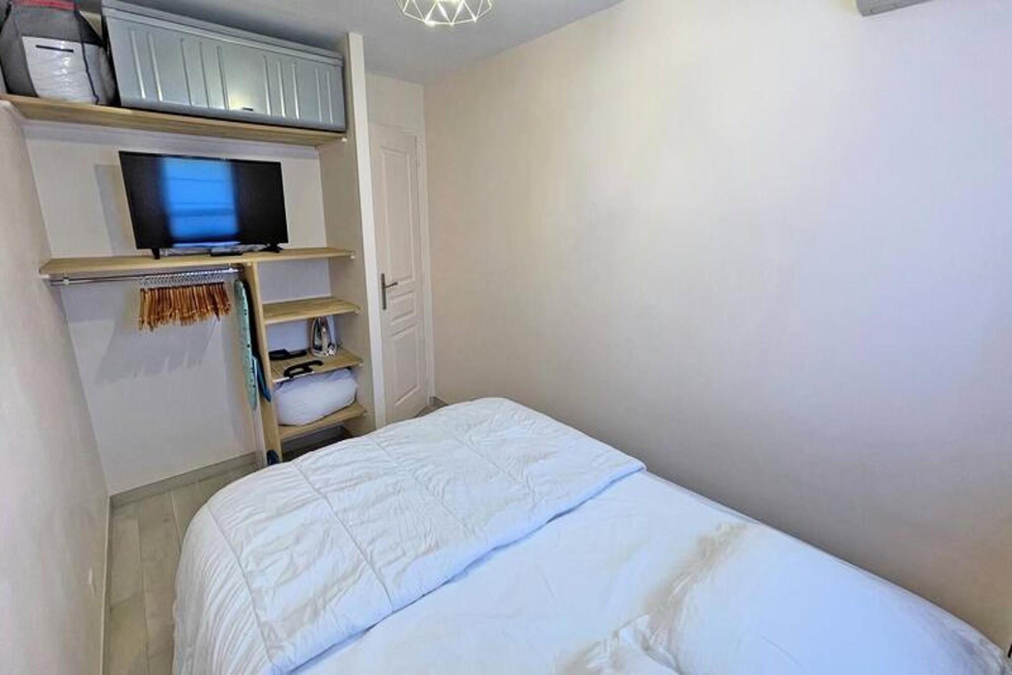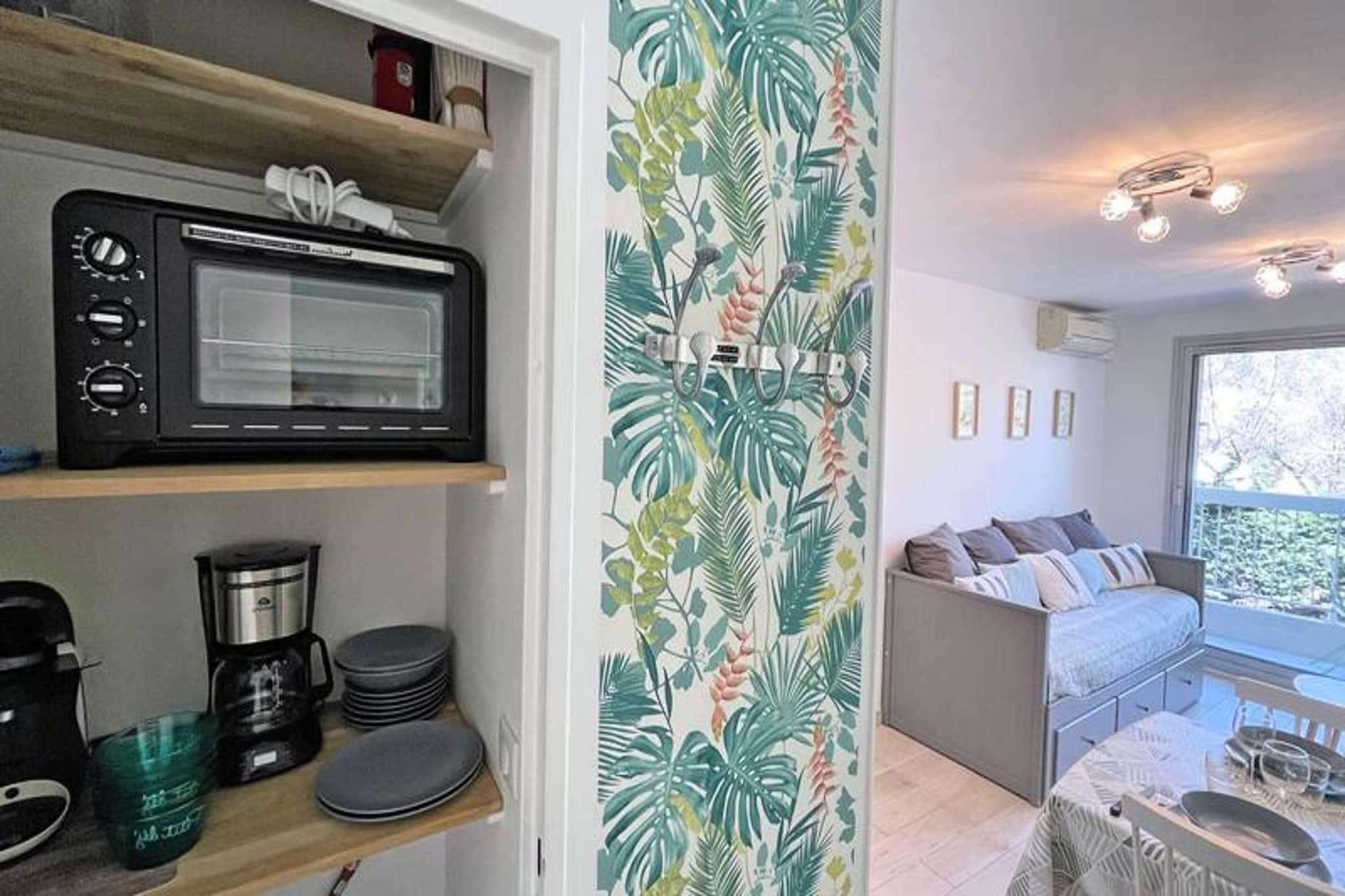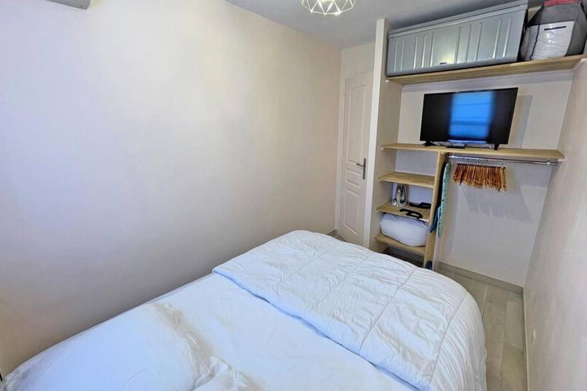 This cozy 27m² apartment on the 1st floor of Résidence Golfe Bleu is ideal for up to three guests. It features a living room with an air-conditioned seating area, a convertible sofa bed (80cm), a TV, and a dining table with balcony access. The kitchenette is equipped with a mini-oven, microwave, 2-burner induction hob, Tassimo coffee maker, and a small refrigerator with a freezer compartment. The bedroom includes a 140cm double bed, storage space, air conditioning, and a TV. The apartment also offers a bathroom with a shower and washing machine, along with a separate WC. The 3m² balcony is perfect for enjoying meals outdoors, and a private parking space is provided in the residence, though access through a tunnel may be tight for large vehicles. Located in the city center, it’s just 400m from the beach and 200m from shops, making it an excellent choice for exploring on foot. The apartment offers air conditioning and WiFi but does not allow pets. Additional conveniences include secure parking, essential kitchen amenities, and proximity to local attractions. Ideal for a relaxing getaway, this apartment combines comfort and practicality in the heart of Sainte-Maxime.