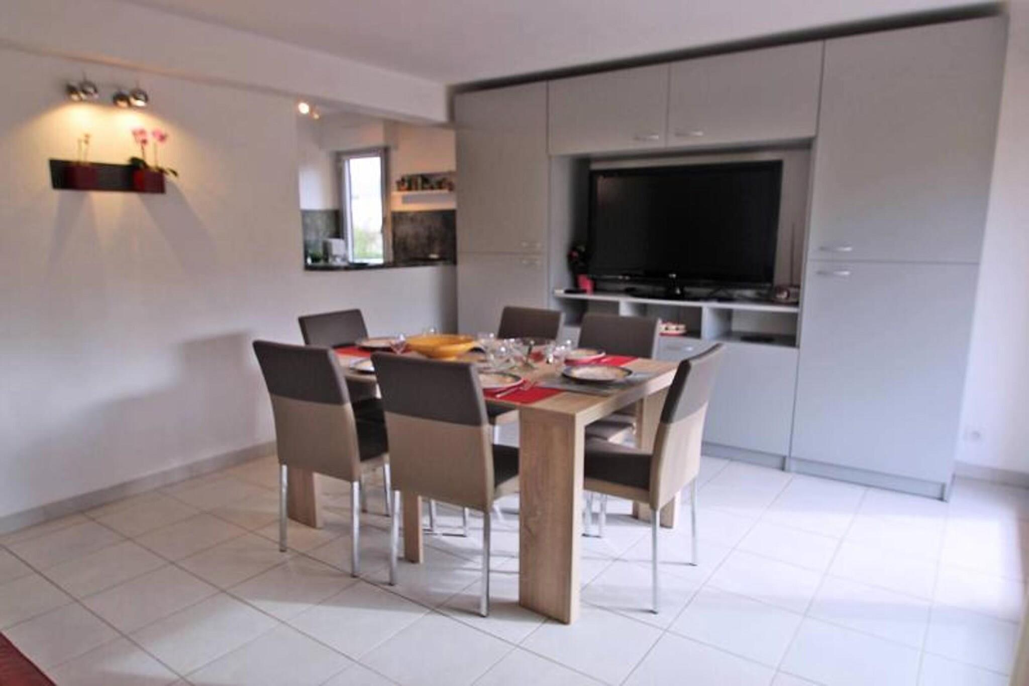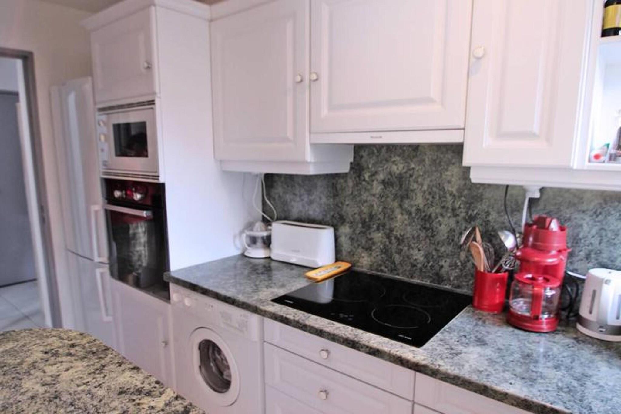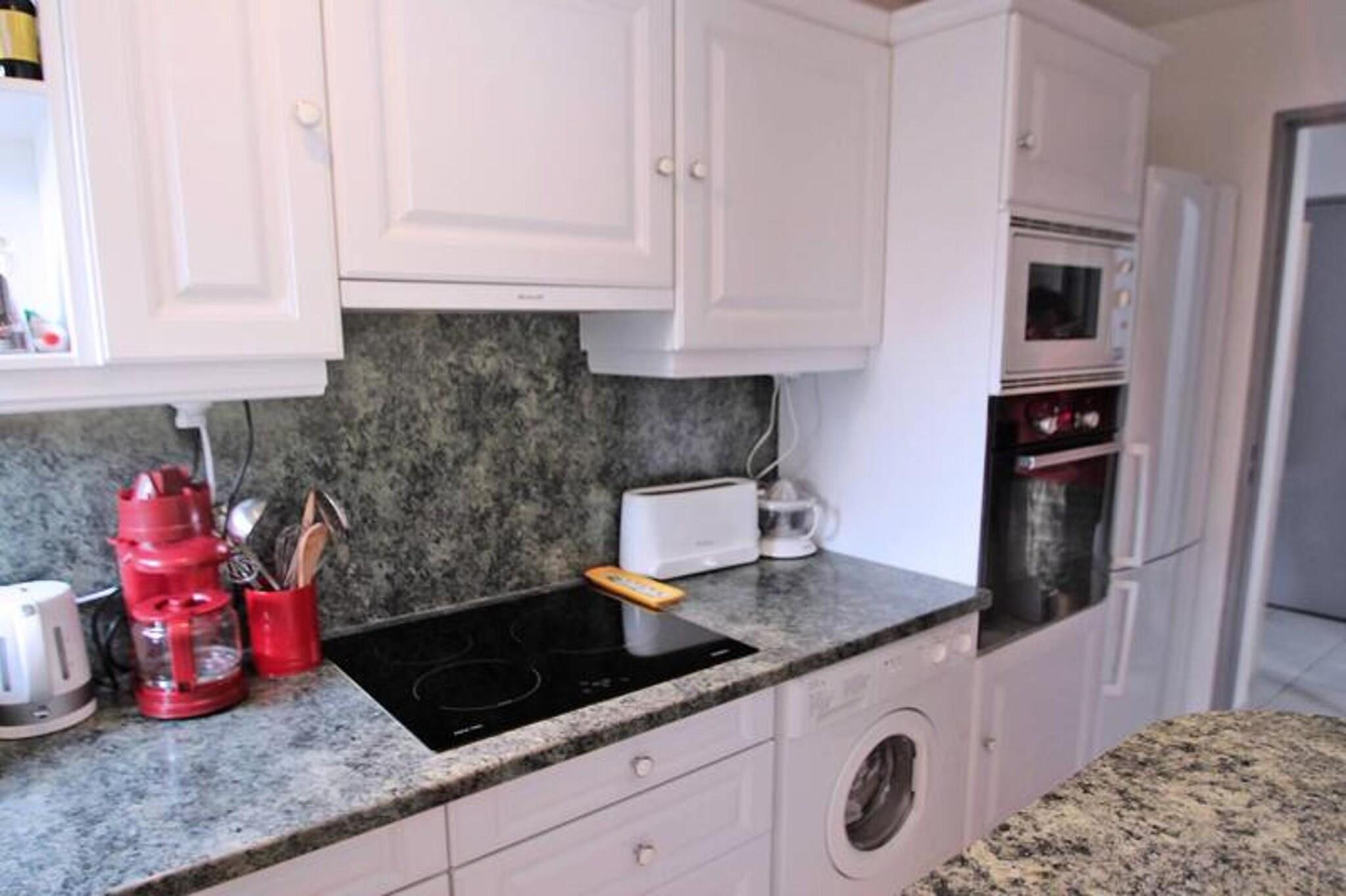 This spacious 49m² apartment, located on the 1st floor of a secure residence with an elevator, can accommodate up to 6 guests. The air-conditioned living room features a "rapido" convertible sofa (140 cm), a dining table with 6 chairs, a flat-screen TV, and direct access to the terrace. The semi-open kitchen is fully equipped with modern amenities, including a refrigerator, freezer, oven, microwave, coffee maker, kettle, toaster, 3-burner hob, dishwasher, and washing machine. The apartment offers two bedrooms: one with a 160 cm double bed and a wardrobe, and the second with a 140 cm BZ sofa bed and a 1x90 bunk bed, both with storage space. The bathroom has a shower, vanity unit, and a separate WC. Conveniently located just 600 meters from the city center and 500 meters from the beach, this apartment is close to all essential shops, located only 100 meters away. Guests can enjoy the secure residence's swimming pool (closed from October to May) and private parking space. The west-facing terrace (11m²) is perfect for relaxing, featuring garden furniture, an electric plancha, and an awning. The apartment offers an unobstructed view, making it a tranquil retreat while being within walking distance of local attractions. The apartment is well-equipped for family stays or groups, with air conditioning in the living room and WiFi for added convenience. Its central location allows guests to explore Sainte-Maxime’s vibrant area on foot. However, it is not suitable for wheelchairs, so those with mobility issues may want to consider other options. Note: Double bed linen: EURO25/bed/living room (beds not made) Single bed linen: EURO20/bed/living room (beds not made) Single towel set: EURO15/person/stay
