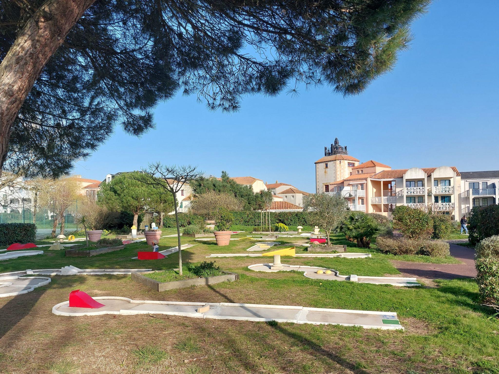 Resort "Les résidences de Port Bourgenay". In the district of Port Bourgenay 6 km from the centre of Talmont Saint Hilaire, excellent location: right in the centre but still quiet, 1.1 km from the sea, 2.6 km from the beach, in a cul-de-sac, in the countryside, on the golf course. For shared use: property 6 ha with lawn and plants, 2 swimming pools heated (seasonal availability: 25.Apr. - 13.Sep.). Shower/WC in the pool area, tennis, children's playground. In the complex: restaurant, bar. Parking. E-charging station. Shop, bicycle rental 900 m, bus stop 500 m, sandy beach "du Veillon" 2.6 km. Sports harbour 1.1 km, golf course (18 hole) 150 m, tennis, minigolf 500 m, walking paths from the house 10 m, cycle lane 100 m. Nearby attractions: Aquarium de Vendée 2 km, La Guittière (Zone naturelle protégée) 10 km, Les Sables d'Olonne 12 km, Zoo 12 km, Ile de Noirmoutier, Puy du Fou 85 km, La Rochelle-Ile de Ré 90 km. Hiking paths: GR8 (sentier côtier balisé) 1 km. Please note: suitable for families.