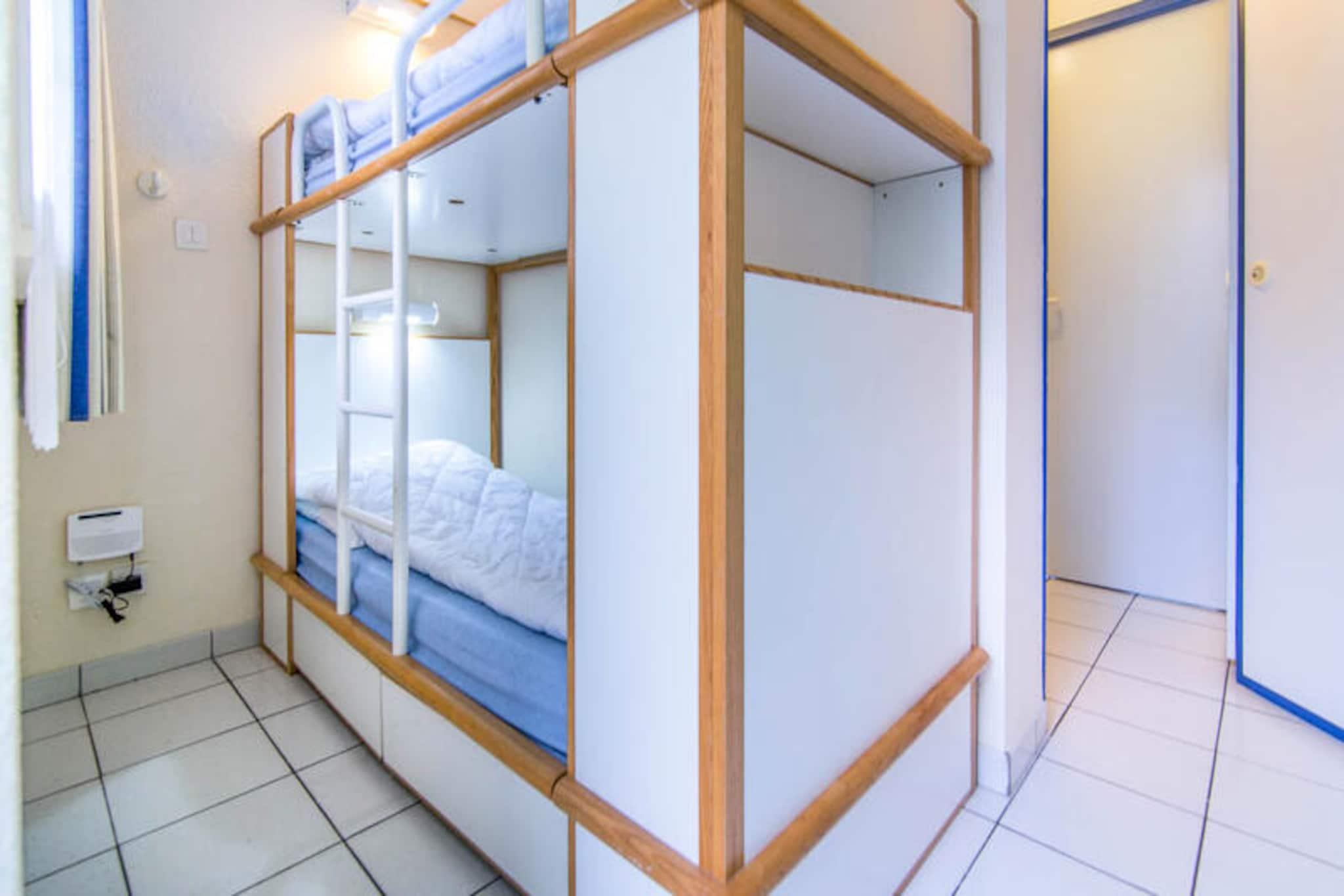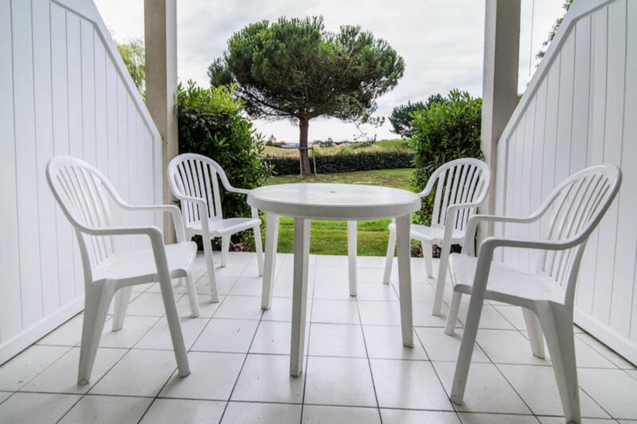This charming apartment, located on the ground floor, accommodates up to 5 people and features a furnished terrace facing south-east with views of the park and a small lake. It includes a living room with two sofa beds, one with a trundle bed, and a cabin area with a bunk bed. The apartment also has a dining area with a table and four chairs. Pets are allowed with prior inquiry, and a baby kit is available on request. Bed linens and towels are available for an additional charge, and there is a mandatory cleaning service at the end of your stay. The residence is set in a stunning 90-hectare estate surrounded by a pine forest and directly overlooking a tranquil lake. It’s only 2.5 km from Veillon Beach, which you can access by foot, bike, or a shuttle service. The area offers many activities, including two 18-hole golf courses, tennis, mini-golf, and a heated aquatic area with slides. Nearby shops include a pizzeria, bakery, and bar, while the center of Seignosse is just 200 meters away, with various cafes, markets, and attractions. Inside, the apartment features a fully equipped kitchen with a microwave, stove, and refrigerator, open to the living room. The bathroom includes a bathtub and a toilet, and there’s plenty of storage space throughout. Guests can enjoy free parking within the residence and access to the three swimming pools, available from April to September, with additional amenities like wifi and bed linen available for an extra fee.