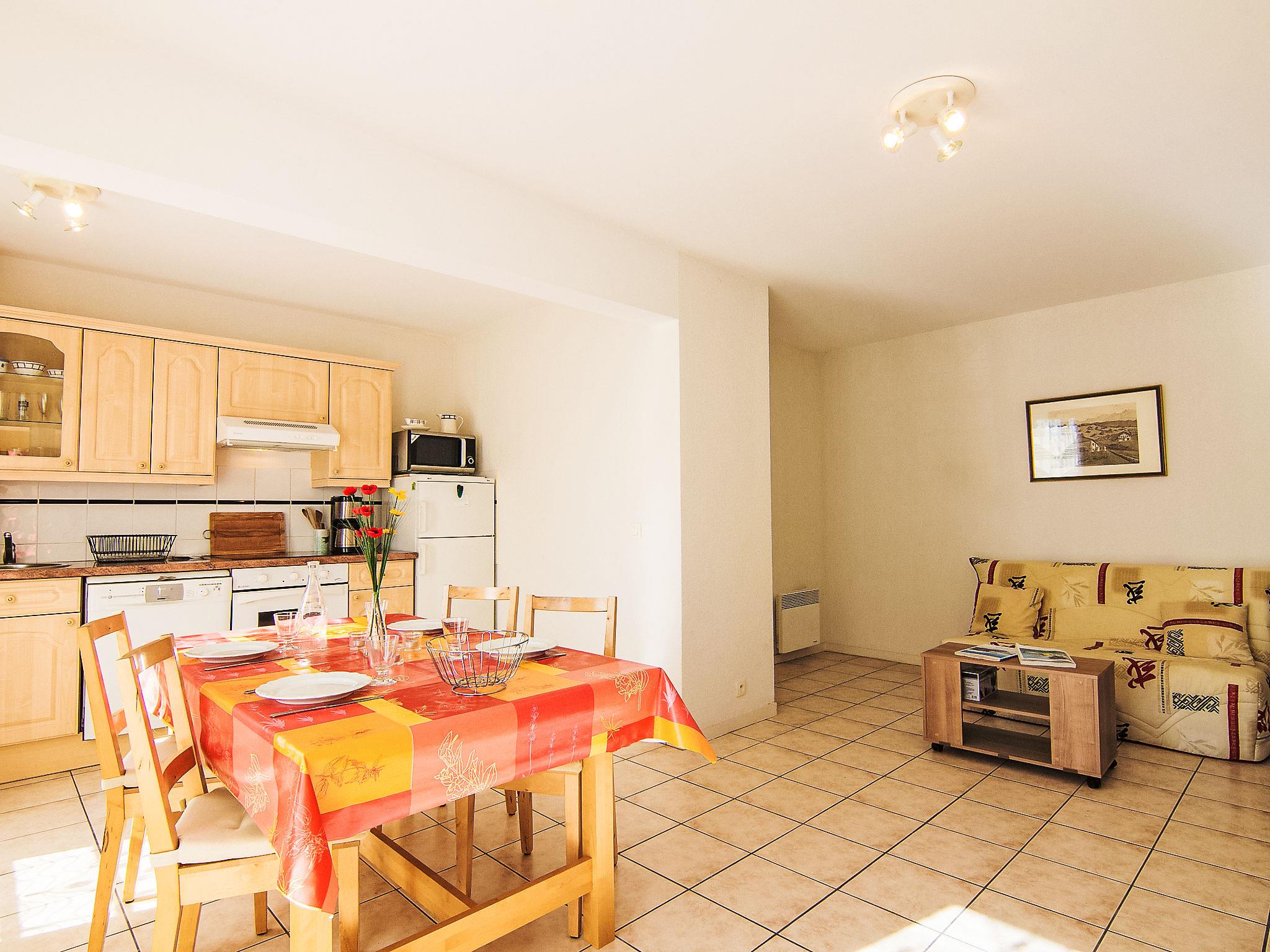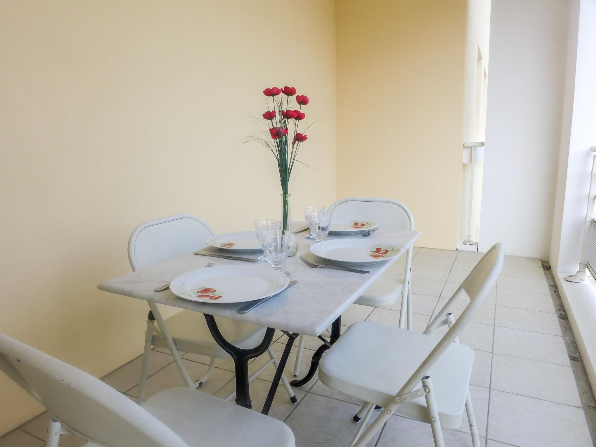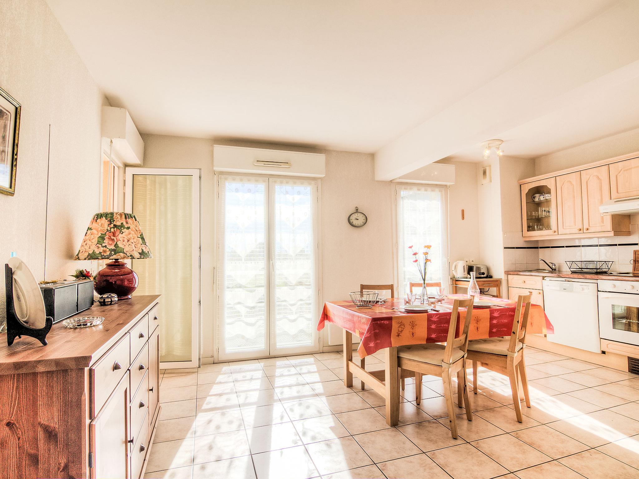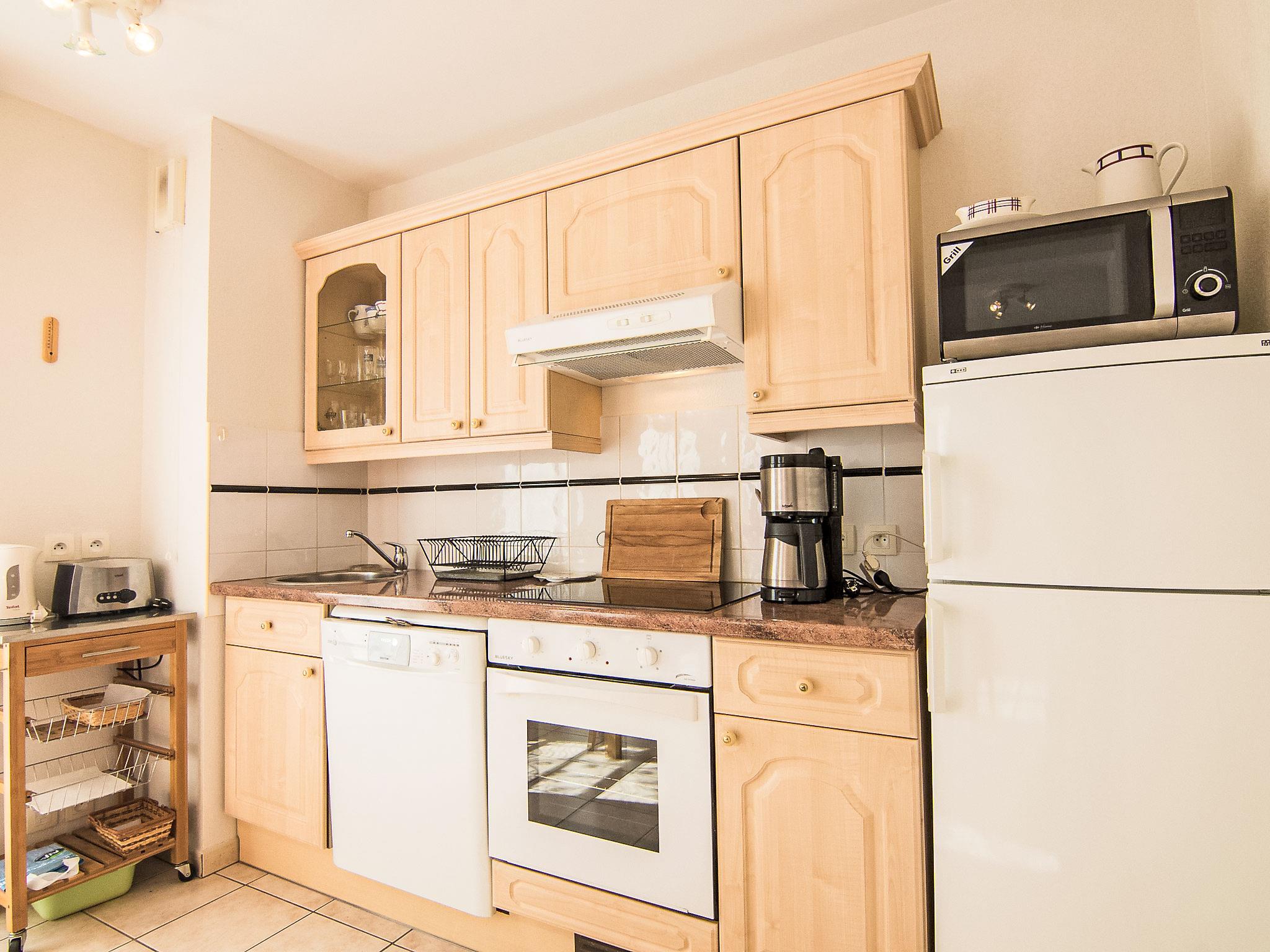 2-room apartment 49 m2 on 1st floor. Beautiful furnishings: living/dining room with 1 double sofabed (140 cm), TV and radio. Exit to the terrace. 1 room with 1 french bed (1 x 140 cm). Open kitchen (oven, dishwasher, 2 ceramic glass hob hotplates, 2 induction hot plates, microwave, electric coffee machine). Bathroom, sep. WC. Electric heating. Terrace 9 m2. Terrace furniture. Facilities: washing machine. Internet (WiFi, extra). Parking space n 32. Please note: smoke alarm.
