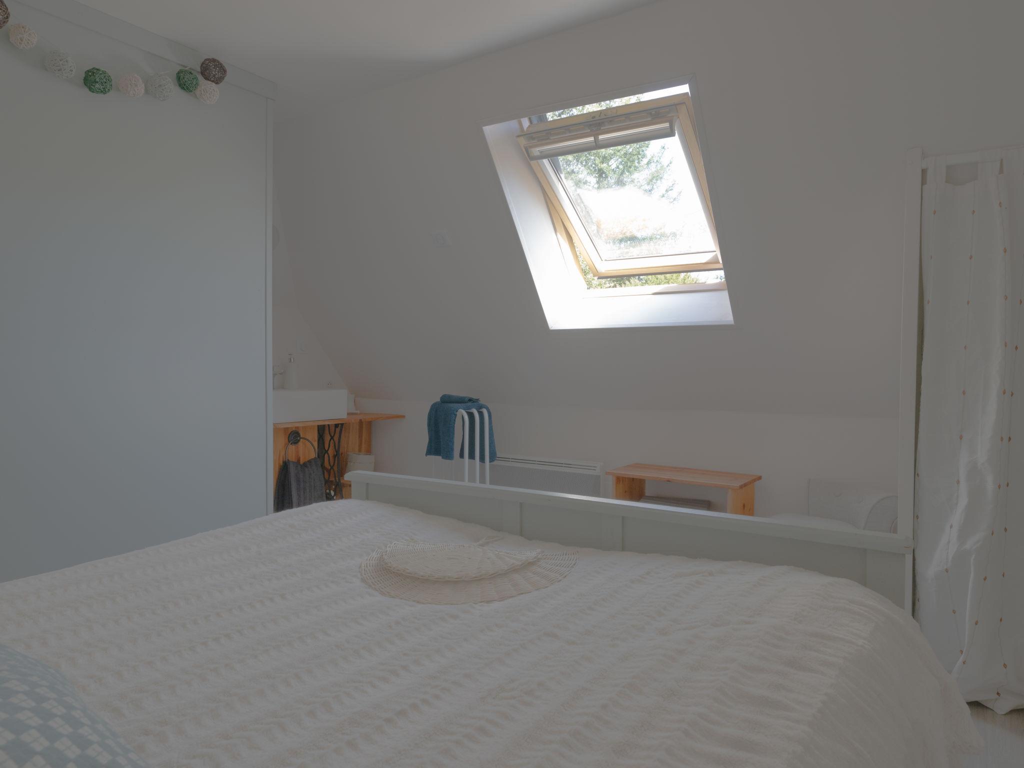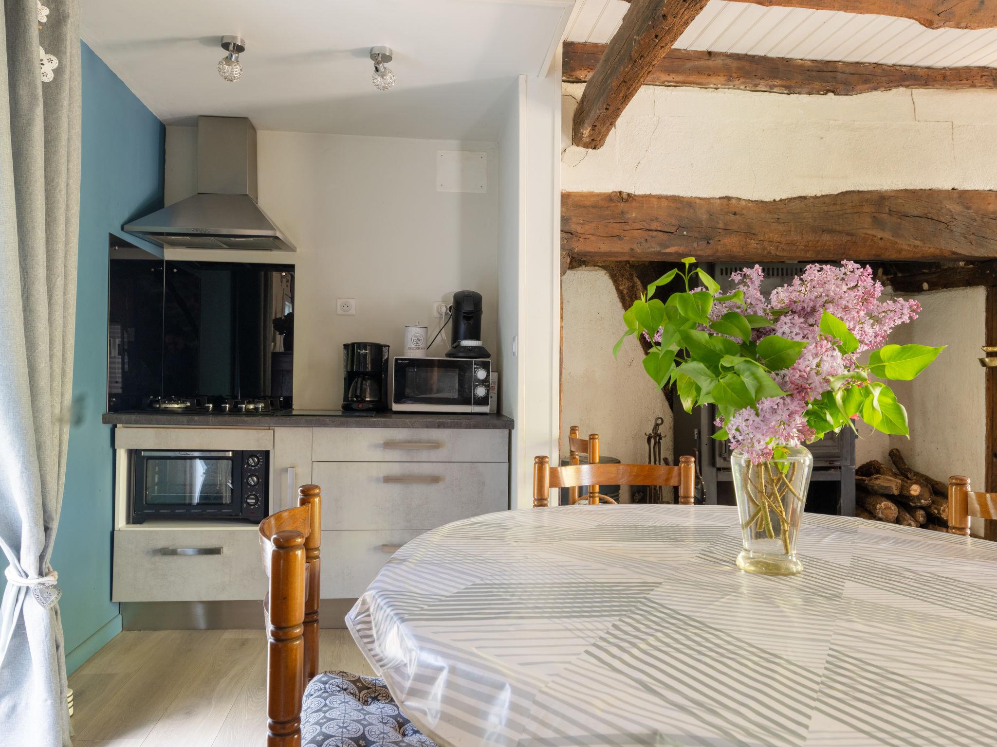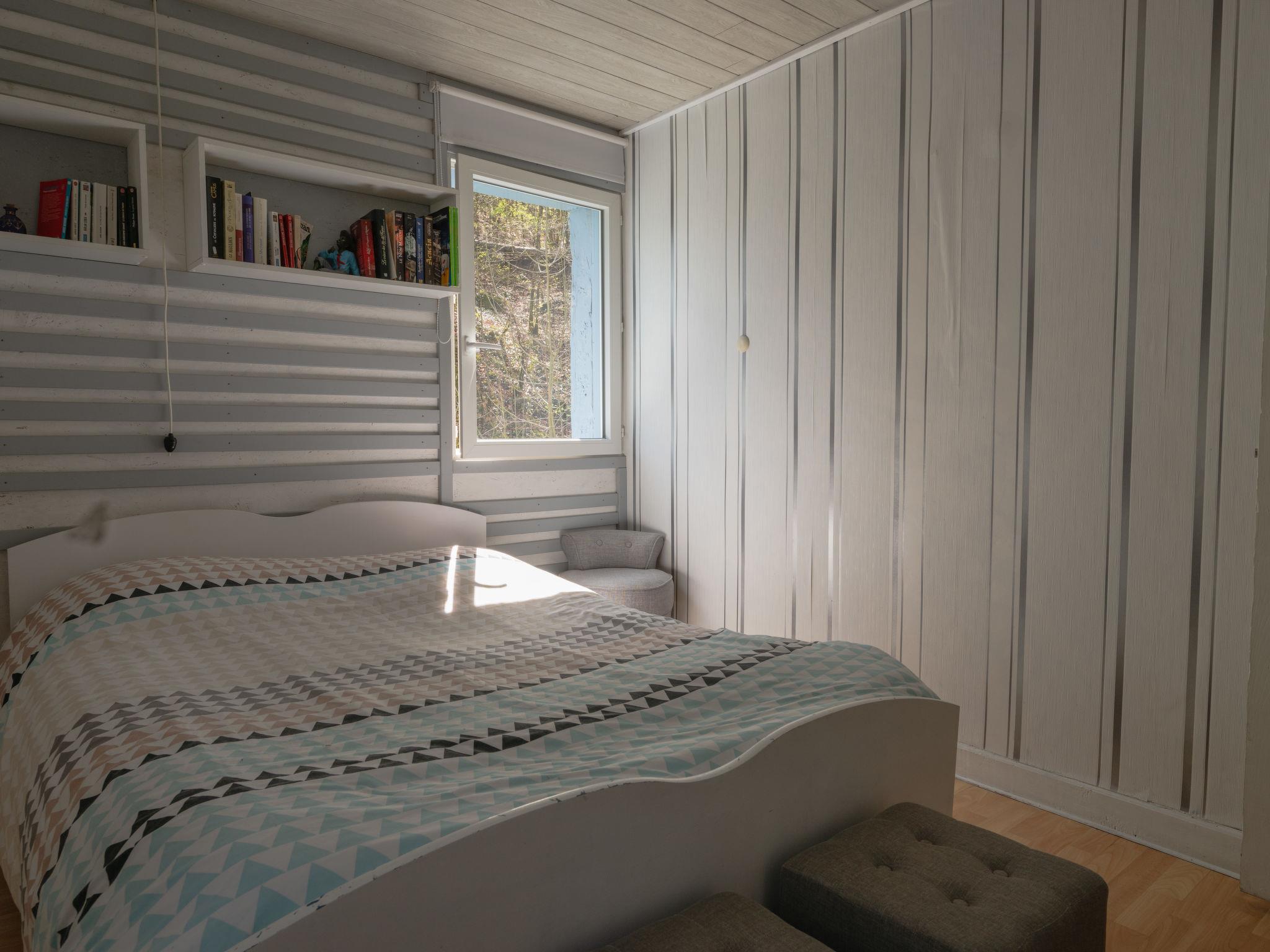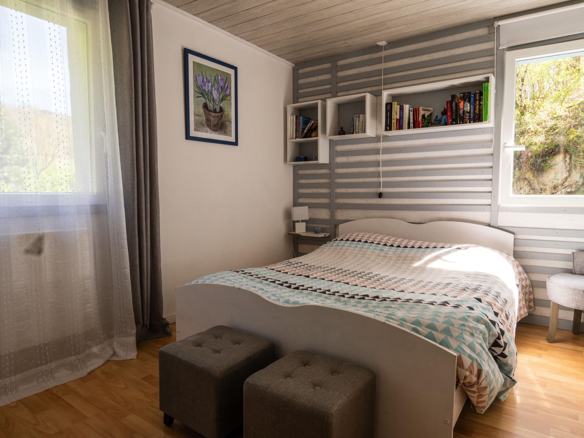 3-room house 80 m2 on 2 levels. Beautiful furnishings: living/dining room with Scandinavian wood stove, dining table and TV (flat screen). Exit to the garden, to the balcony. 1 room with 1 french bed (140 cm, length 190 cm). Open kitchen (mini-oven, 4 gas rings, toaster, kettle, microwave, freezer, electric coffee machine, Capsules for coffee machine (Senseo) extra). Shower, sep. WC, double hand-basin. Upper floor: (steep stair) lounge with sloping ceilings. 1 room with sloping ceilings with 1 french bed (140 cm, length 190 cm), shower/WC. Electric heating, wood heating. Small balcony, 2 small terraces. Terrace furniture, barbecue, deck chairs (2). Beautiful view of the river. Facilities: washing machine, iron, hair dryer, logs (free). Please note: not suitable for small children. Non-smoking house. Maximum 2 pets/ dogs allowed. Smoke alarm. Offer by a private individual according to Art. 155, IV of CGI.