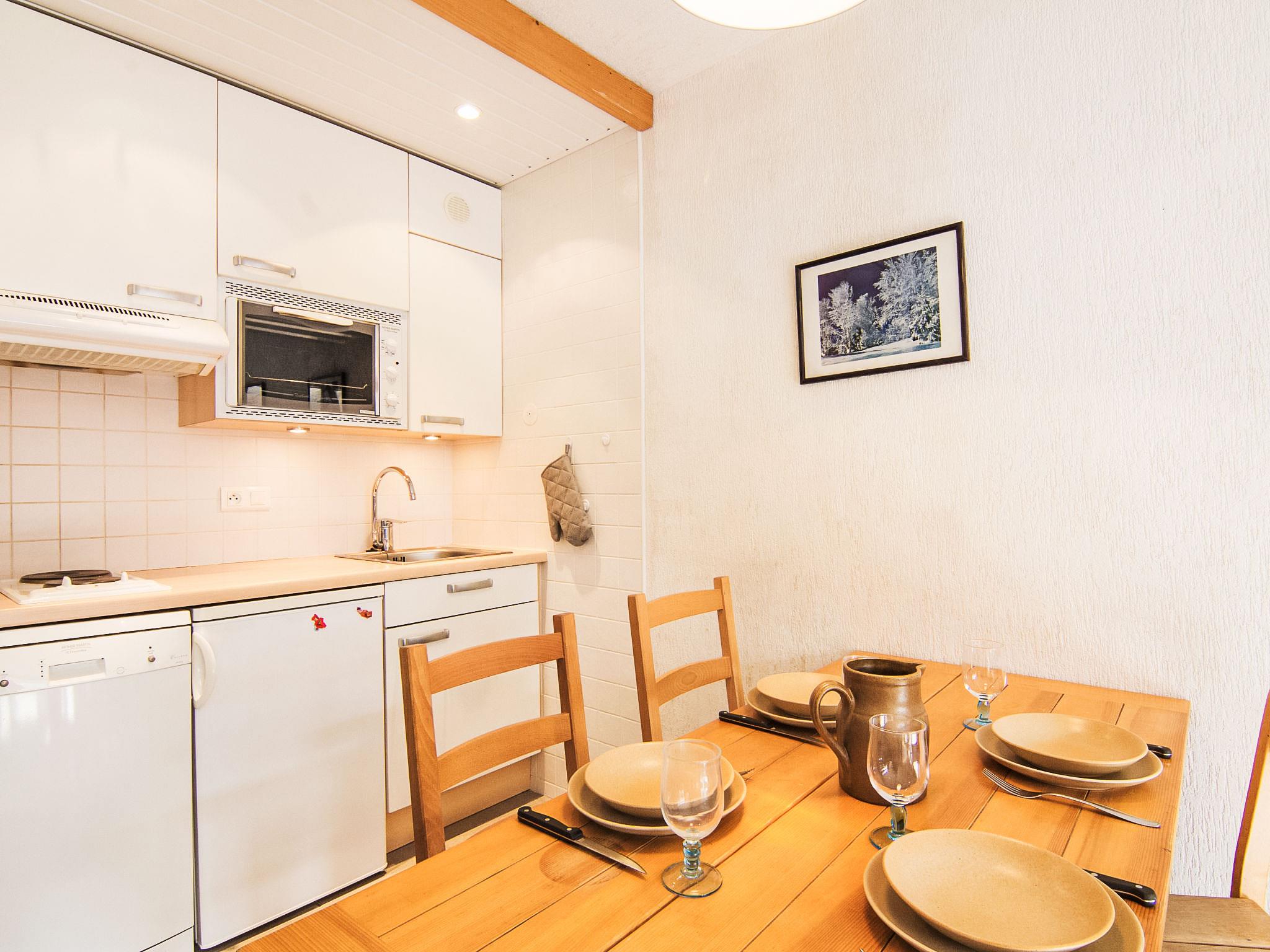 "Grandes Platières II", 1-room apartment 27 m2 on 2nd floor. Bright, practical and beautiful furnishings: living/dining room with 1 pull-out bed (2 pers. 2 x 80 cm), bath/WC and TV. Entrance hall with 1 x 2 bunk beds (80 cm). Kitchenette (2 hot plates, mini-oven, dishwasher, microwave). Balcony, south facing position. Beautiful view of the mountains. Facilities: Internet (WiFi, extra). Please note: non-smokers only. Smoke alarm. FR7351.370.10