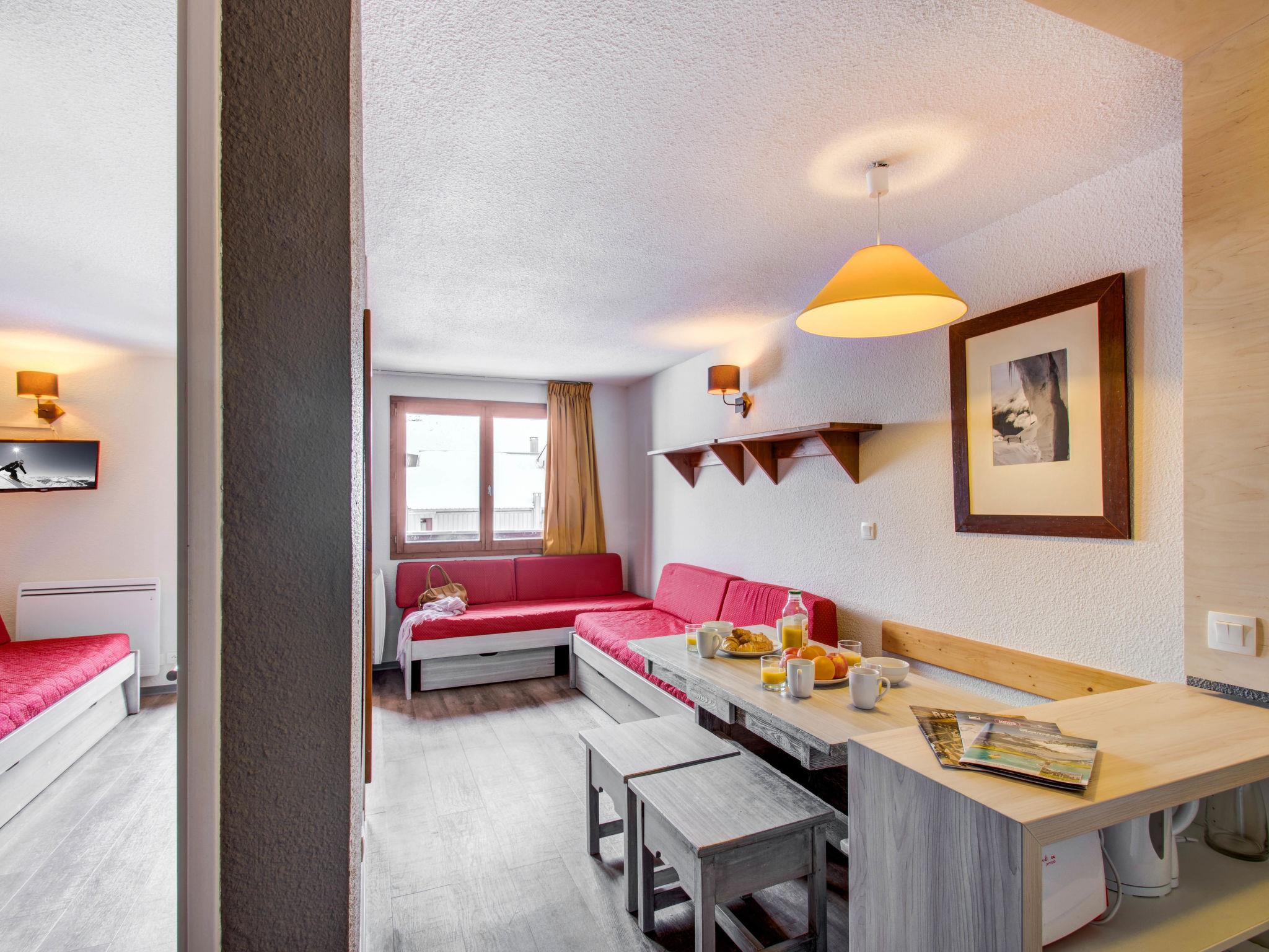 "Le Hameau du Borsat IV", 1-room studio 26 m2. Modern and cosy furnishings: living/sleeping room with 1 bed and 1 pull-out bed (2 pers.), dining table and TV. Alcove with sliding door with 1 pull-out bed (2 pers.). Kitchenette (4 hot plates, dishwasher, toaster, kettle, microwave, electric coffee machine). Bath/WC. Electric heating. Balcony. Beautiful view of the mountains. Maximum 1 pet/ dog allowed. Instead of an enclosed bedroom, some sleeping areas are located in an open-plan area (gallery, alcove, etc.).