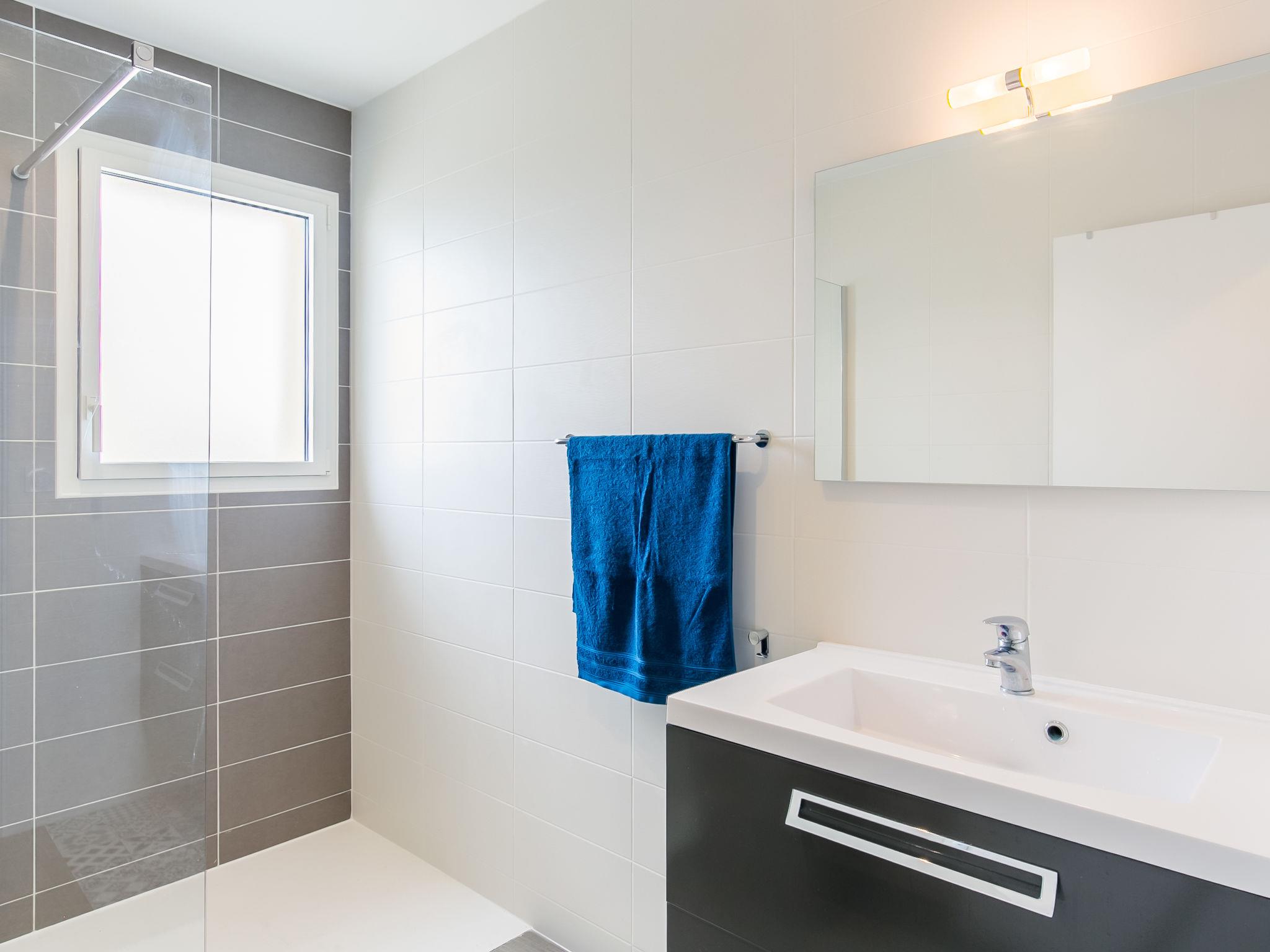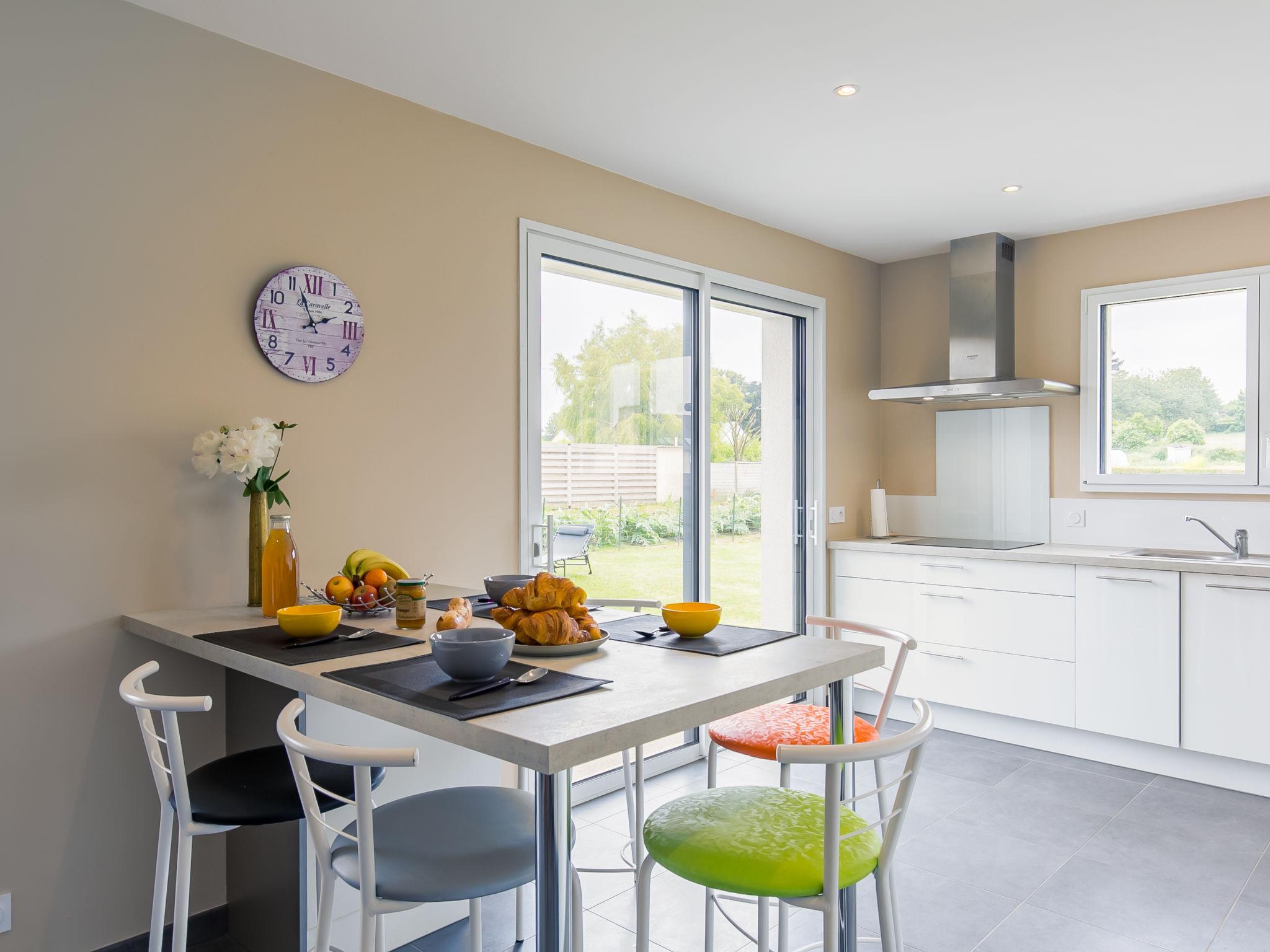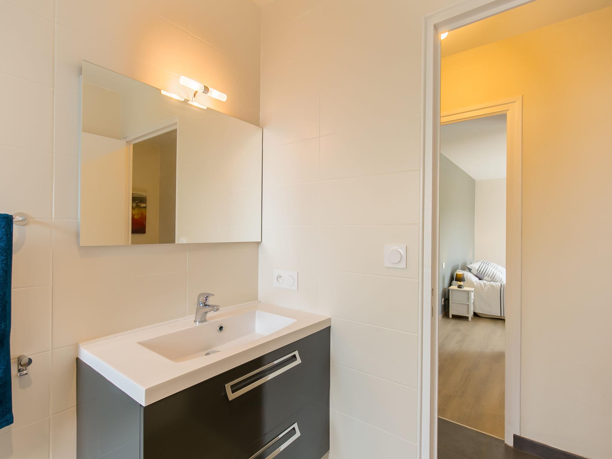 "Terre et Mer", 4-room house 110 m2. Bright, modern furnishings: living/dining room with dining table and TV. Exit to the terrace. 1 room with 1 french bed (160 cm, length 200 cm), shower/WC. 1 room with 1 french bed (140 cm, length 190 cm). 1 room with 2 beds (90 cm, length 190 cm). Open kitchen (oven, dishwasher, 3 induction hot plates, toaster, kettle, microwave, freezer, electric coffee machine) with dining table. Exit to the terrace. Shower, sep. WC. Heating. Terrace. Terrace furniture, barbecue (portable), deck chairs (3), box-room. Facilities: washing machine. Internet (WiFi, free). Please note: non-smoking house. Smoke alarm.