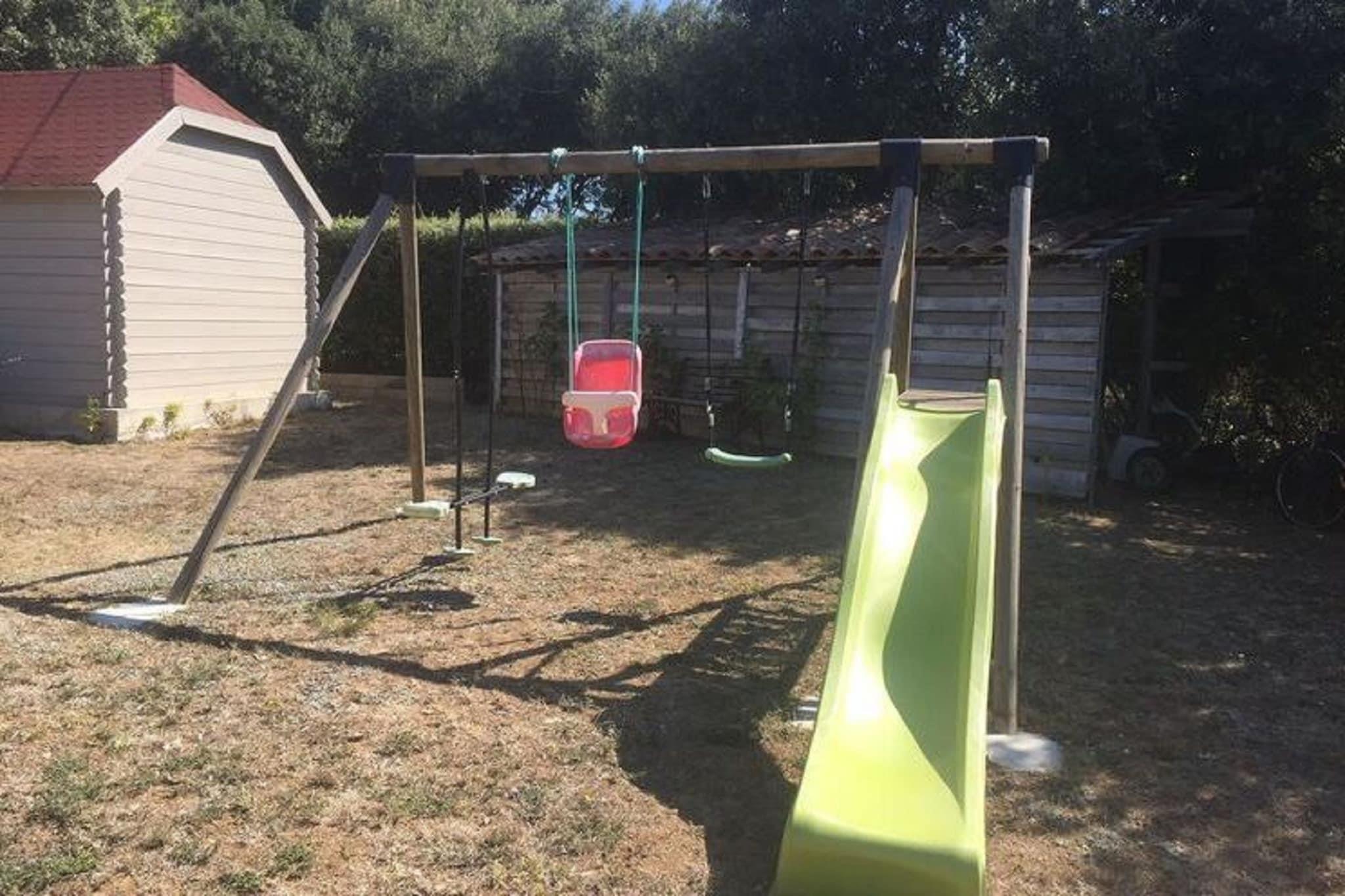 Ground floor: (open kitchen(electric kettle, toaster, cooker, hood, coffee machine, oven, combination microwave, dishwasher, fridge-freezer), Living/diningroom, Bedroom with bathroom(double bed(160 x 200 cm), shower(walk-in shower), washbasin, toilet), Bedroom with bathroom(double bed(160 x 200 cm), shower, washbasin, toilet), toilet, sanitary facility(shower, washbasin, toilet), pantry(fridge-freezer, washing machine, ironing board, iron)) On the 1st floor: (bedroom(double bed(160 x 200 cm)), bedroom(bunk bed), mezzanine(double bed(160 x 200 cm))) Bubble bath(outside), garden doors, terrace, garden(private, fenced, 2400 m2), garden furniture, sun loungers, BBQ, parking, swimming pool(private, heatable, 9 x 4 m.), boules court