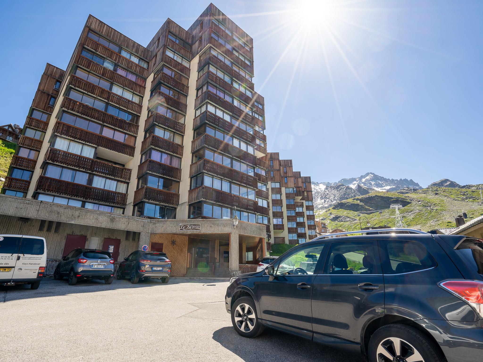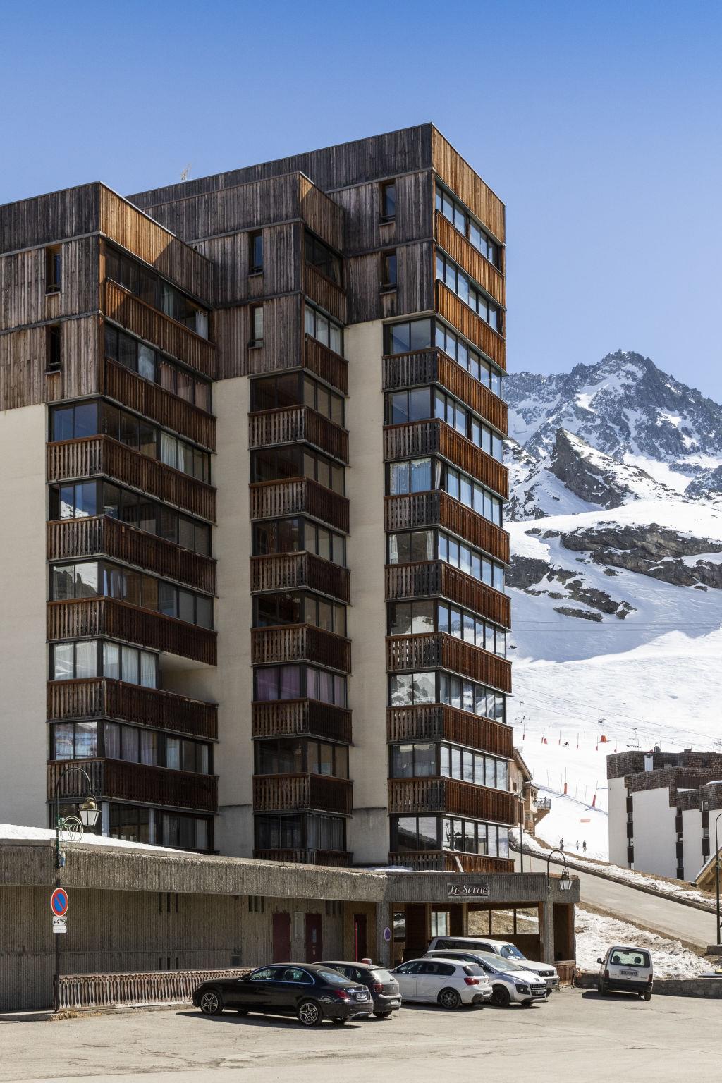 Simple residence "Le Sérac", 10 storeys. Above Val Thorens, in the district of Péclet, in the centre, 800 m from the lake, 50 m from the skiing area. In the house: WiFi (extra). Lift, storage room for skis, central heating system. In Winter: please take snow chains. Public car park at 200 m, extra. Shop 100 m, grocery 150 m, supermarket 150 m, shopping centre 100 m, restaurant 50 m, bar 250 m, bakery 150 m, café 50 m, pedestrian zone 100 m, 5 minute walk to the centre, bus stop "Navette Gratuit" 100 m. Skisport facilities 100 m, slopes 50 m, ski rental, ski bus stop, ski school 150 m, ski-kindergarten 50 m, ice rink, children's playground. Well-known ski regions can easily be reached: 3 Vallées. Well-known lakes can easily be reached: Lac du lou 1 km, Lac Du menuieres 800 m. Please note: entertainment in the season. The owner does not accept any groups. In case of good snow conditions, the house is accessible on skis.